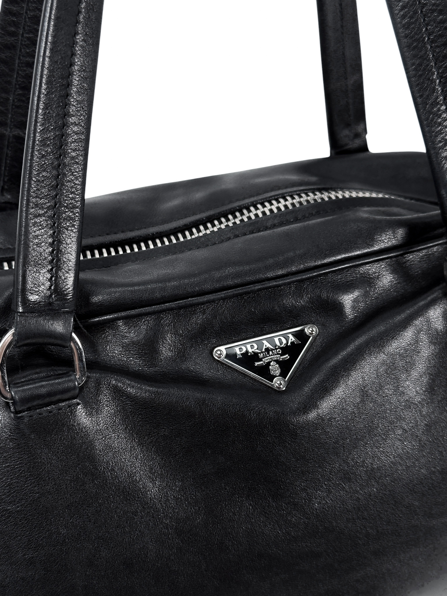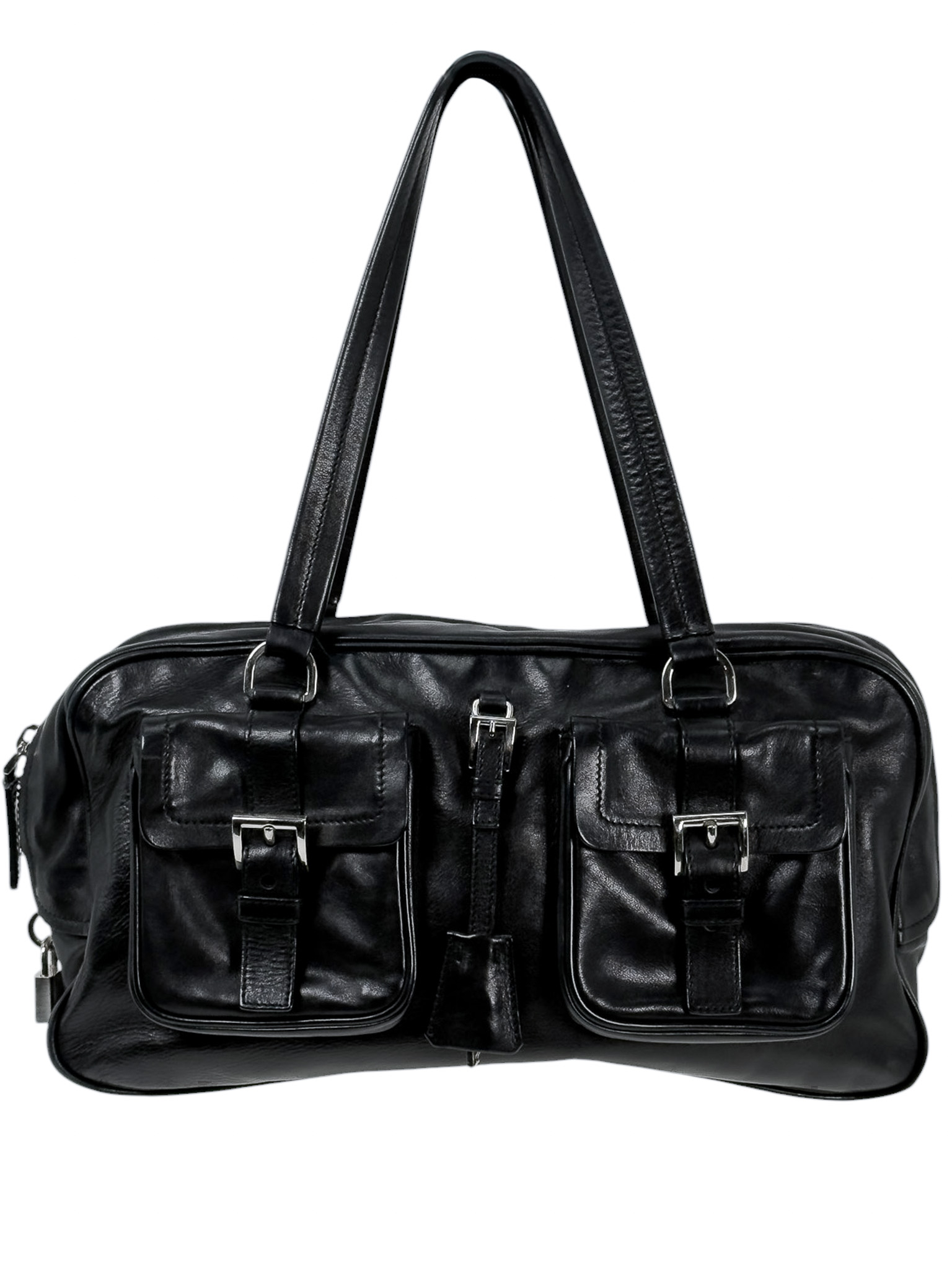 "Czarna skórzana torebka do ręki/ na ramię, prostokątny kształt, miękka skóra, trójkątne logo marki w centralnej części, srebrne okucia, dwie zapinane kieszenie oraz zawieszka z kluczami z tyłu, zapinana na suwak, logowane wnętrze, jedna duża komora z kieszenią, logowana kłódka, w komplecie z workiem przeciwkurzowym. Stan dobry, posiada przetarcia na rogach. szerokość 34cm, wysokość 18cm, głębokość 10cm."