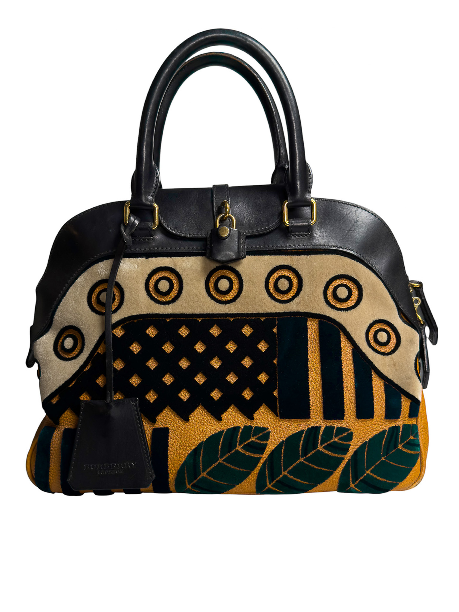 "Czarno pomarańczowa torba wykonana ze skóry z kolorowymi pluszowymi wzorami. Miejscami rysy na skórze i przetarcia na materiale. Wymiary: 36x28x15cm, rączki: 36cm"