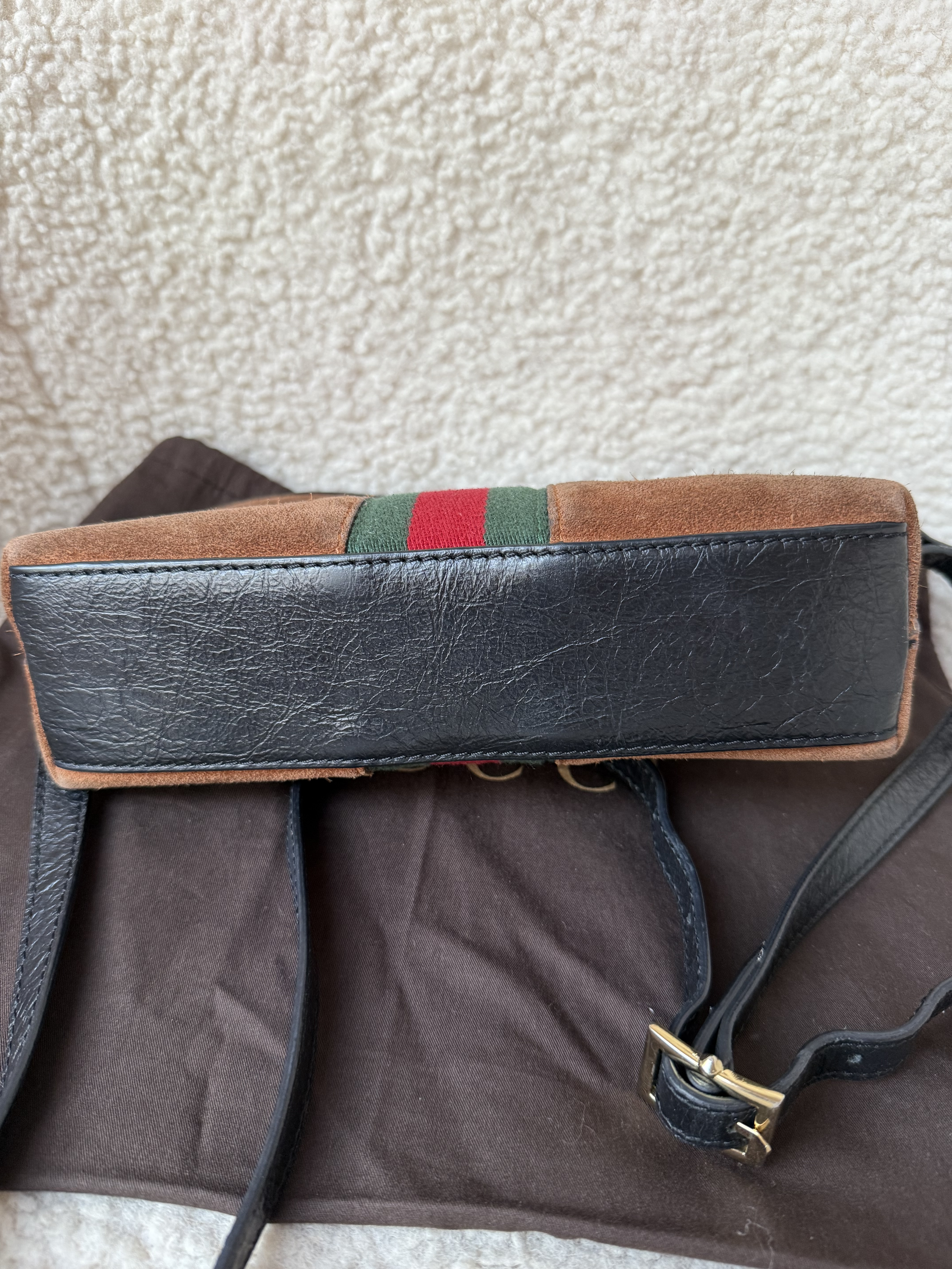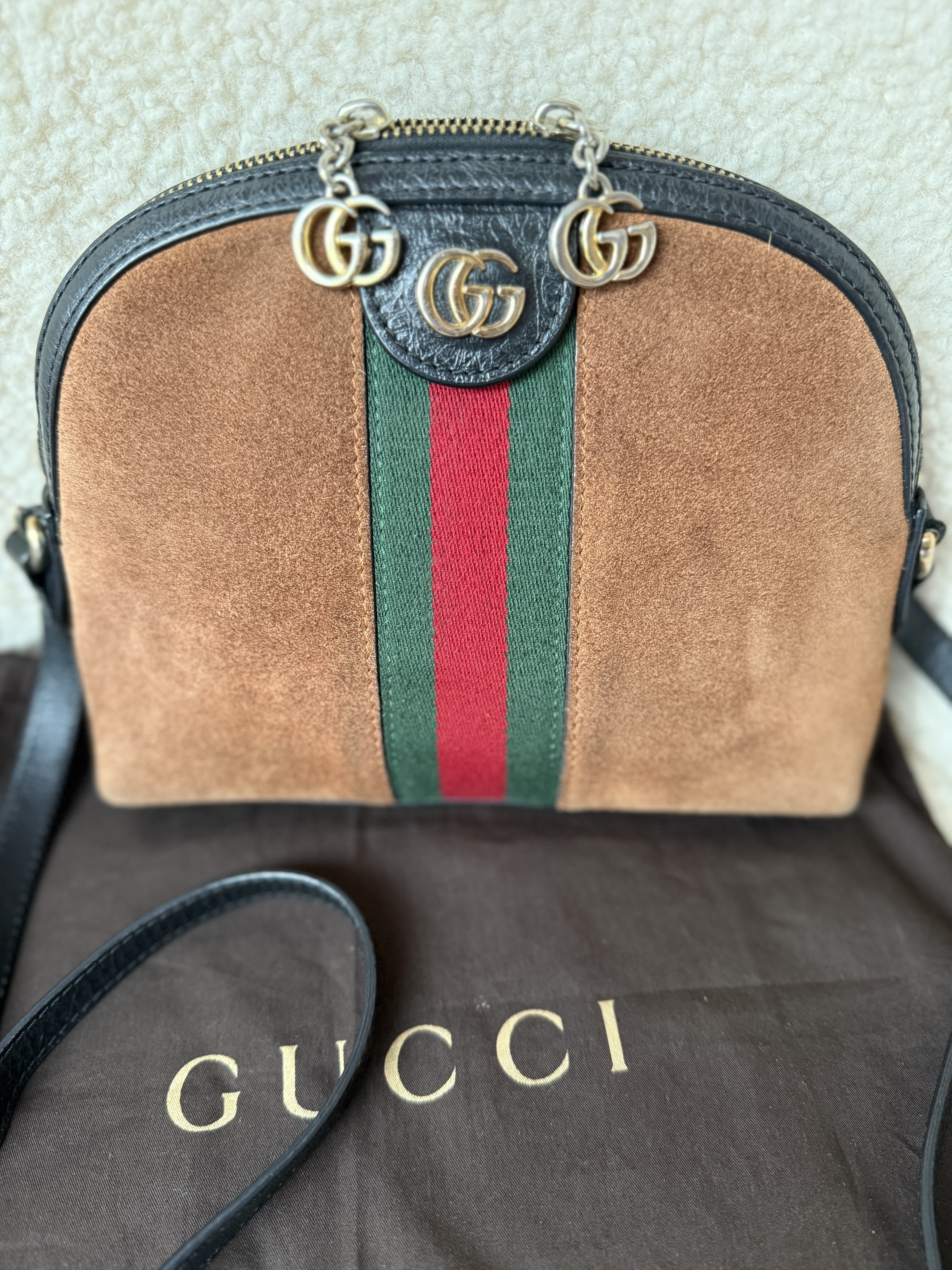 "Ponadczasowa torebka na ramię Gucci Ophidia . Wykonana z zamszu wraz ze skórzanymi detalami. Zapinana na zamek. Wewnątrz atłasowa podszewka z kieszonkami. Numer seryjny wewnątrz torebki. Piękne jesienne kolory . Dosyć pojemna. W komplecie z woreczkiem przeciwkurzowym."