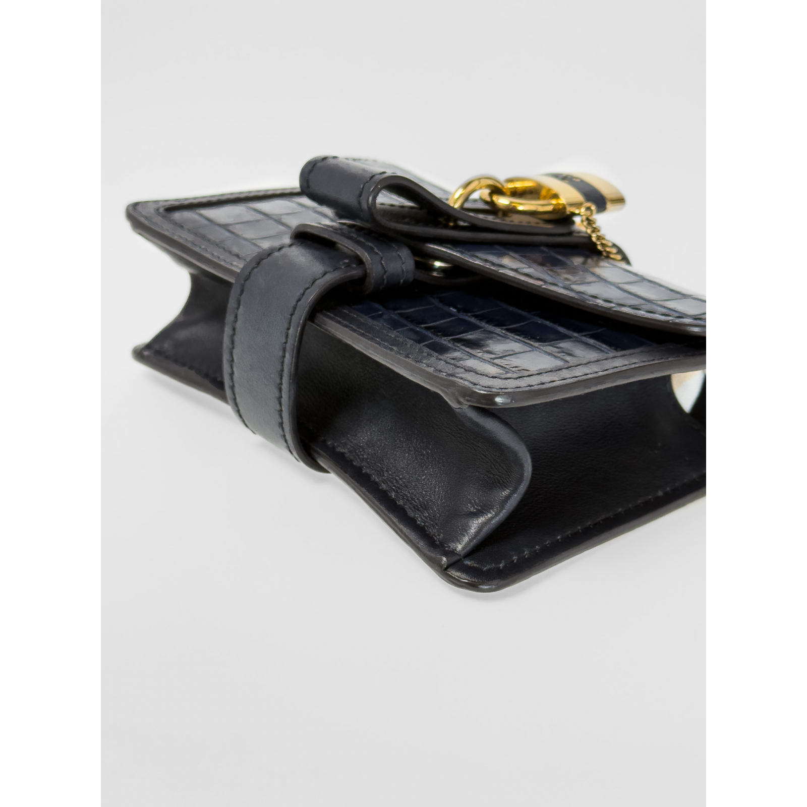 "Model mini Aby. Granatowa skórzana torebka w motyw zwierzęcy, ozdobiona dużą złotą logowaną kłódką z kluczykiem na przodzie, złoty łańcuch na ramię, srebrne zapięcie magnetyczne pod klapą, srebrno-złote okucia, w zestawie z workiem przeciwkurzowym, jedna komora z kieszenią wewnątrz. Stan bardzo dobry, delikatne rysy na zapięciu. Wymiary: 19 cm x 14 cm x 6 cm."