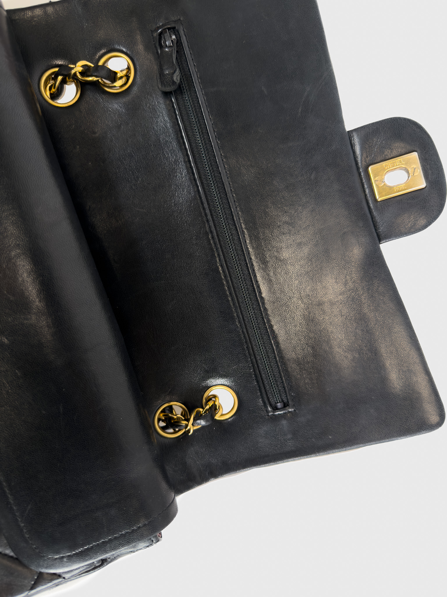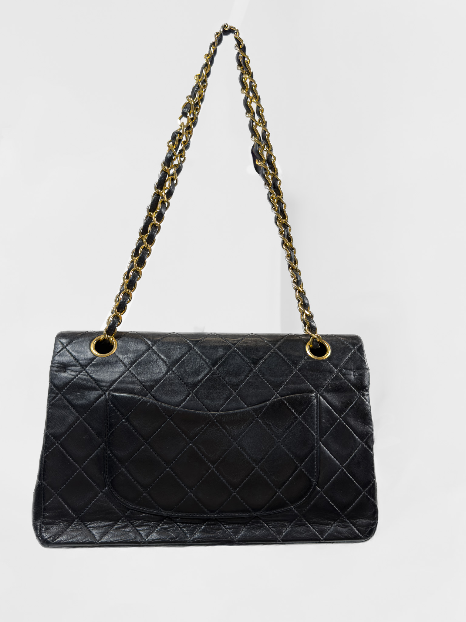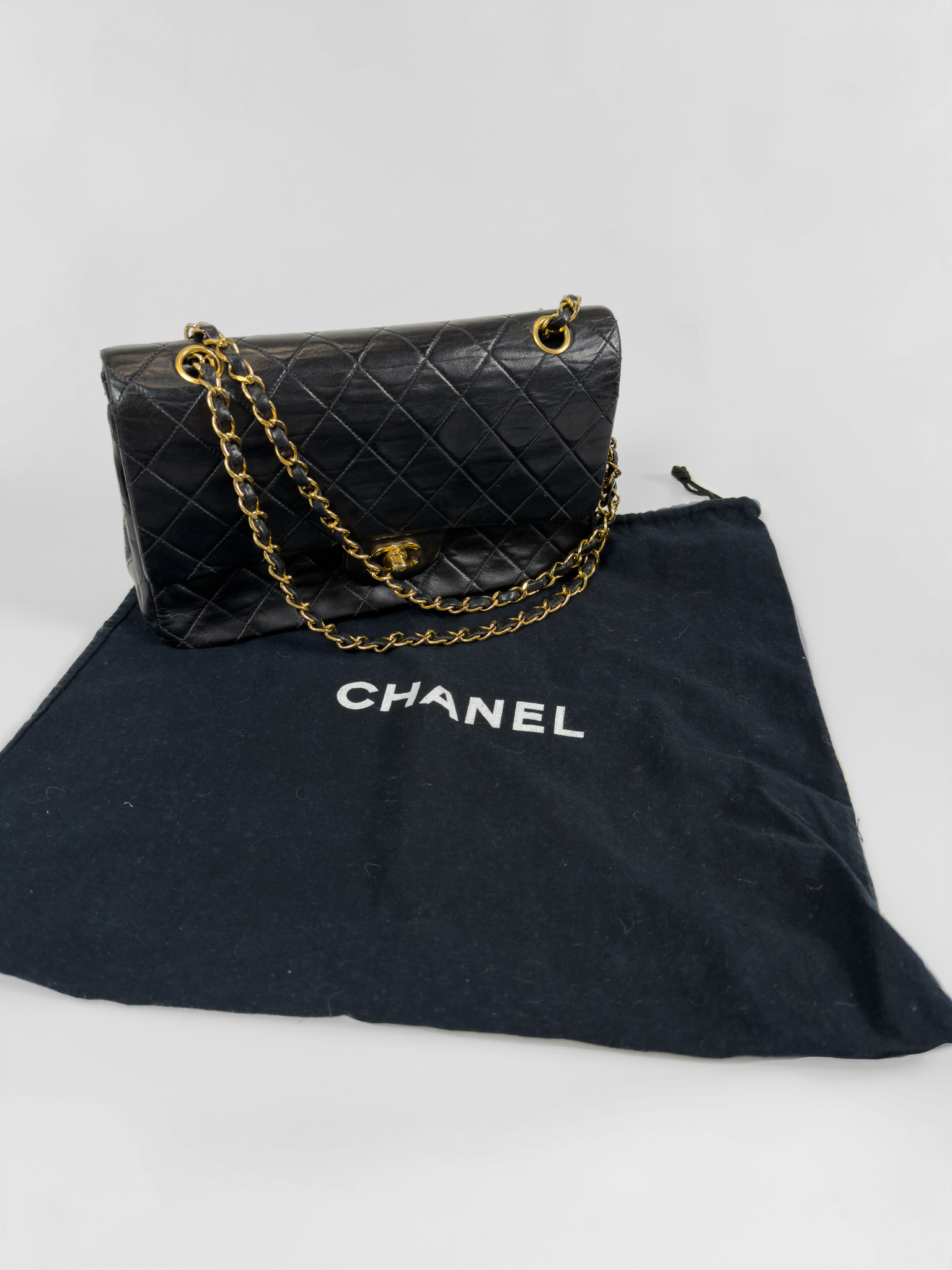 "Czarna skórzana torebka, pikowana diamentowo, złote logo marki w centralnej części, klasyczne zapięcie obrotowe pod klapą, długi pasek na ramię przeplatany skórą i łańcuchem. Jedna główna komora, wewnątrz zasuwana kieszeń oraz otwarta przegroda, kieszeń zewnętrzna z tyłu, lekko porysowana. Stan bardzo dobry – widoczne delikatne zarysowania na rogach oraz przetarcia i ogólne ślady użytkowania. W środku na klapie delikatne zarysowania. W zestawie z workiem przeciwkurzowym. Lata: 189/1991. Potwierdzenie orginalności Entrupy w komplecie. Wymiary: szerokość 26 cm, wysokość 16cm, głębokość 7 cm"