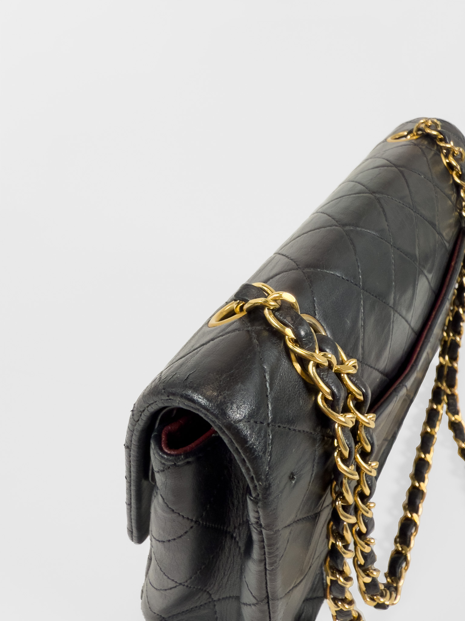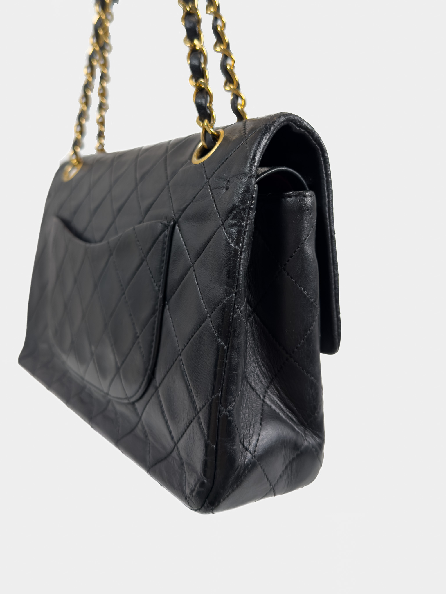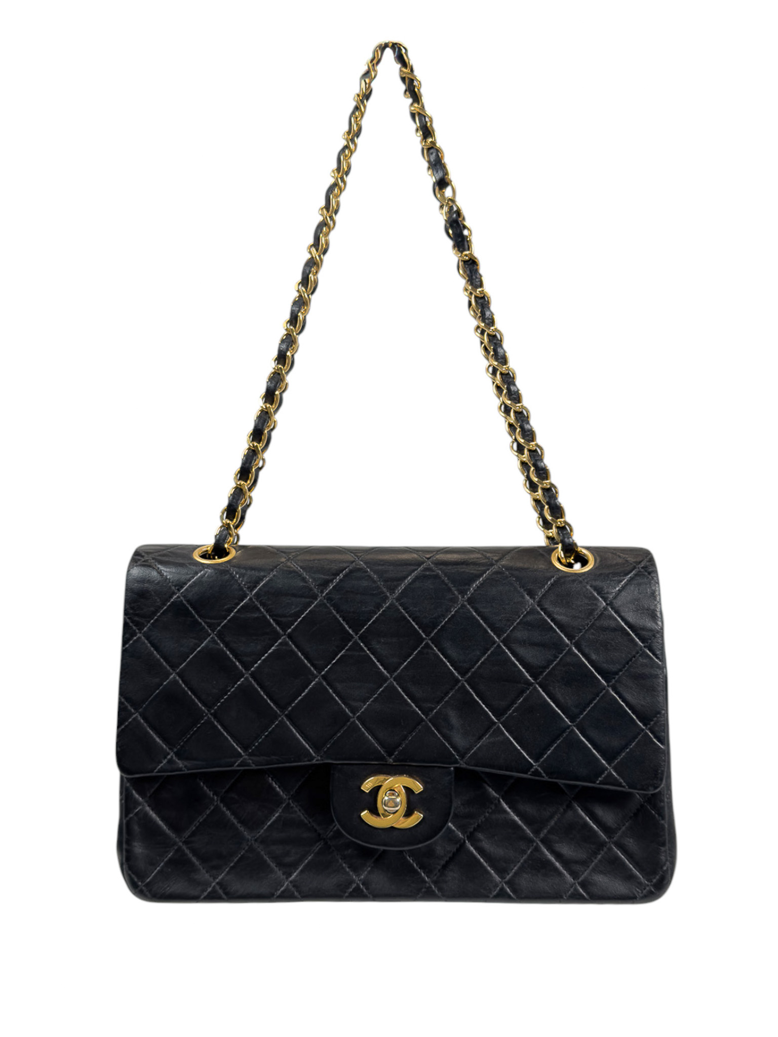 "Czarna skórzana torebka, pikowana diamentowo, złote logo marki w centralnej części, klasyczne zapięcie obrotowe pod klapą, długi pasek na ramię przeplatany skórą i łańcuchem. Jedna główna komora, wewnątrz zasuwana kieszeń oraz otwarta przegroda, kieszeń zewnętrzna z tyłu, lekko porysowana. Stan bardzo dobry – widoczne delikatne zarysowania na rogach oraz przetarcia i ogólne ślady użytkowania. W środku na klapie delikatne zarysowania. W zestawie z workiem przeciwkurzowym. Lata: 189/1991. Potwierdzenie orginalności Entrupy w komplecie. Wymiary: szerokość 26 cm, wysokość 16cm, głębokość 7 cm"
