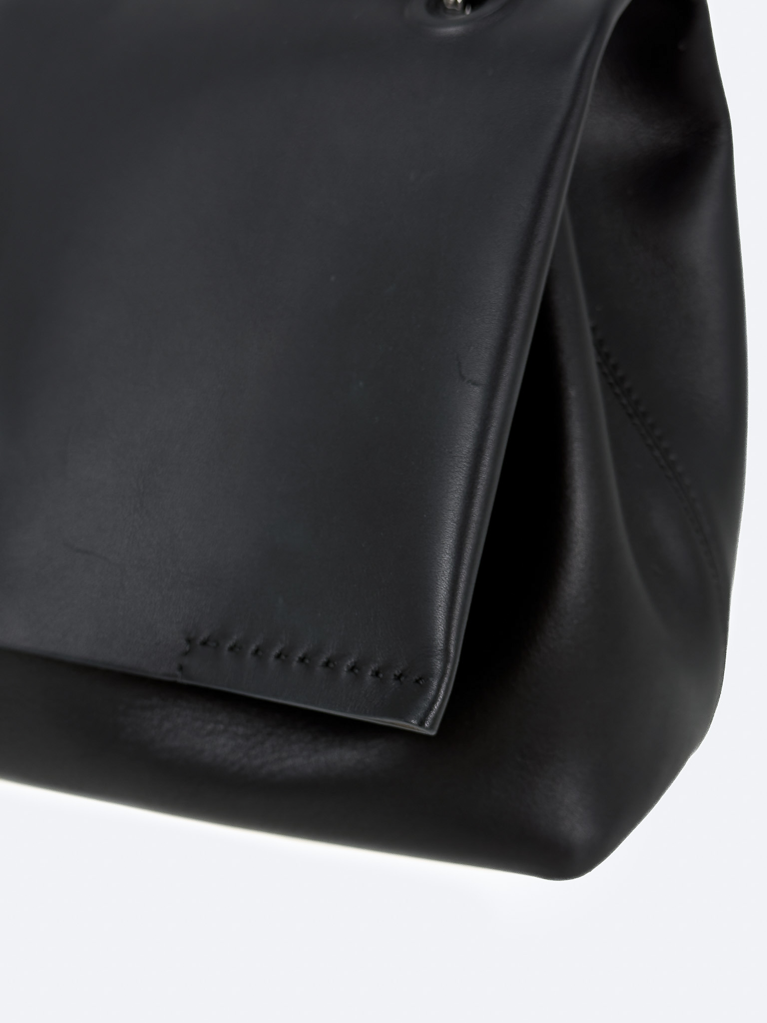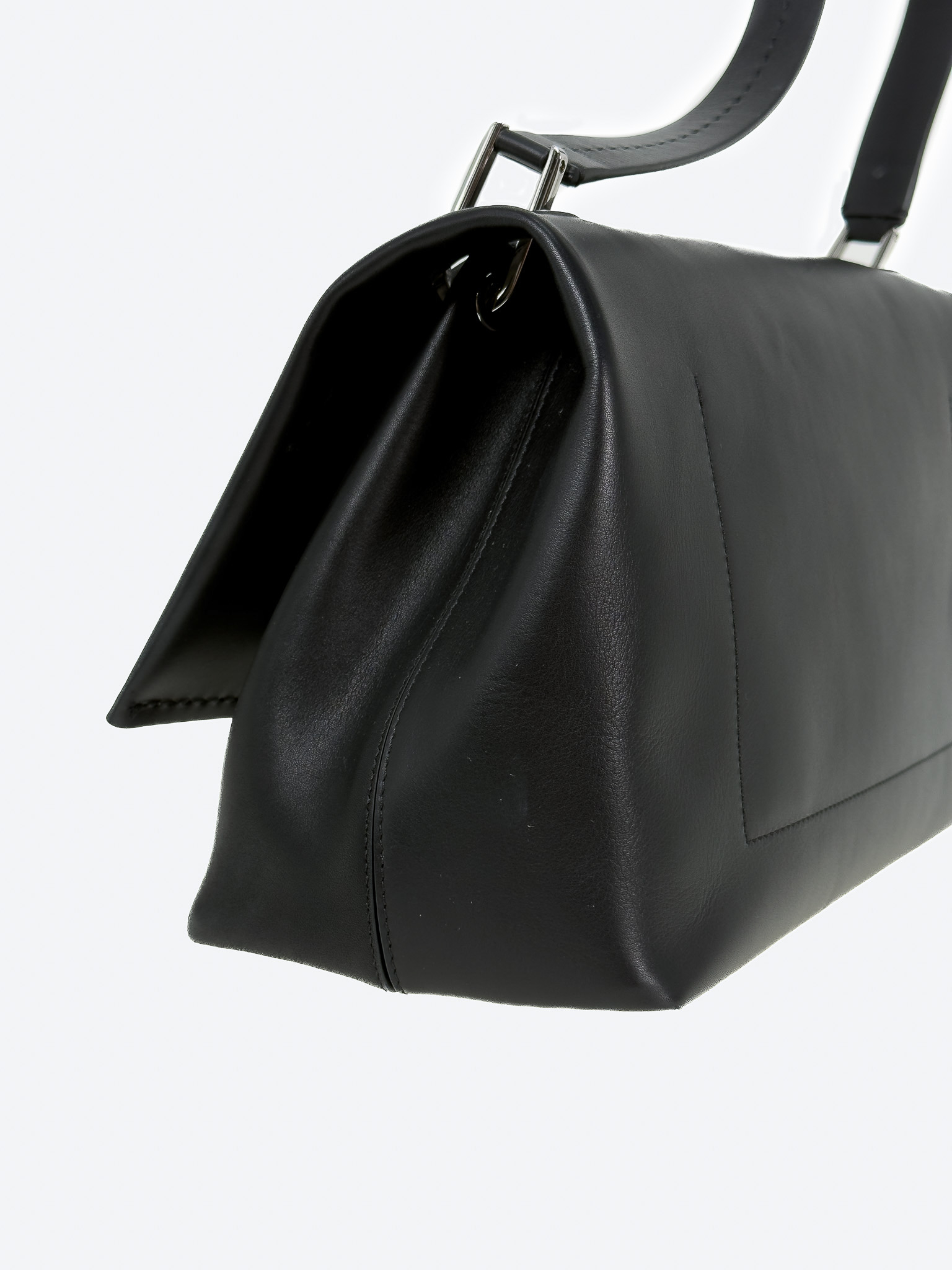 "Czarna skórzana torebka na ramię, miękka skóra, jeden uchwyt, wykończona dekoracyjnym przeszyciem, logo marki pod klapą, srebrne okucia, cztery nóżki od spodu, brązowe wnętrze, jedna komora z kieszenią, w zestawie z workiem przeciwkurzowym. Stan bardzo dobry, posiada delikatne zarysowania na skórze oraz nóżkach, plamy od długopisu wewnątrz. Wymiary: szerokość 34cm, wysokość 23cm, głębokość 16cm."