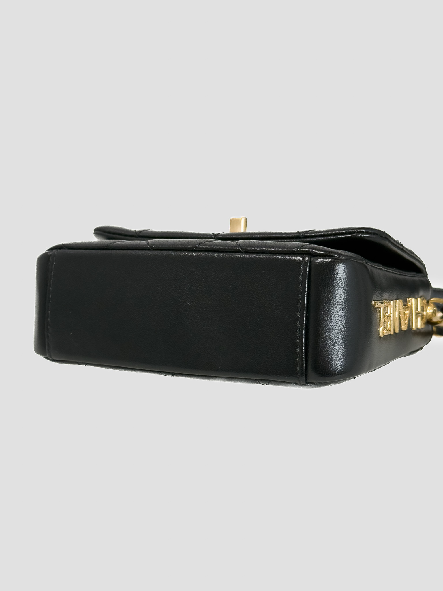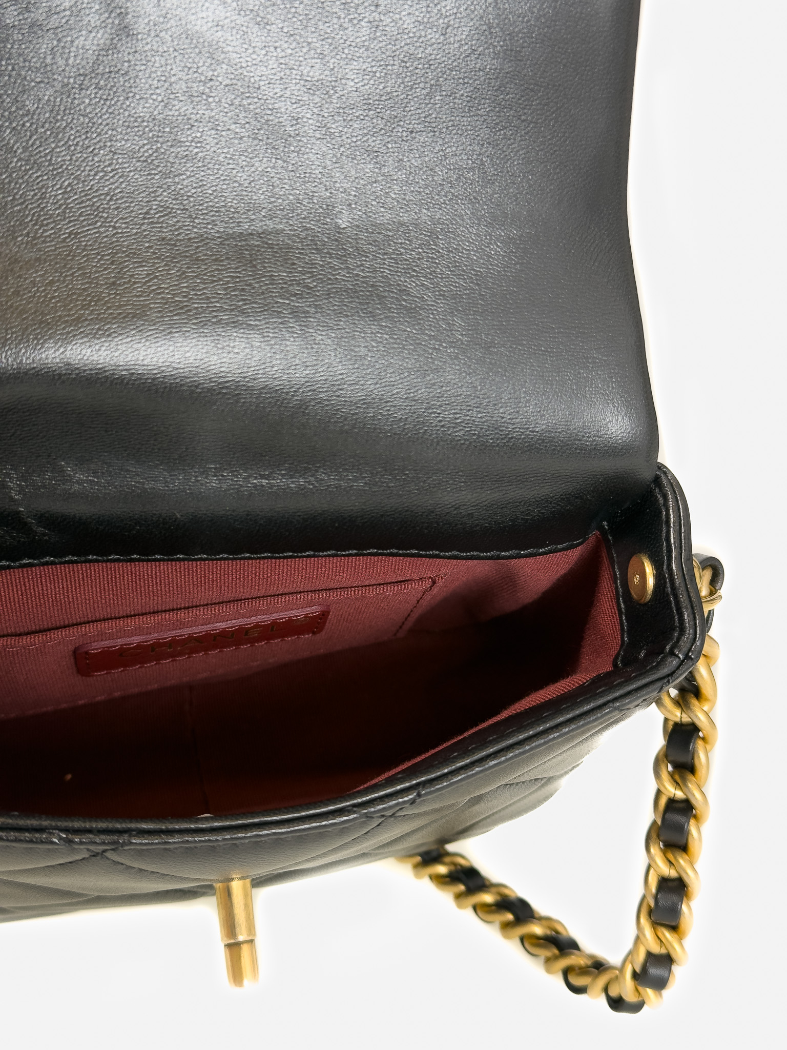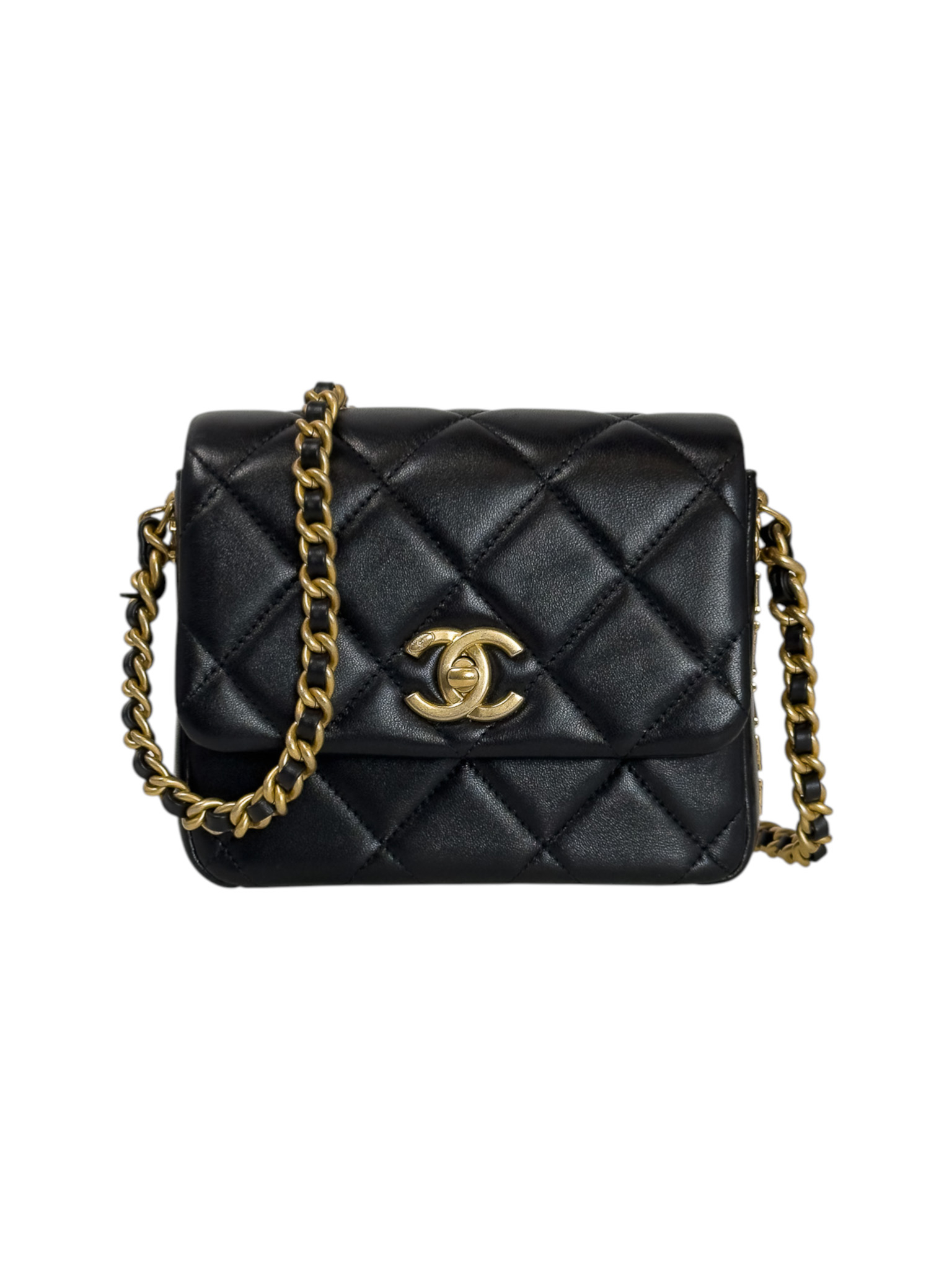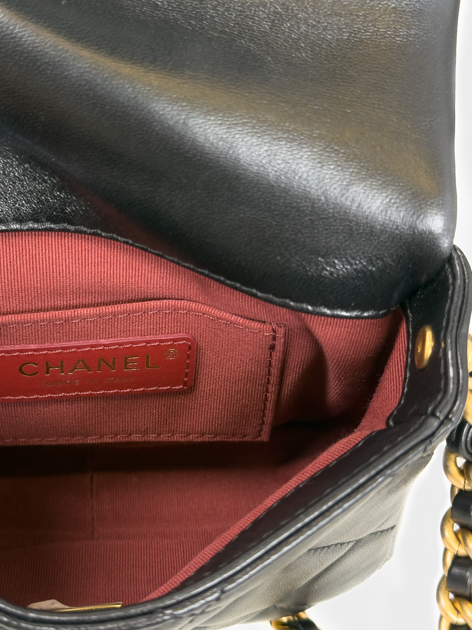 "Czarna skórzana pikowana diamentowo torebka, kwadratowy kształt, miękka skóra, złote, przekręcane zapięcie z logo marki na przodzie, długi pasek na ramię ozdobiony złotym łańcuchem, duże złote logo marki w bocznej części, bordowe wnętrze, jedna komora z kieszenią, w zestawie z workiem przeciwkurzowym oraz dowodem zakupu. Stan bardzo dobry. Wymiary: szerokość 16cm, wysokość 12cm, głębokość 5cm. Zakupiona w 2021 roku w butiku Chanel w Berlinie."