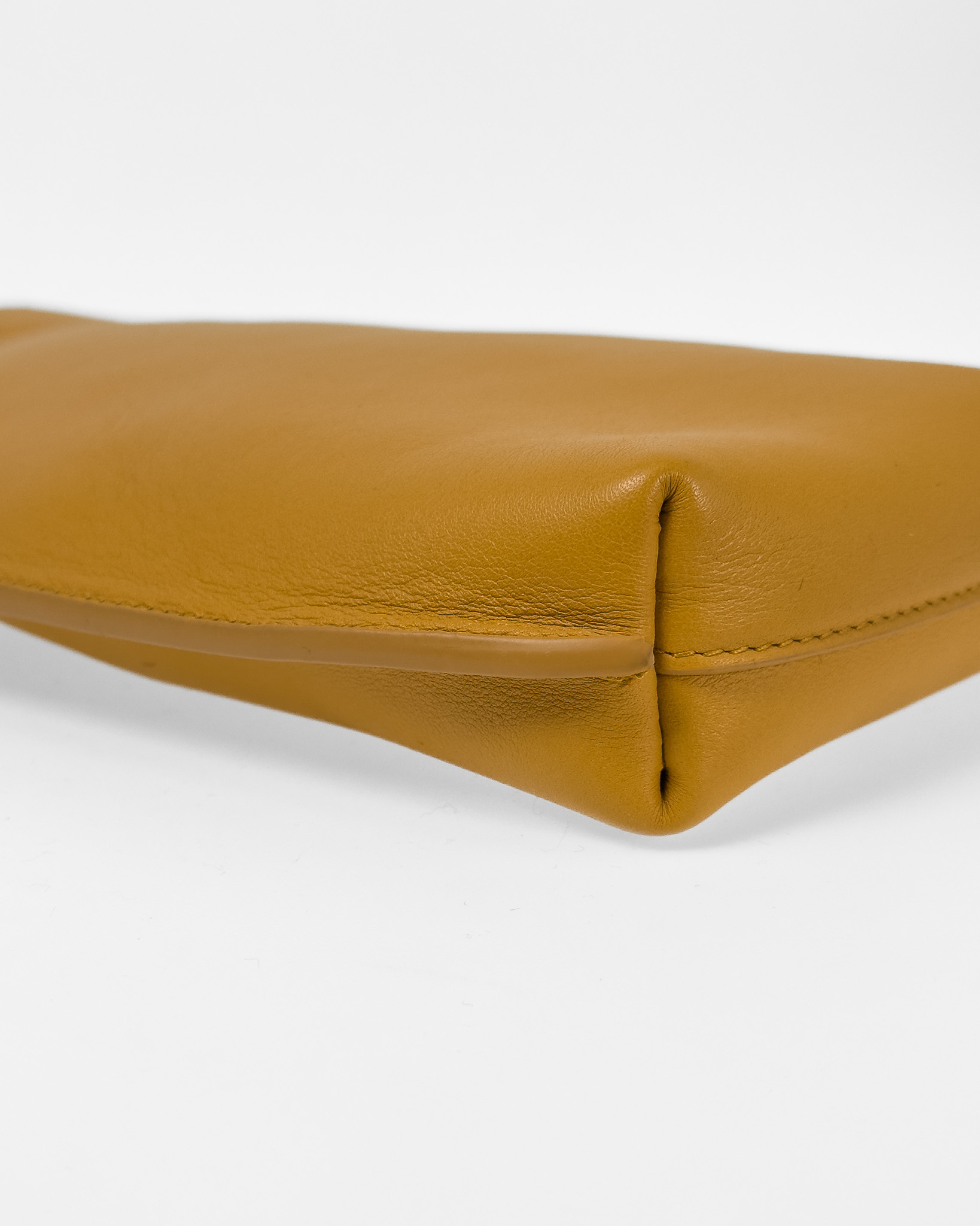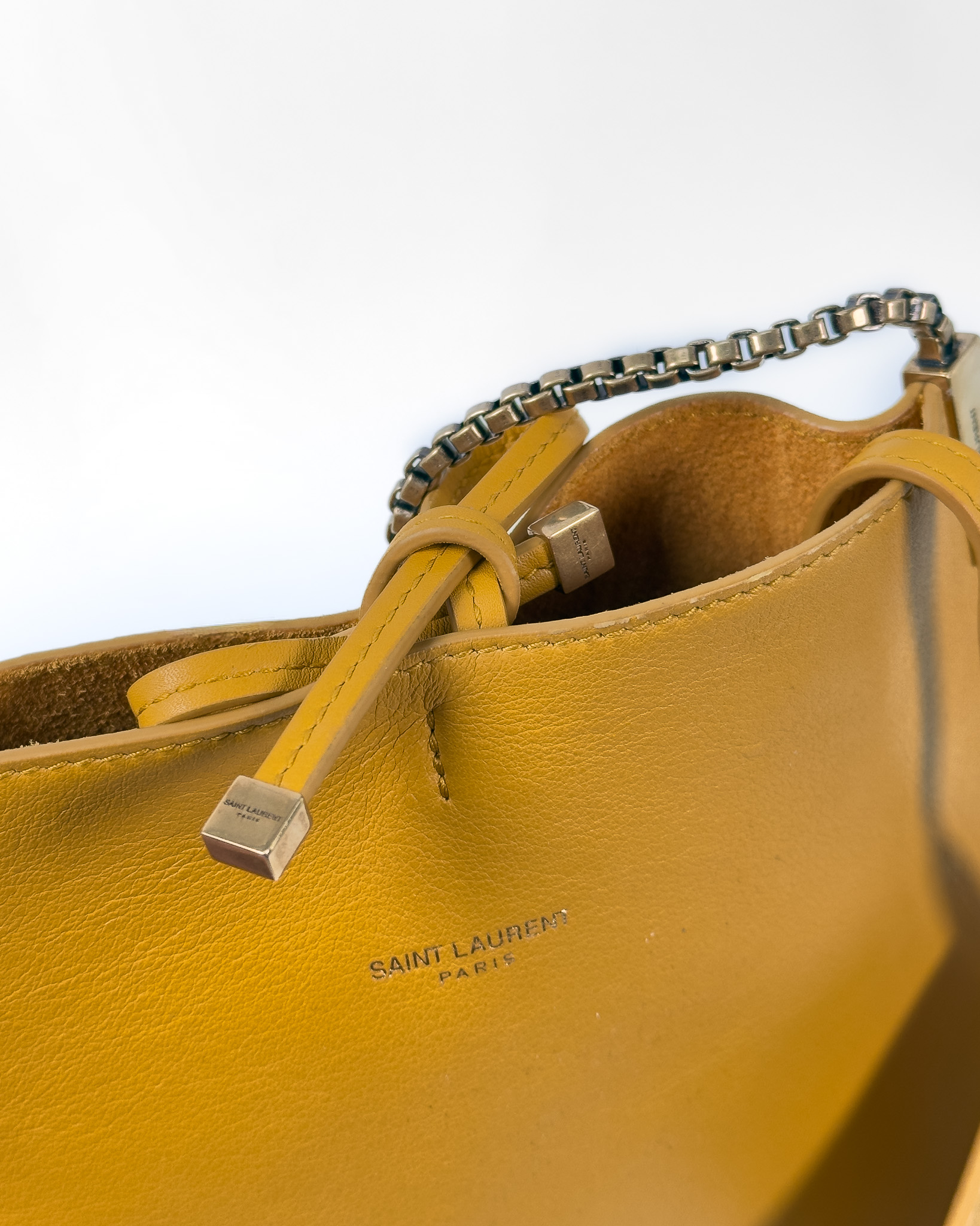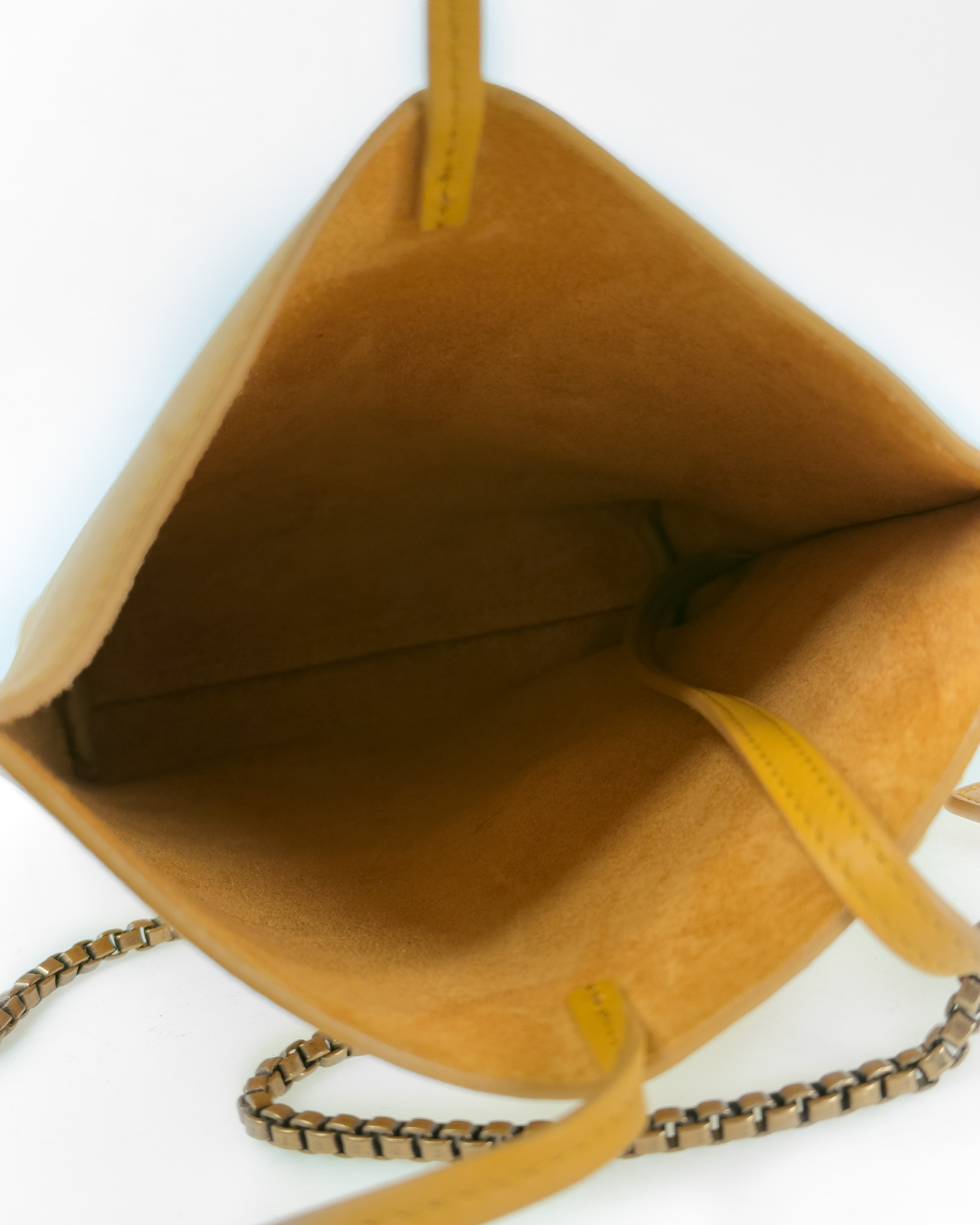 "Musztardowa skórzana torebka na złotym łańcuszku, delikatne logowanie na przodzie, prostokątny kształt, w środku posiada cardholder, wiązana góra, zamszowe wnętrze. Worek przeciwkurzowy w komplecie. Stan: bardzo dobry. Wymiary: szerokość 19cm, wysokość 23cm, głębokość 4cm."