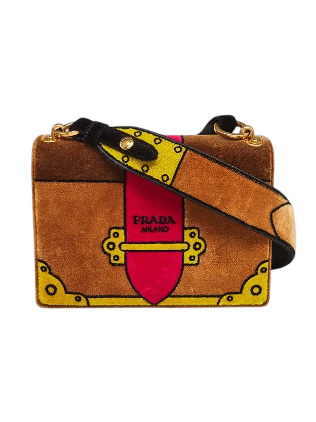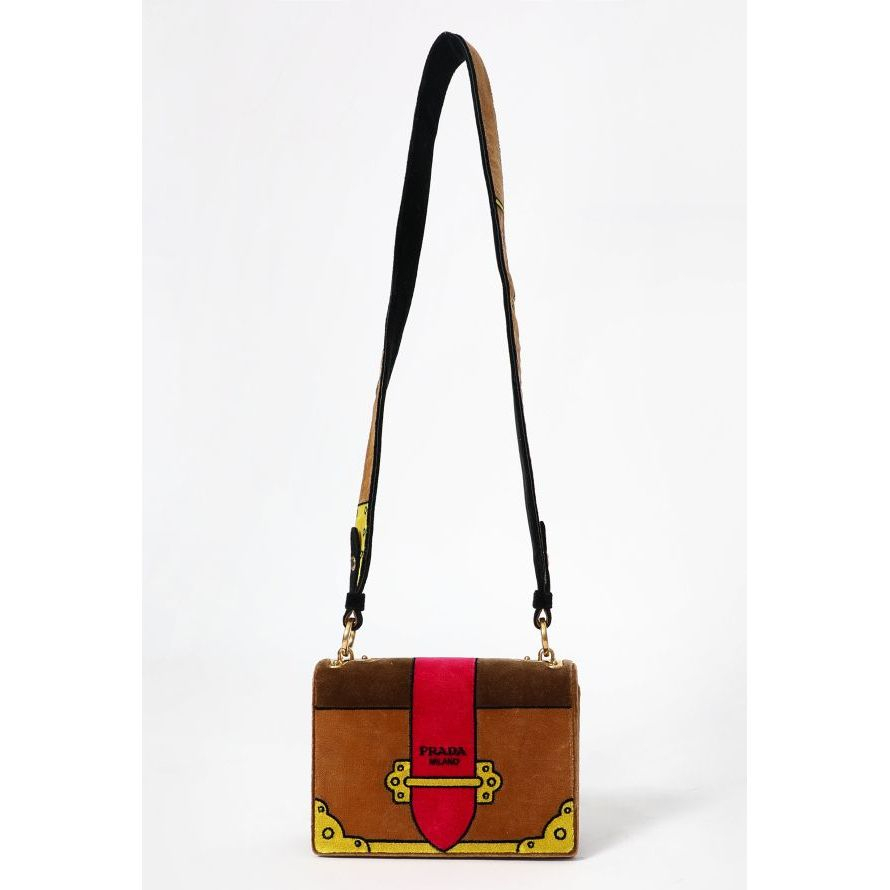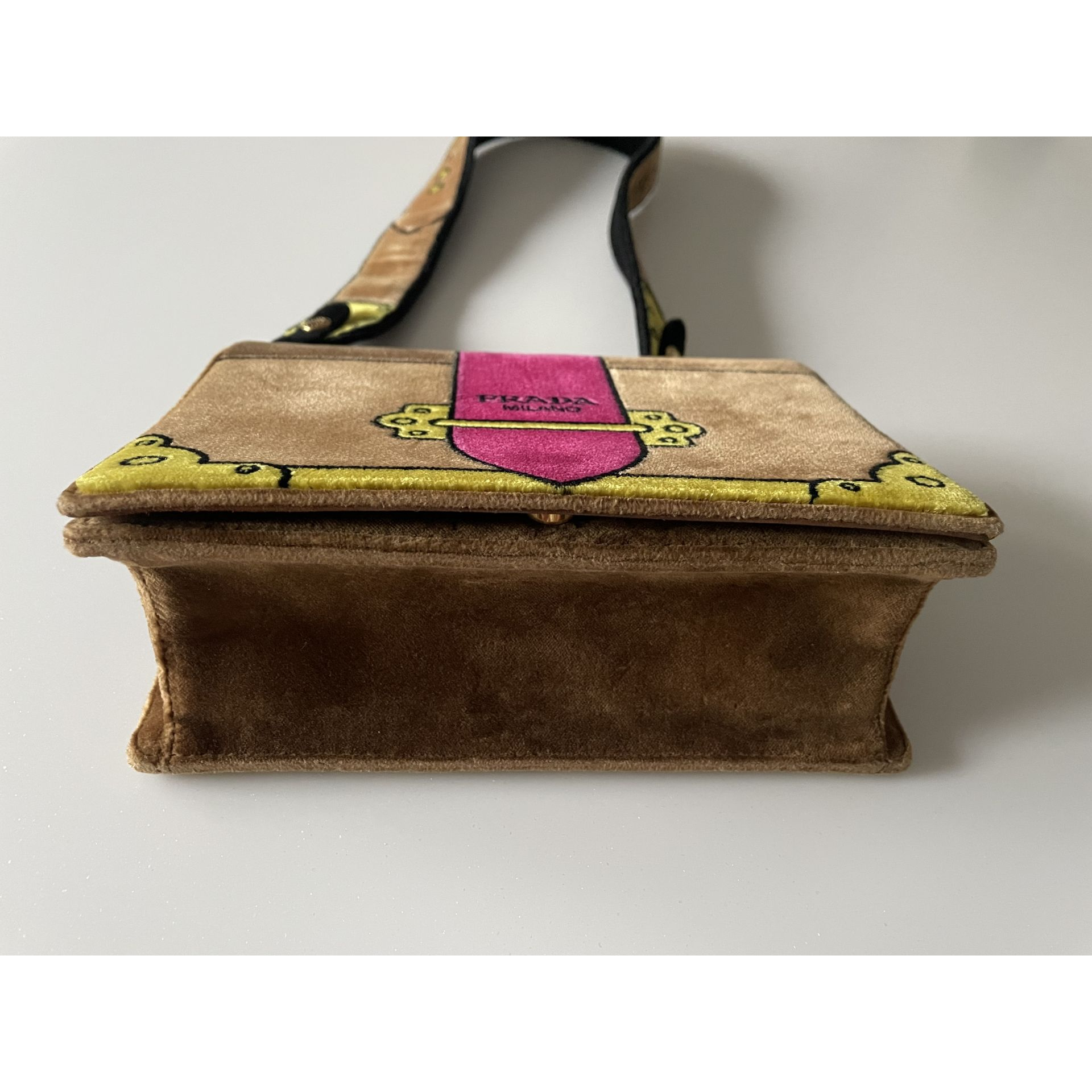 "TOREBKA PRADA WYKONANA Z VELVETU W KOLORZE CAMEL Z AKCENTAMI W CZERNI, ŻÓŁTYM I FUKSJI. UROCZY MODEL, NIEBANALNY DESIGN. WNĘTRZE ZE SKÓRY ZAMSZOWEJ I MATERIAŁU. MOŻNA NOSIĆ NA RAMIENIU I JAKO CROSSBODY. STAN BARDZO DOBRY - LEKKIE ŚLADY CHARAKTERYSTYCZNE DLA VELVETU WIDOCZNE NA ZDJĘCIACH.