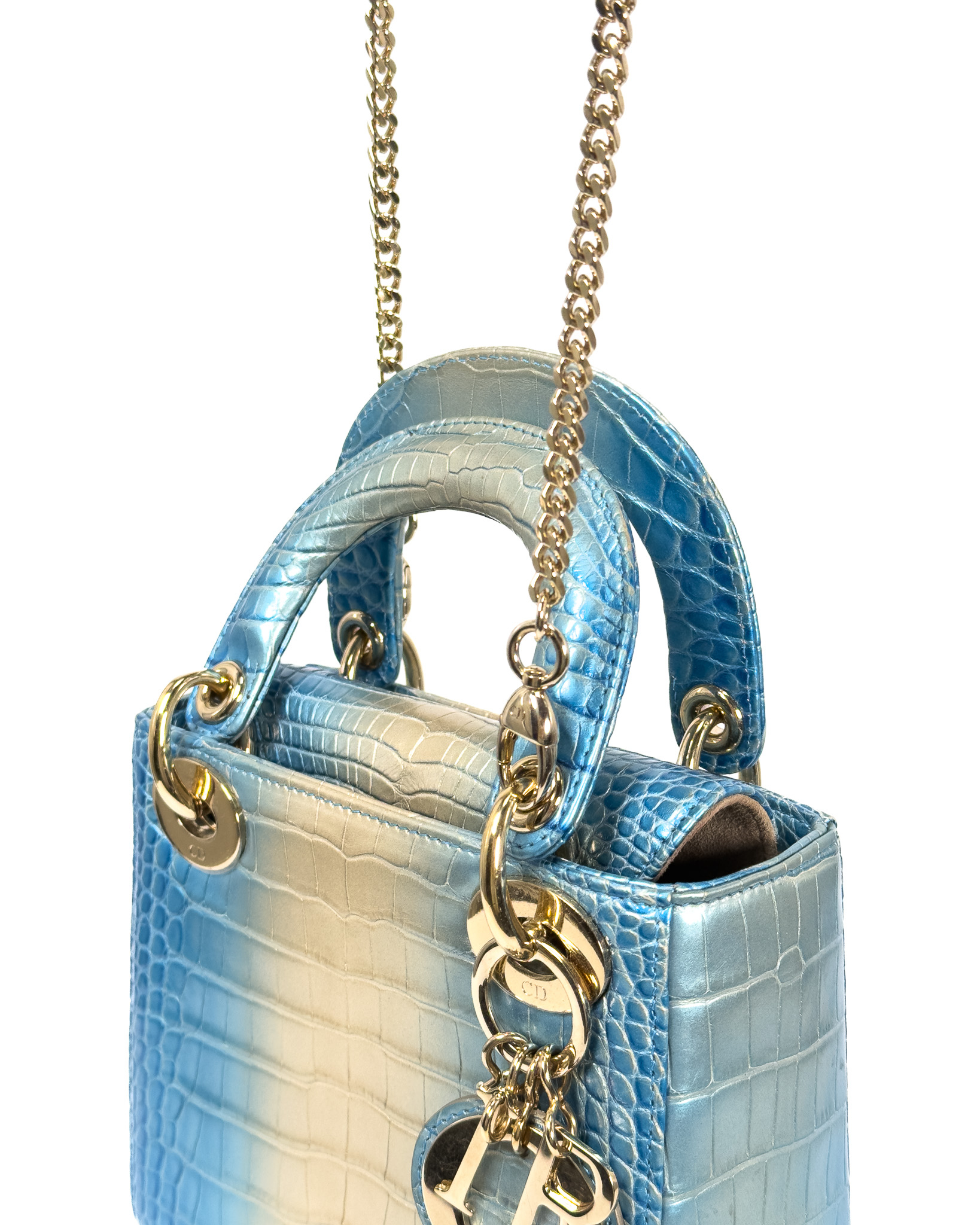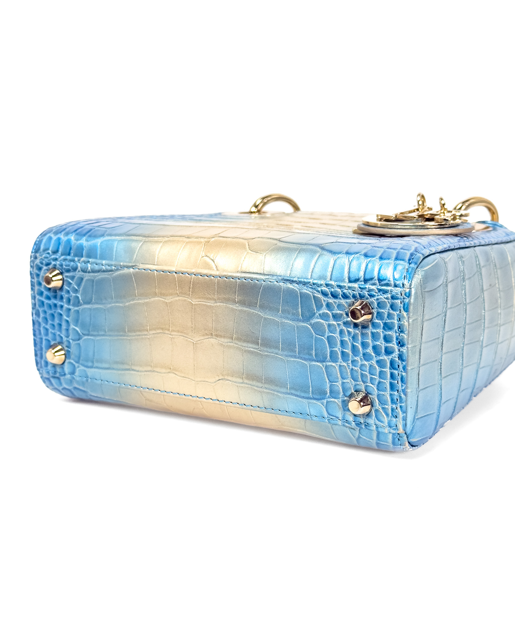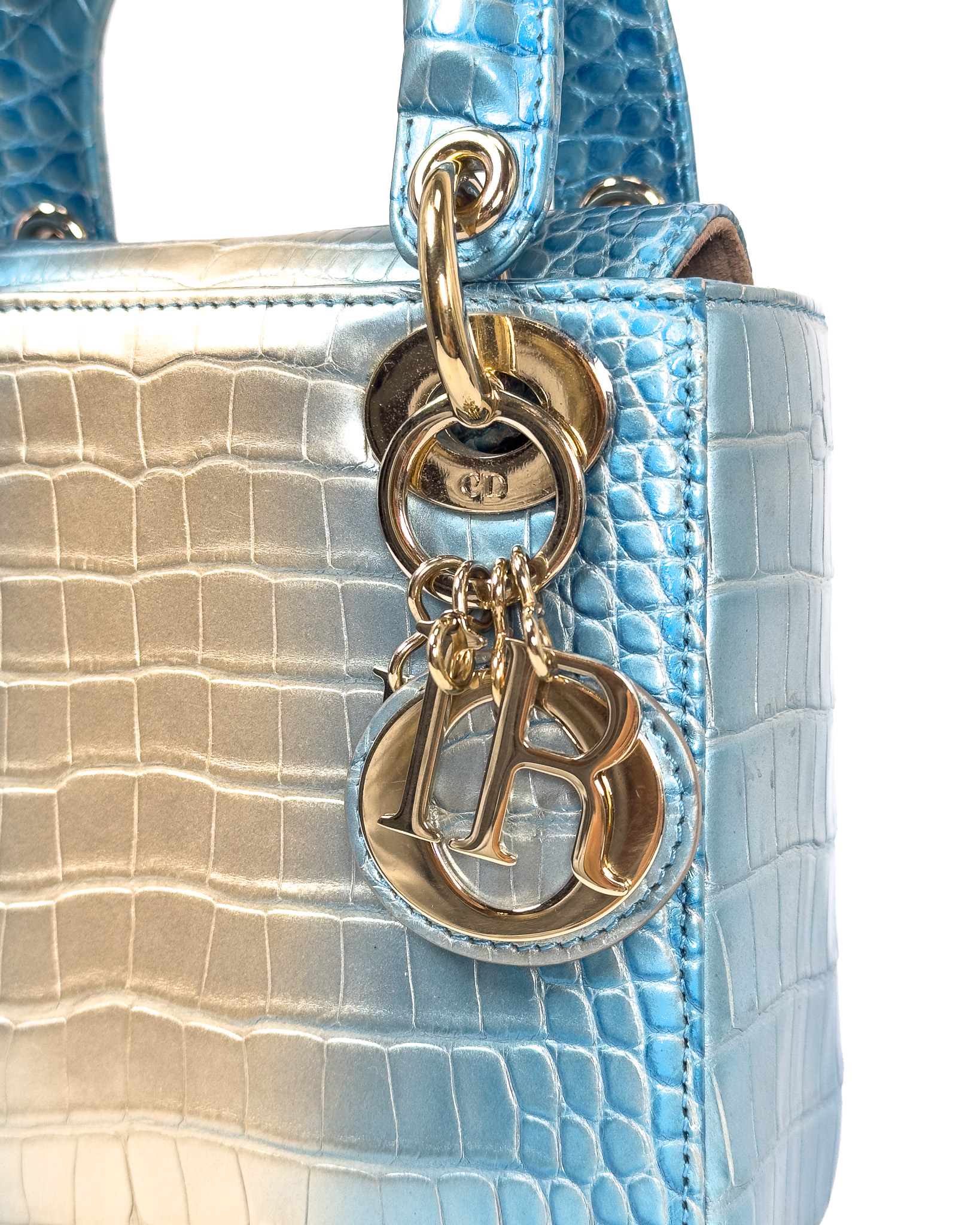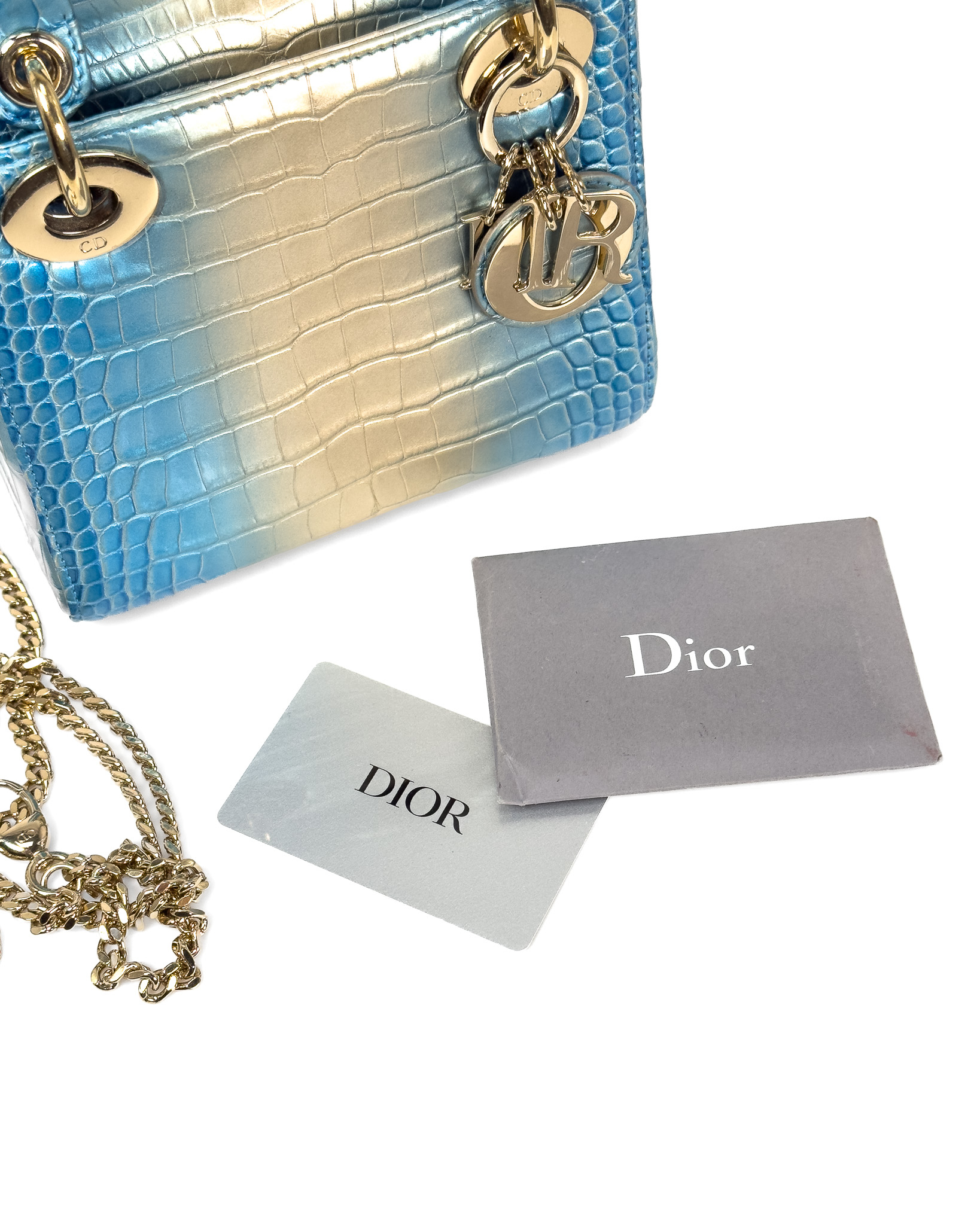 "Model: Lady Dior, rozmiar mini, wersja limitowana. Złoto-niebieska mała torebka wykonana ze skóry krokodyla, dwa uchwyty do ręki ze złotymi brelokami w kształcie liter tworzących logo marki, długi odpinany łańcuchowy pasek na ramię wykończony skórzaną wstawką, cztery nóżki od spodu, logowane złote okucia, zamszowe wnętrze, jedna komora z kieszenią wewnątrz, w zestawie z kartą autentyczności. Stan bardzo dobry, posiada małe rysy na metalowych elementach, delikatne przetarcia na rogach oraz zabrudzenia wewnątrz. Wymiary: szerokość 17cm, wysokość 15cm, głębokość 7cm."