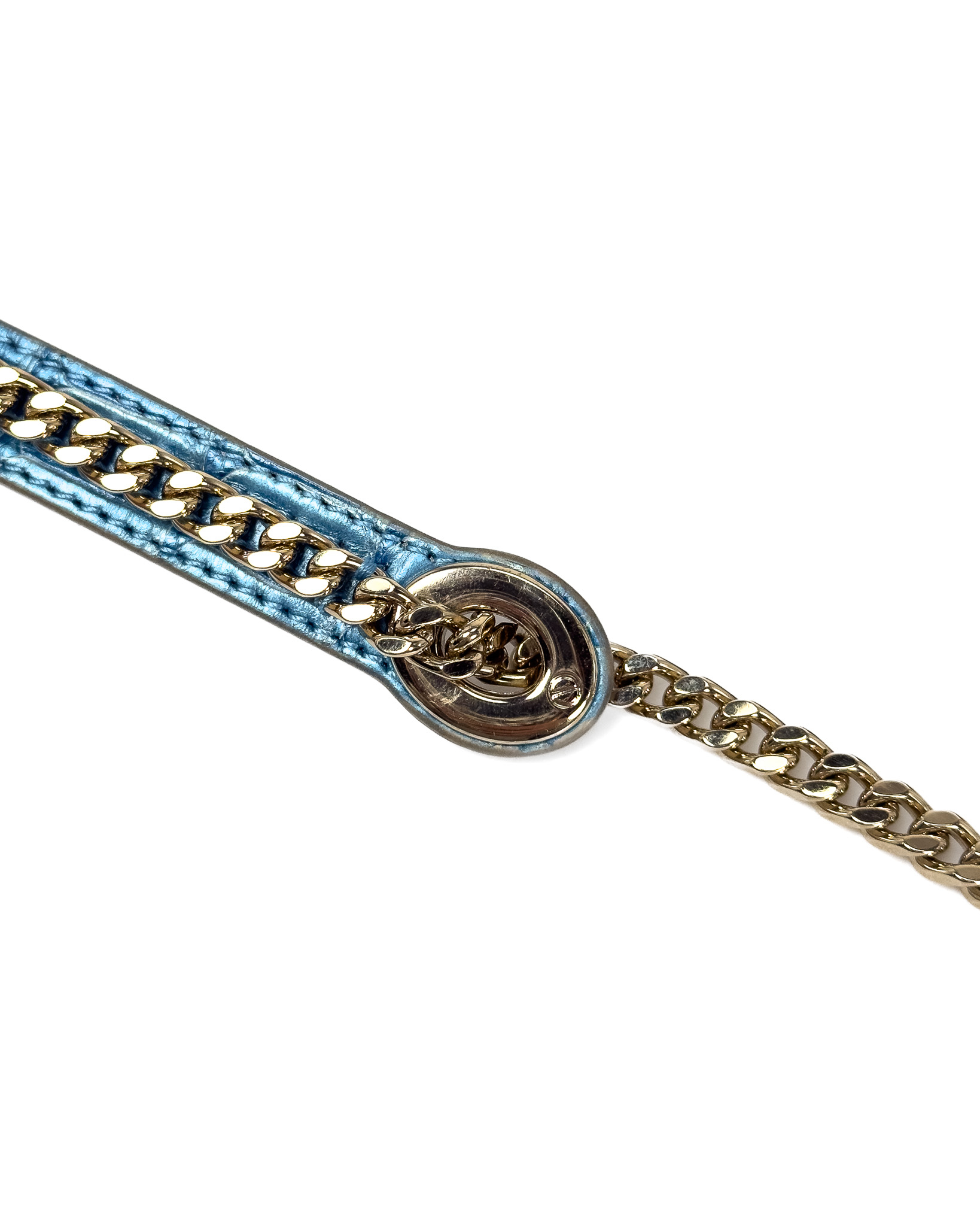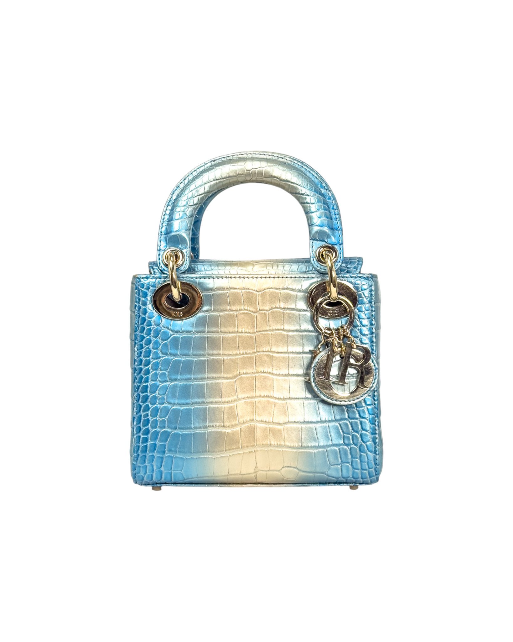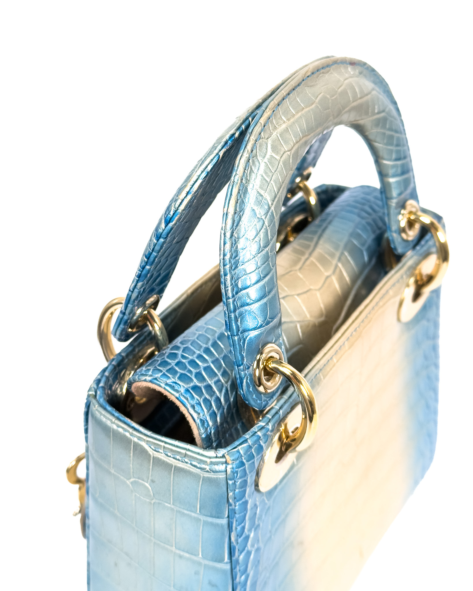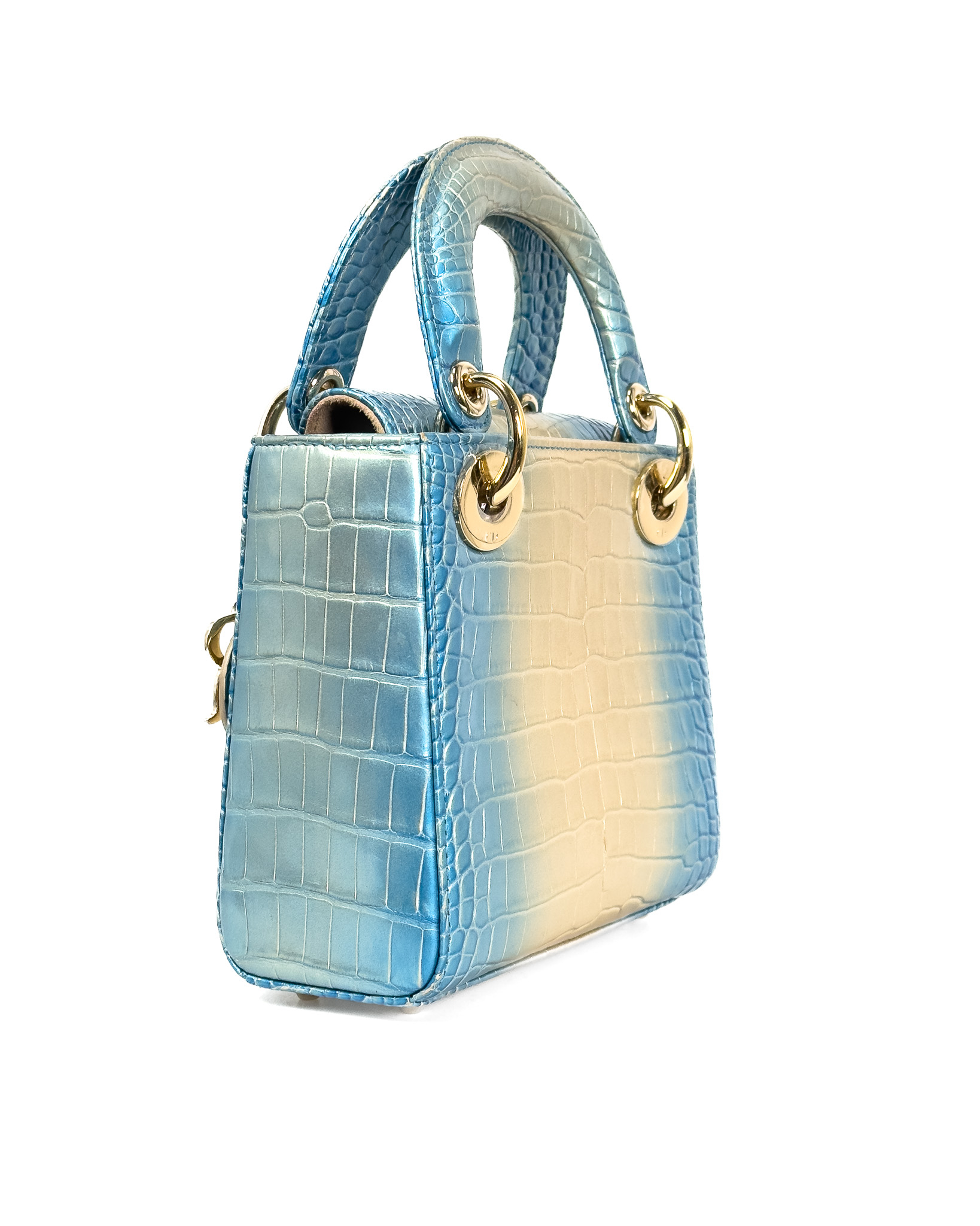 "Model: Lady Dior, rozmiar mini, wersja limitowana. Złoto-niebieska mała torebka wykonana ze skóry krokodyla, dwa uchwyty do ręki ze złotymi brelokami w kształcie liter tworzących logo marki, długi odpinany łańcuchowy pasek na ramię wykończony skórzaną wstawką, cztery nóżki od spodu, logowane złote okucia, zamszowe wnętrze, jedna komora z kieszenią wewnątrz, w zestawie z kartą autentyczności. Stan bardzo dobry, posiada małe rysy na metalowych elementach, delikatne przetarcia na rogach oraz zabrudzenia wewnątrz. Wymiary: szerokość 17cm, wysokość 15cm, głębokość 7cm."