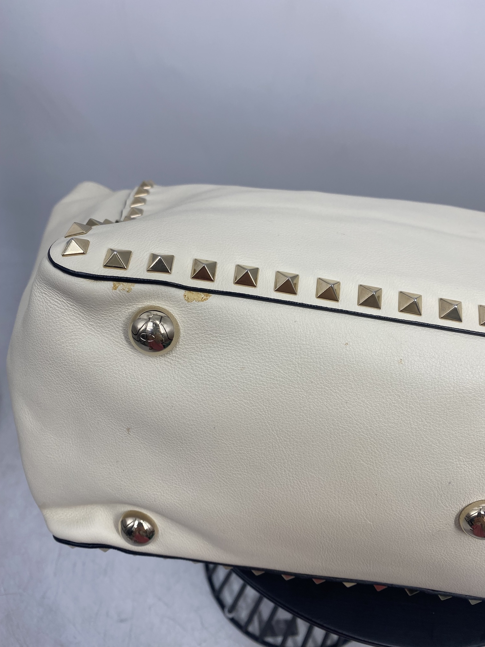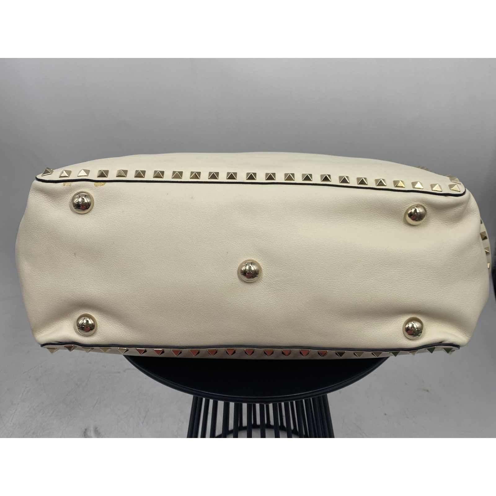 "śmietankowa torebka typu shopper, nabijana ćwiekami, dodatkowy dłuższy pasek, model The Rockstud medium leather trapeze bag"