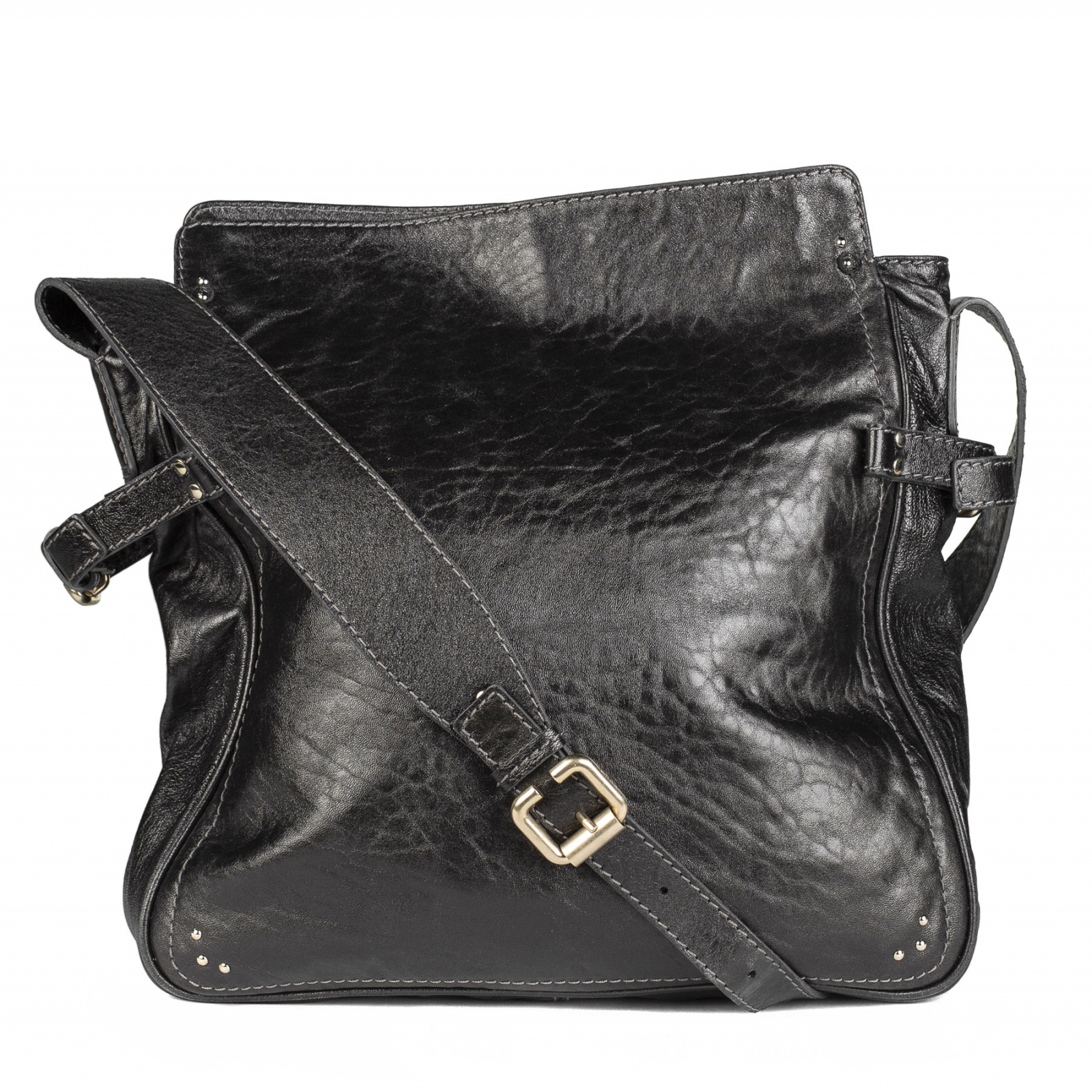 "Torebka, czarna, złote okucia, złoty łańcuch, złota kłódka, na szerokim pasku, zapięcia na magnesy, duża, kluczyk. Wymiary: szerokość 41 cm, wysokość 36 cm, dł. pasek 123 cm"