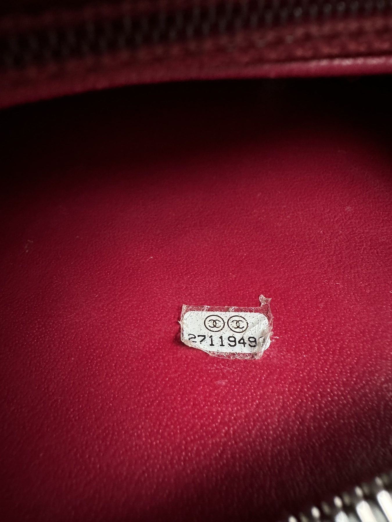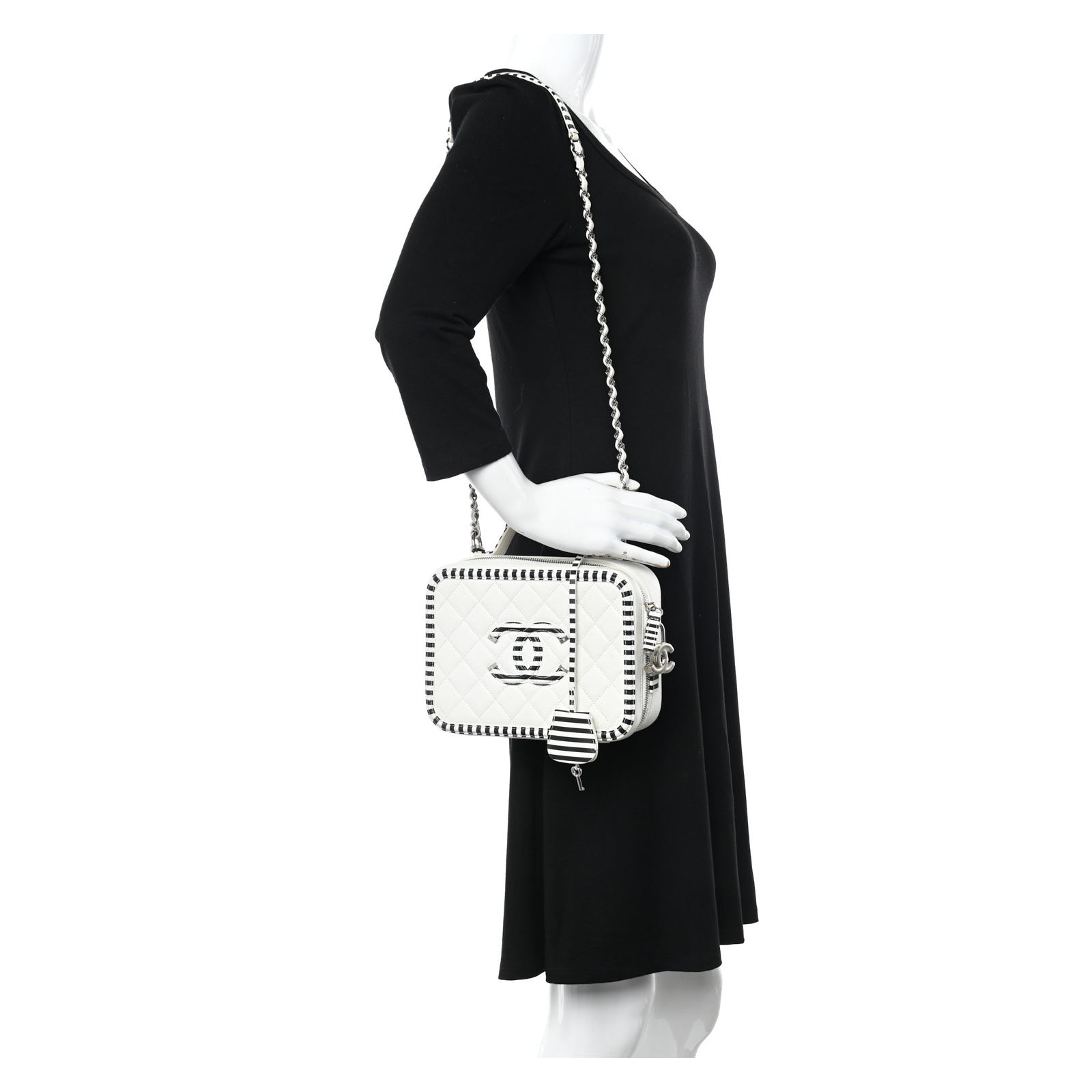 "Biała torebka wykonana z pikowanej diamentowo skóry z dużym logo na przodzie ze srebrnymi końcami, wykończona czarno-białymi paskami, srebrny pasek na ramię z łańcuszkiem przeszytym białą skórą, skórzany element na ramię, uchwyt górny do ręki, zapinana na dwa srebrne suwaki, wnętrze z czerwonej skóry, dwie komory z dwoma zasuwanymi kieszeniami, używana. Stan bardzo dobry, lekko wytarta skóra w górnej części torebki przy suwaku. Model: Caviar Quilted Striped Medium CC Filigree Vanity Case White Black."