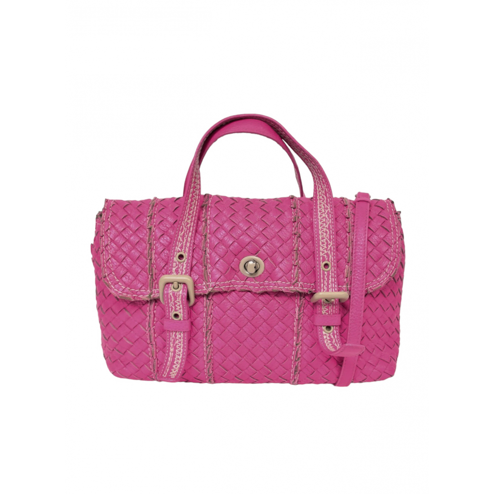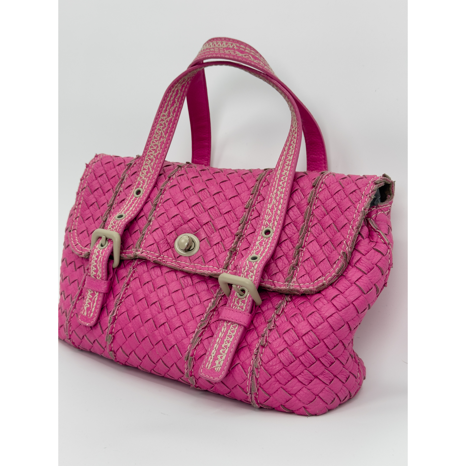 "Różowa torebka z szarymi przeszyciami, w charakterystyczny pleciony wzór dla marki, w środku wykończona brązowym zamszem. Zapinana na szare zapięcie. Posiada dodatkowy pasek. Możliwość noszenia do ręki oraz crossbody. Worek przeciwkurzowy w komplecie. Torebka jest używana, zapięcie ma zdarty lakier. Wymiary: szerokość 35cm, wysokość 18cm, głębokość 10cm."