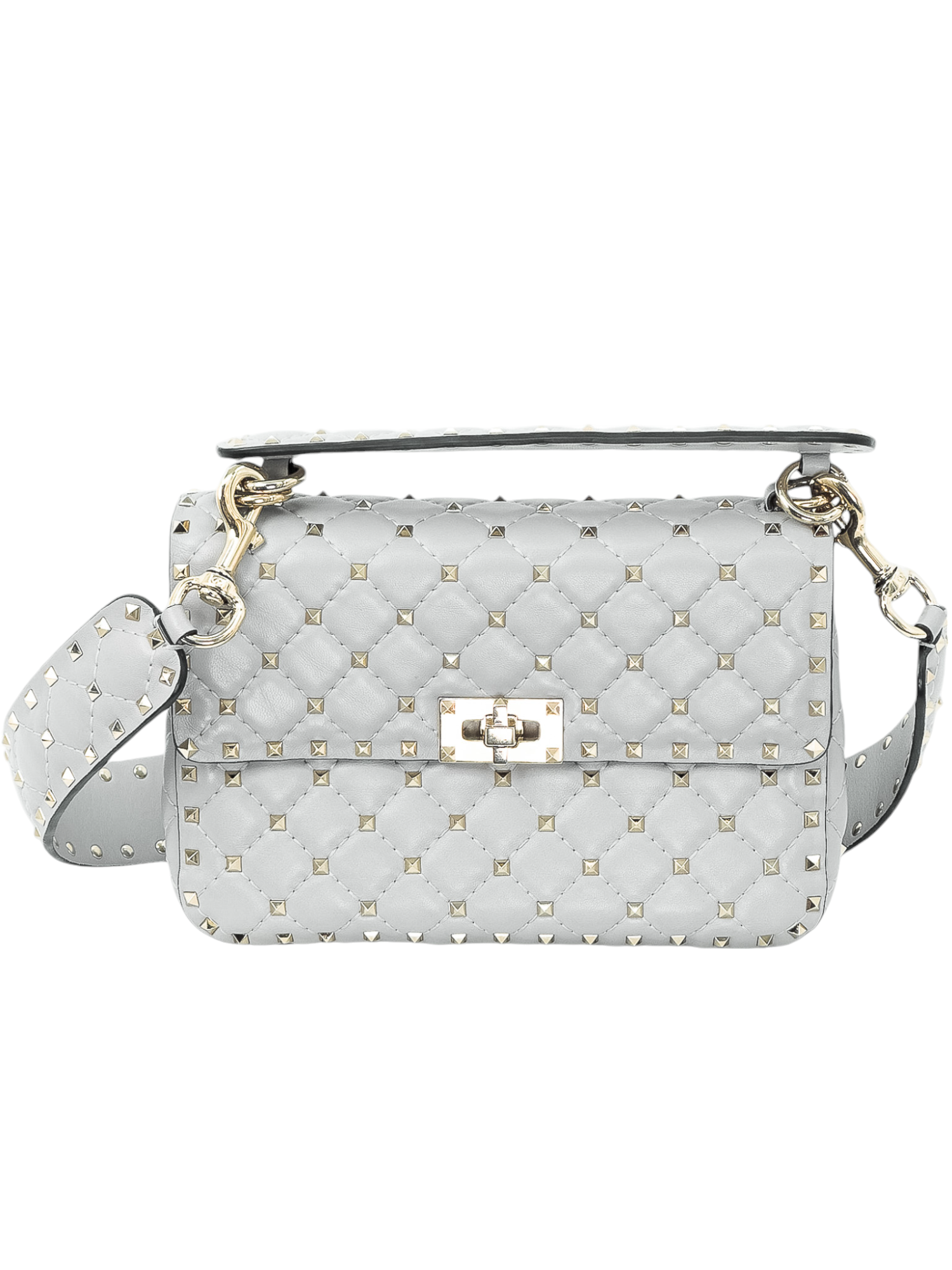 "Model: Rockstud Spike. Szara skórzana pikowana torebka z poświatą fioletowego koloru, ozdobiona złotymi ćwiekami, prostokątny kształt, jedna komora wewnątrz z zasuwaną kieszenią, przekręcane zapięcie na klapie, do ręki oraz crossbody. Stan bardzo dobry. Widoczne rysy na zapięciu. Worek przeciwkurzowy w komplecie. Wymiary: szerokość 23cm, wysokość 16cm, głębokość 7cm."