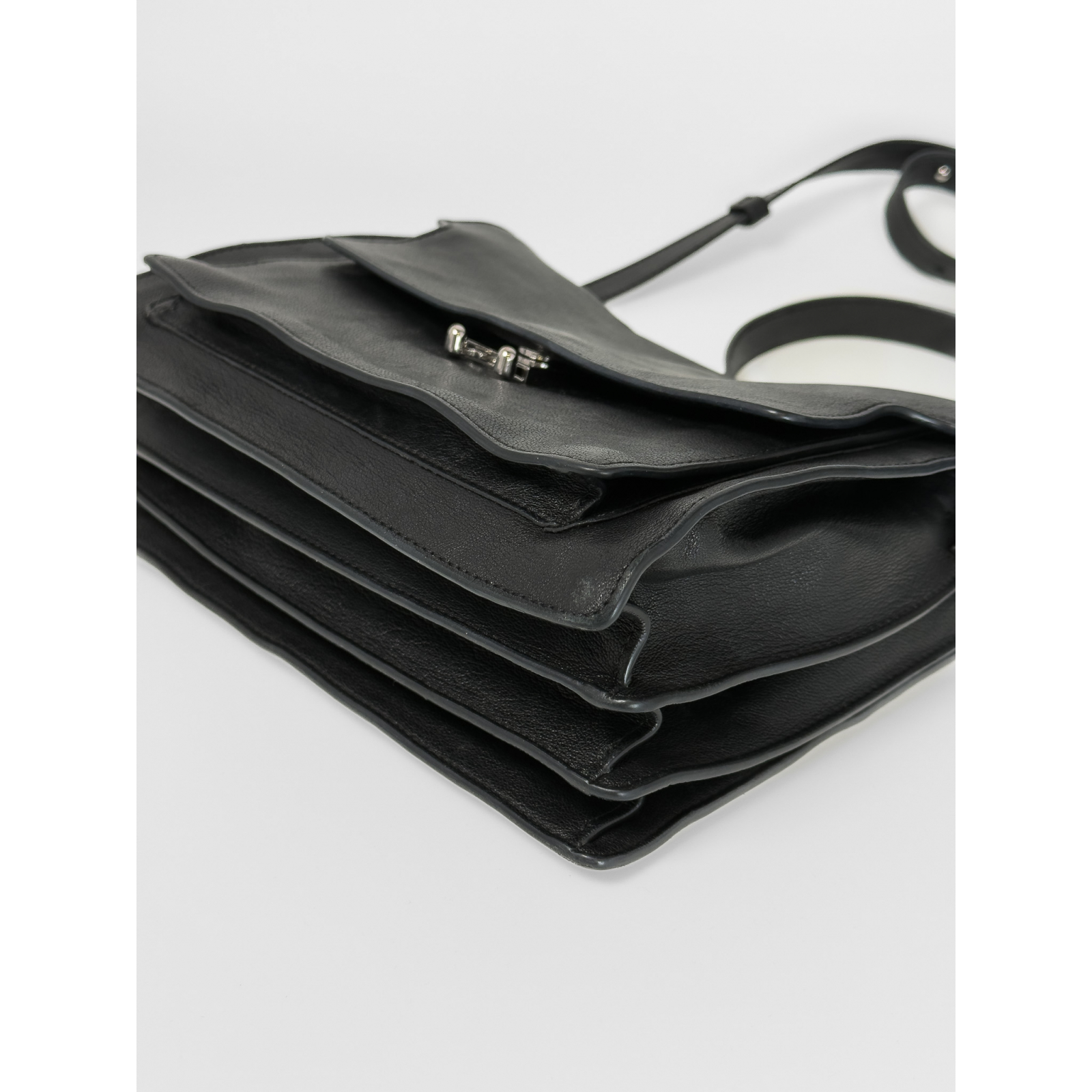 "Czarna skórzana torebka na ramię, miękka groszkowa, połyskująca skóra, regulowany pasek na ramię, logowane srebrne okucia, zapięcie pod klapą, trzy komory, dwie zasuwane kieszenie. Wymiary: szerokość 29cm, wysokość 18cm, głębokość 12cm."