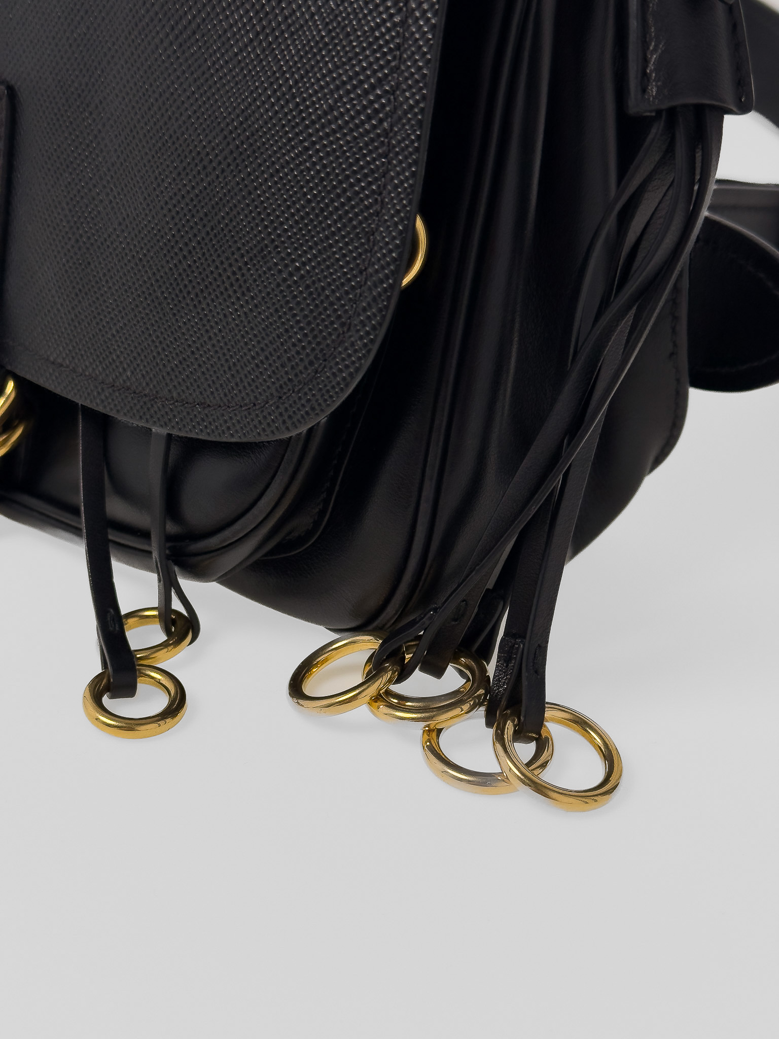 "Czarna skórzana torebka na ramię, ozdobiona złotymi okrągłymi detalami/ zawieszkami, kwadratowy kształt, zapinana na złotą sprzączkę w centralnej części, długi regulowany, szeroki pasek na ramię, dwie kieszenie, jedna zapinana na zapięcie magnetyczne pod klapą, druga na suwak w tylnej części nad logo marki, dwie komory, logowane wnętrze. Stan bardzo dobry. Wymiary: szerokość 24cm, wysokość 20cm, głębokość 9cm."