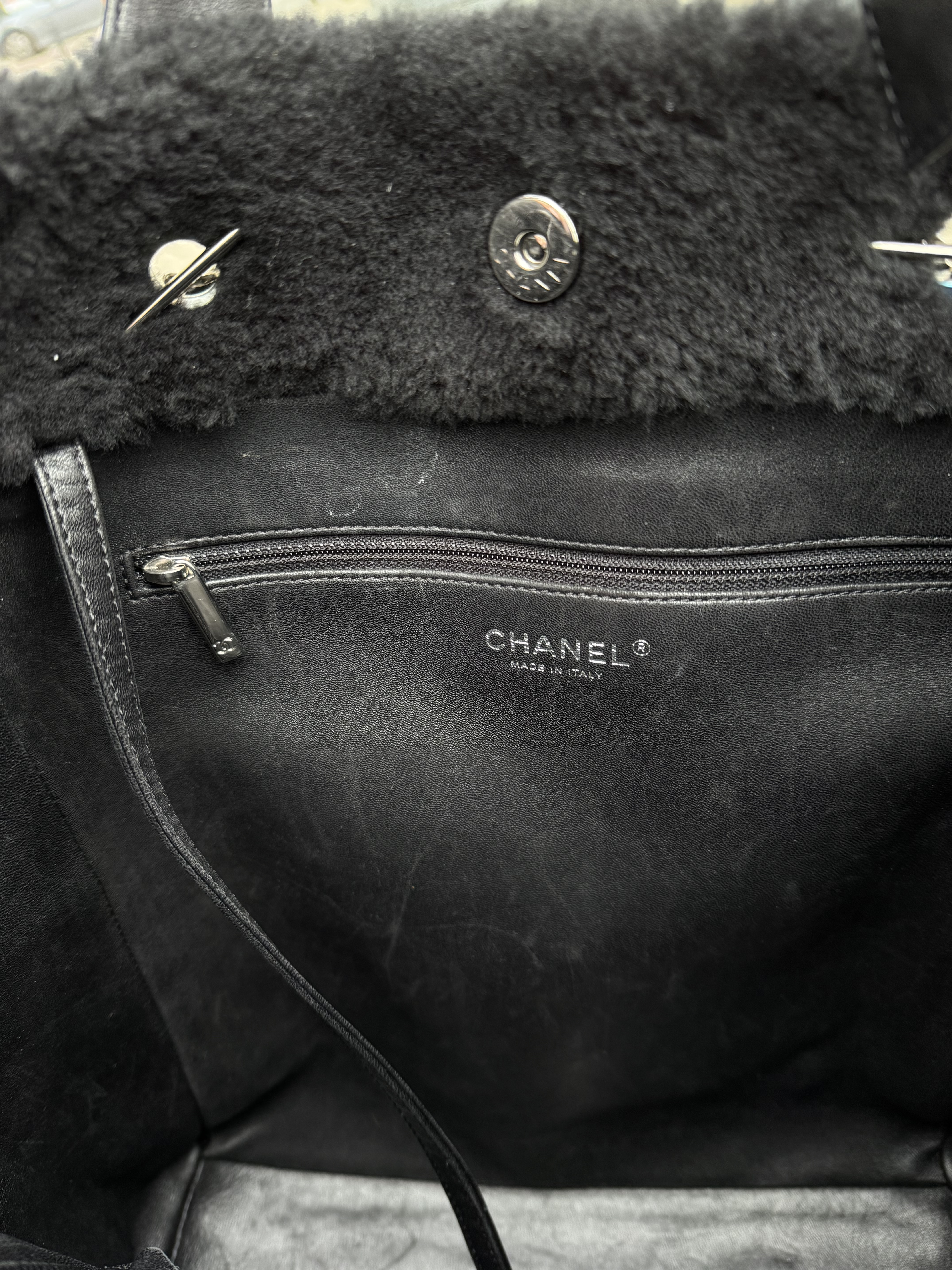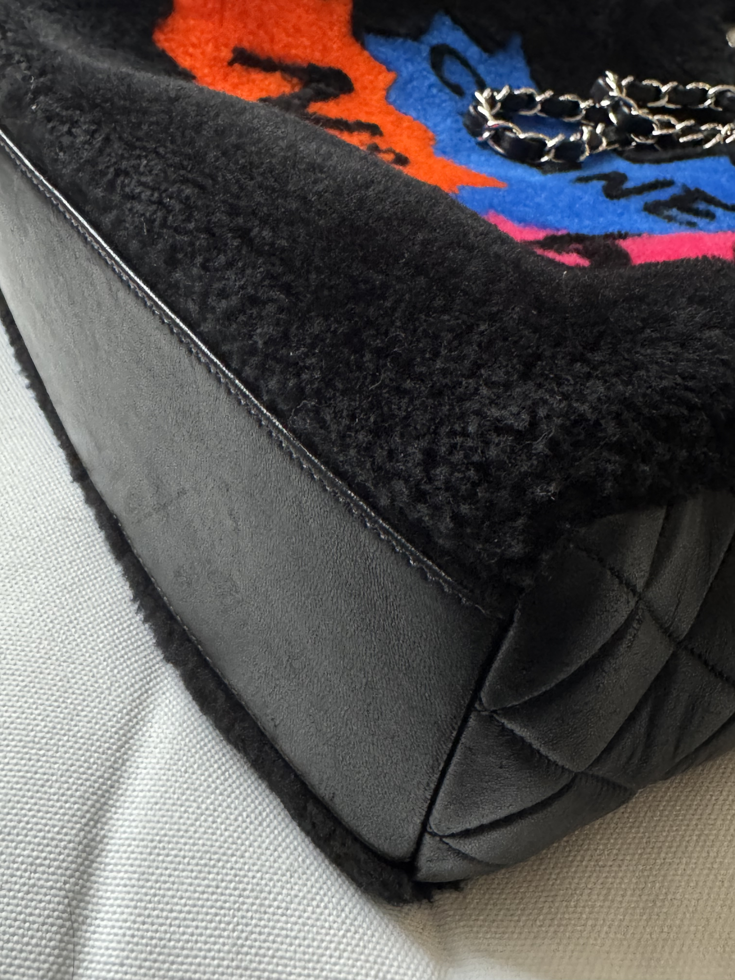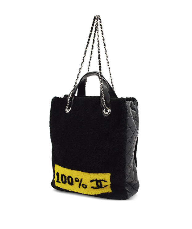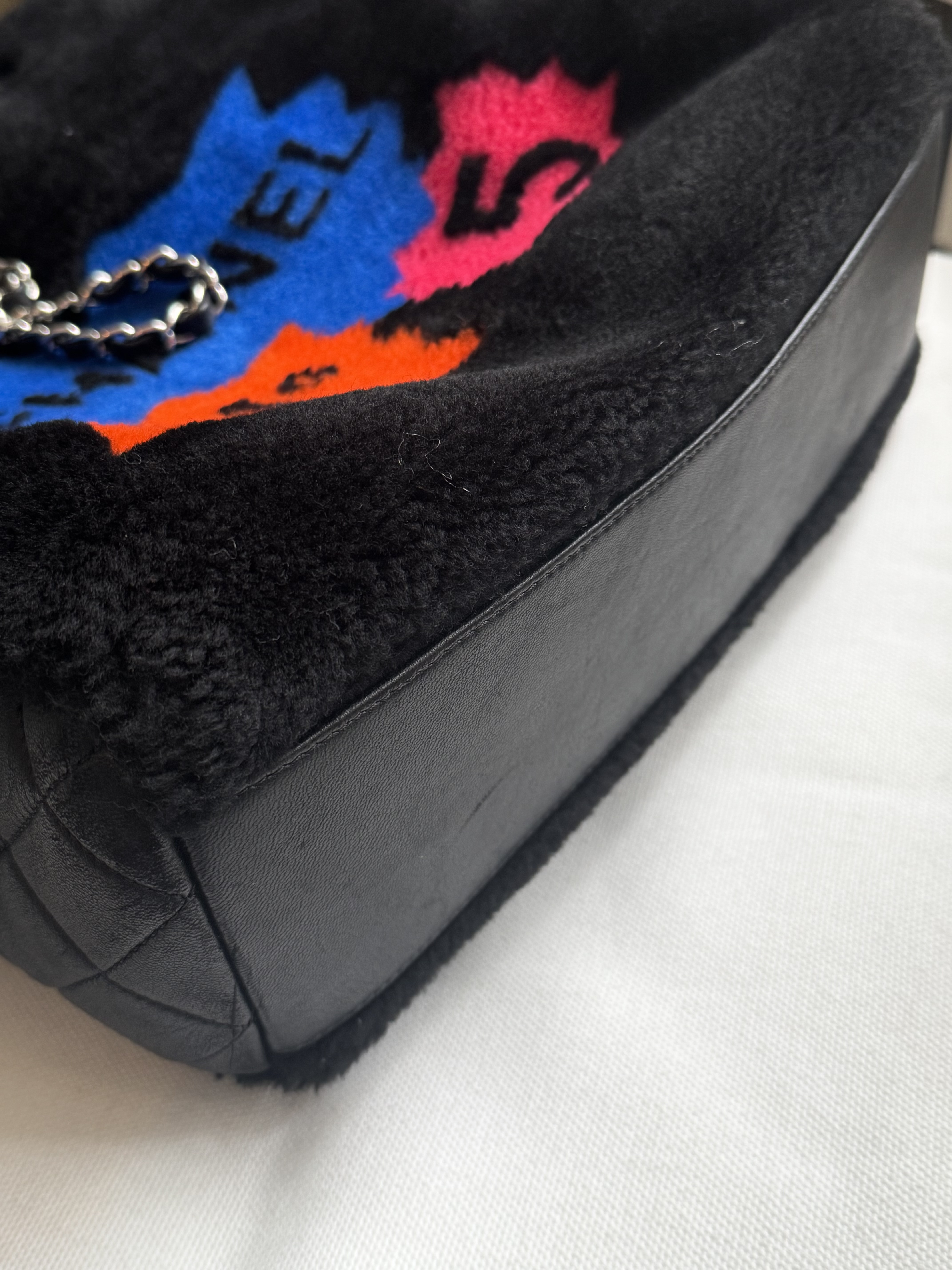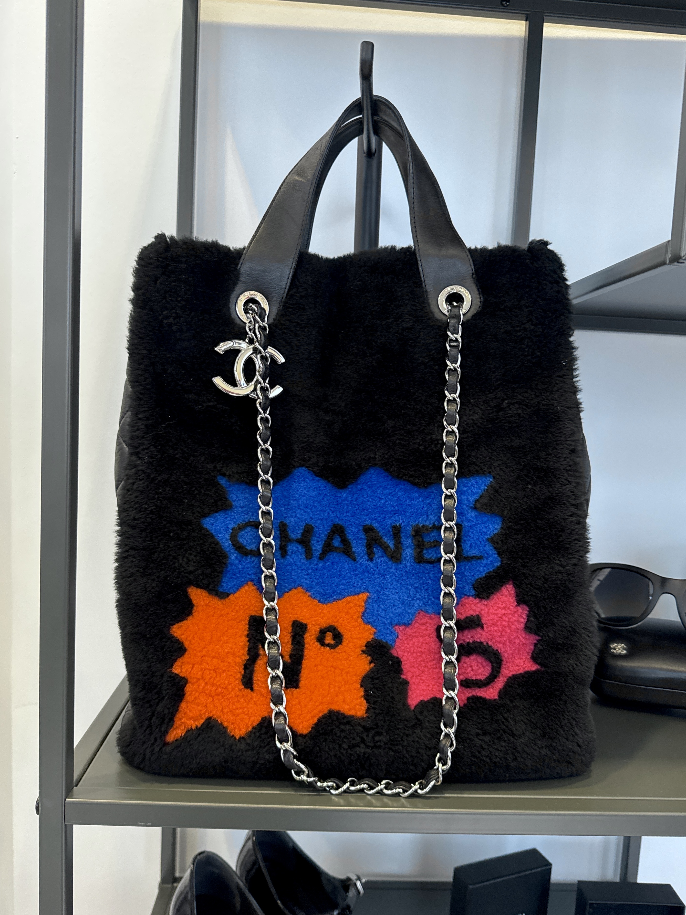 "Czarna torebka, połączenie pluszu/futerka i skóry. Boki ze skóry pikowanej, skórzane rączki oraz łańcuch na ramię. Srebrne okucia. Na przodzie kolorowe napisy No 5, z tyły żólty napis 100% CC. Rok produkcji z kodu seryjnego 2014-2015. Worek przeciwkurzowy oraz karta autentyczności w komplecie. Kolekcja Supermarker 2024/2015"