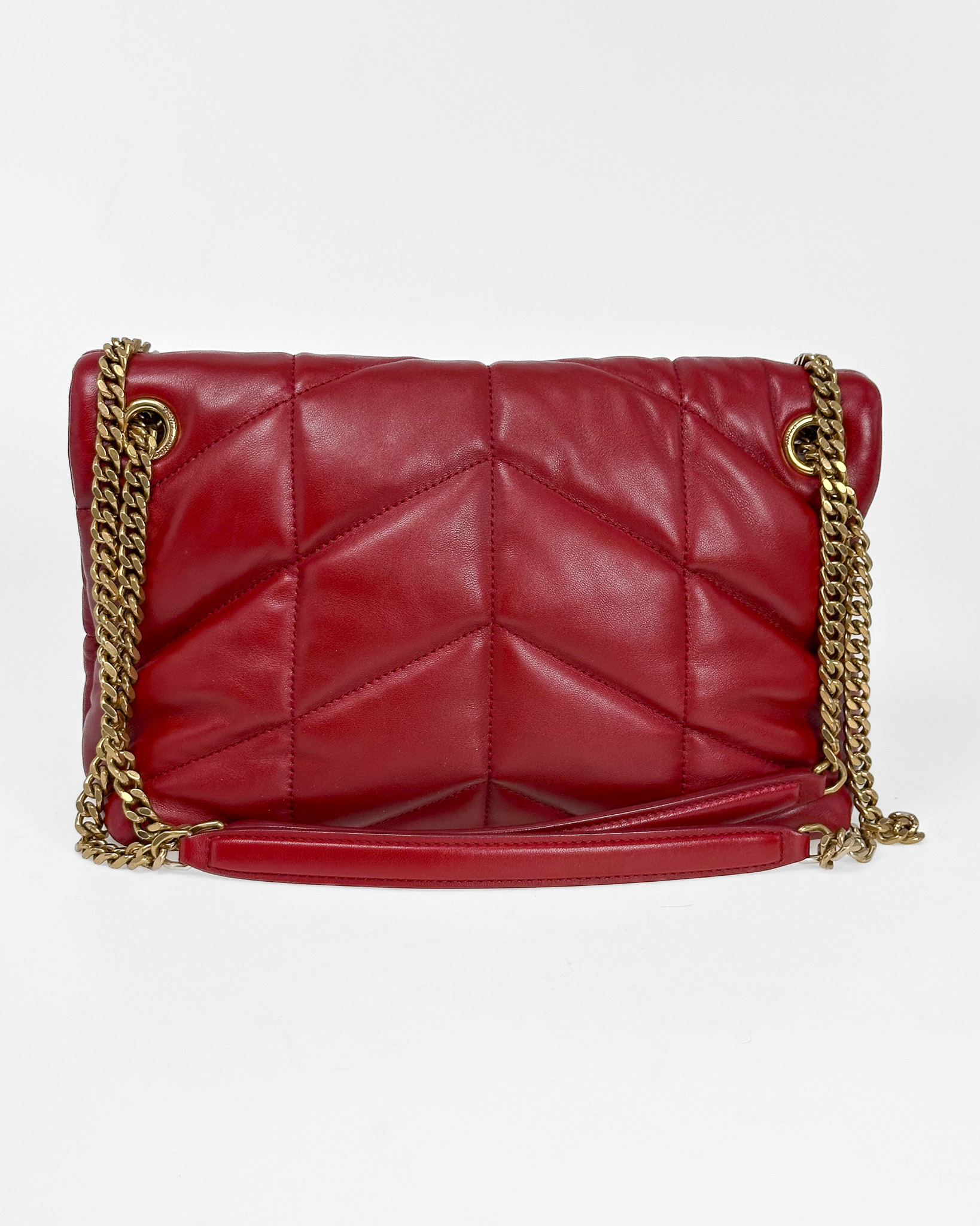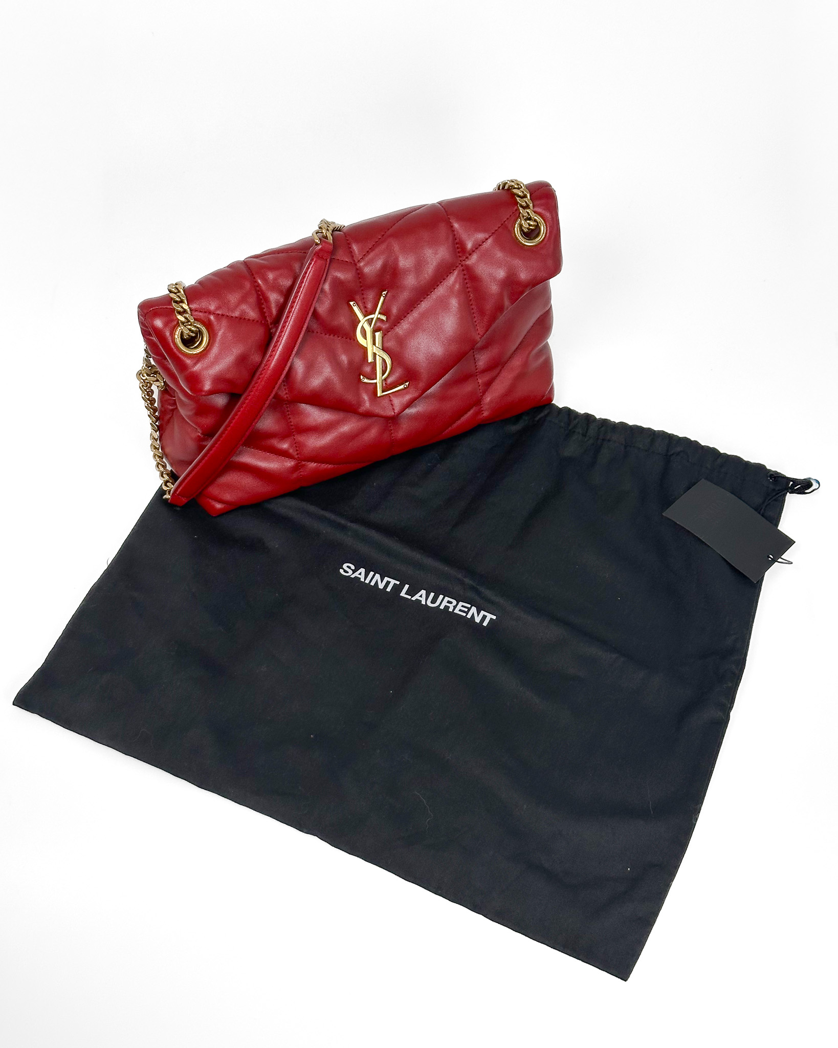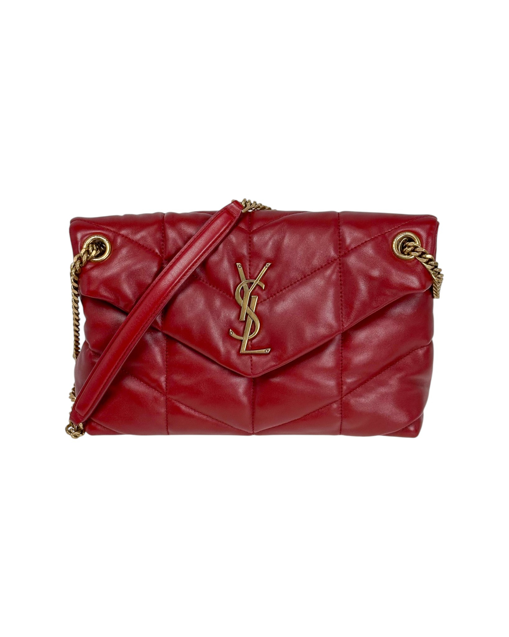 "Czerwona torebka model Puffer Small, złote okucia, logo na przodzie. Wymiary: 29 X 17 X 11 CM. Zakupiona w Vitkacu, worek przeciwkurzowy w komplecie."