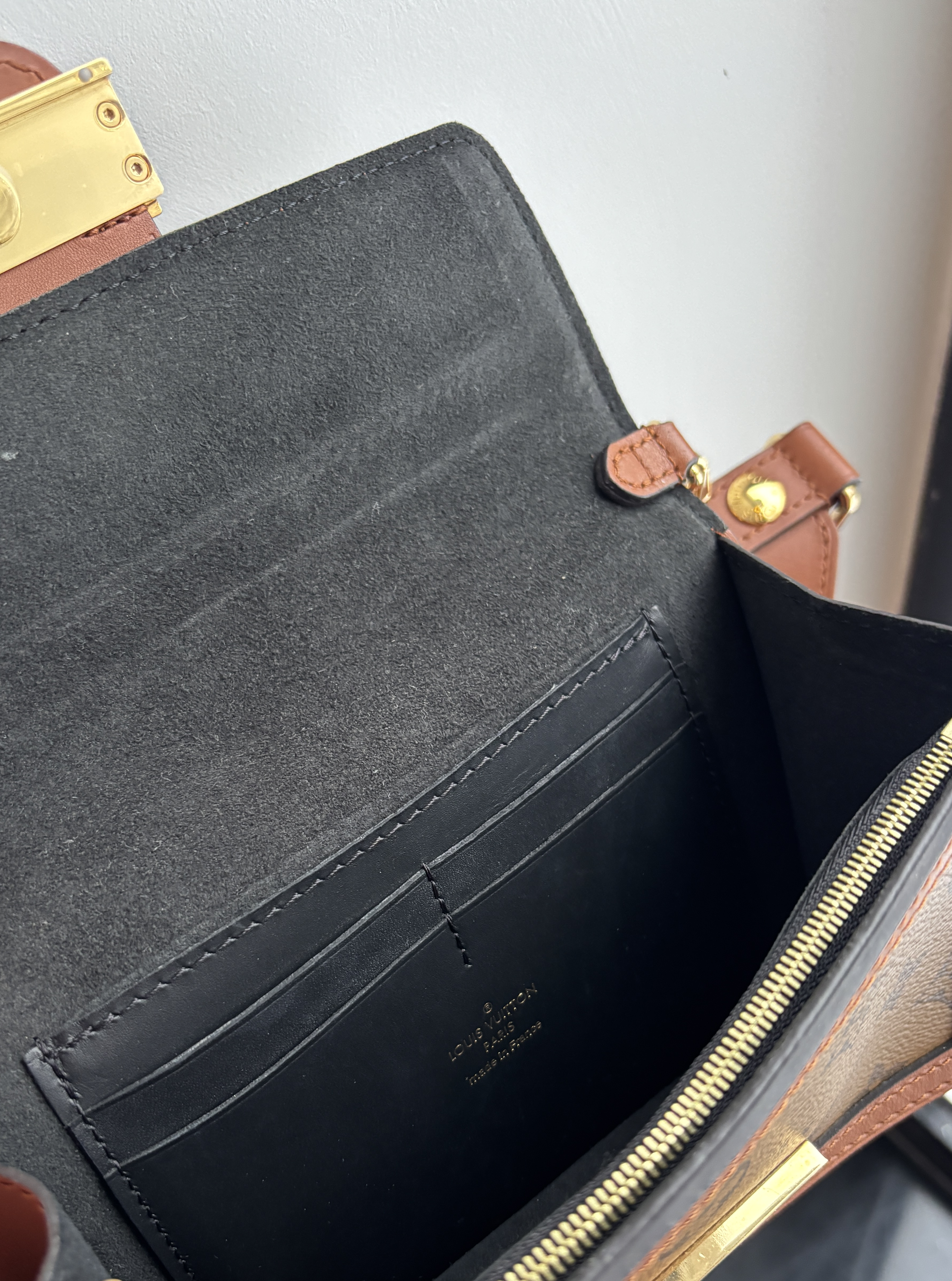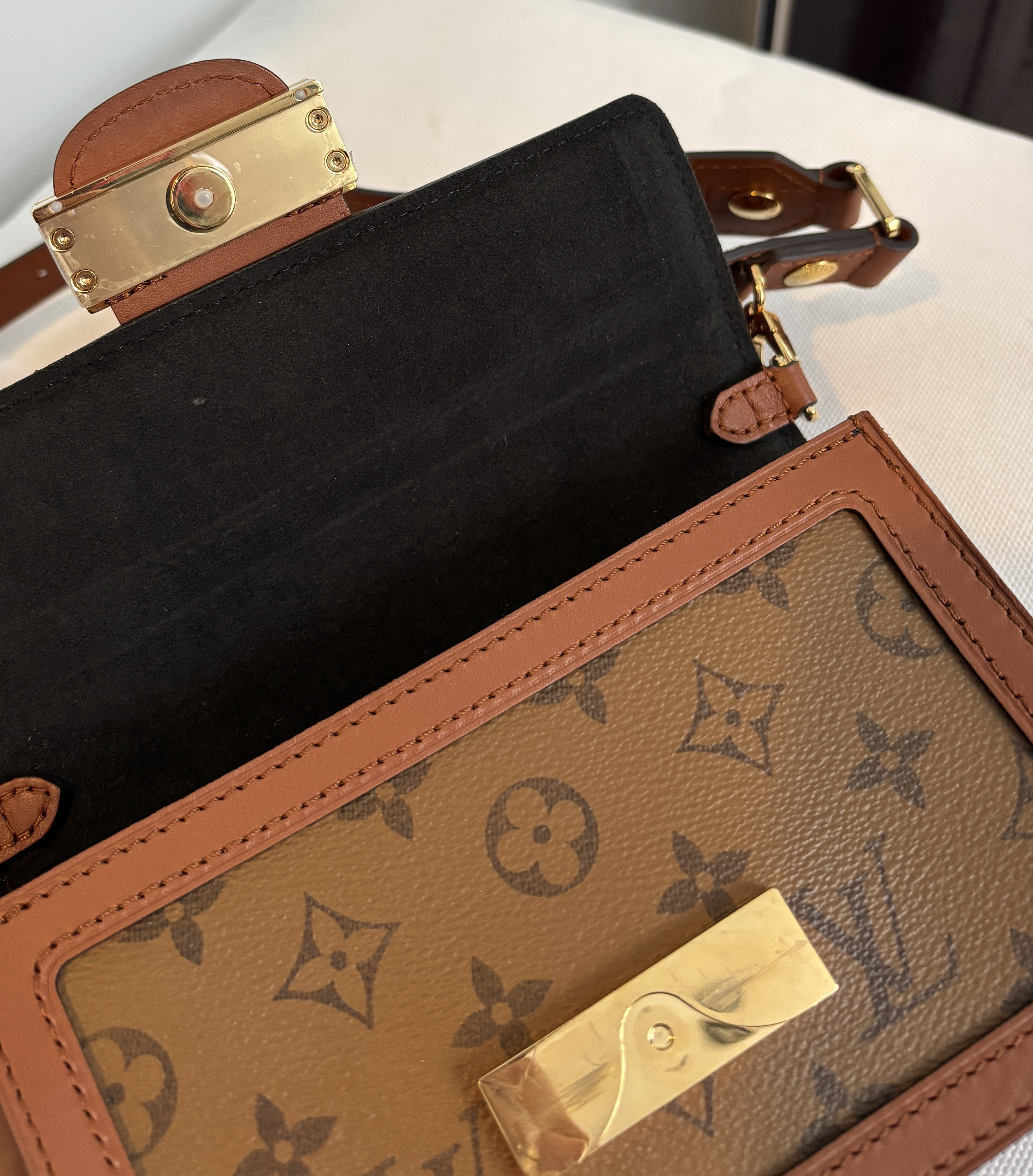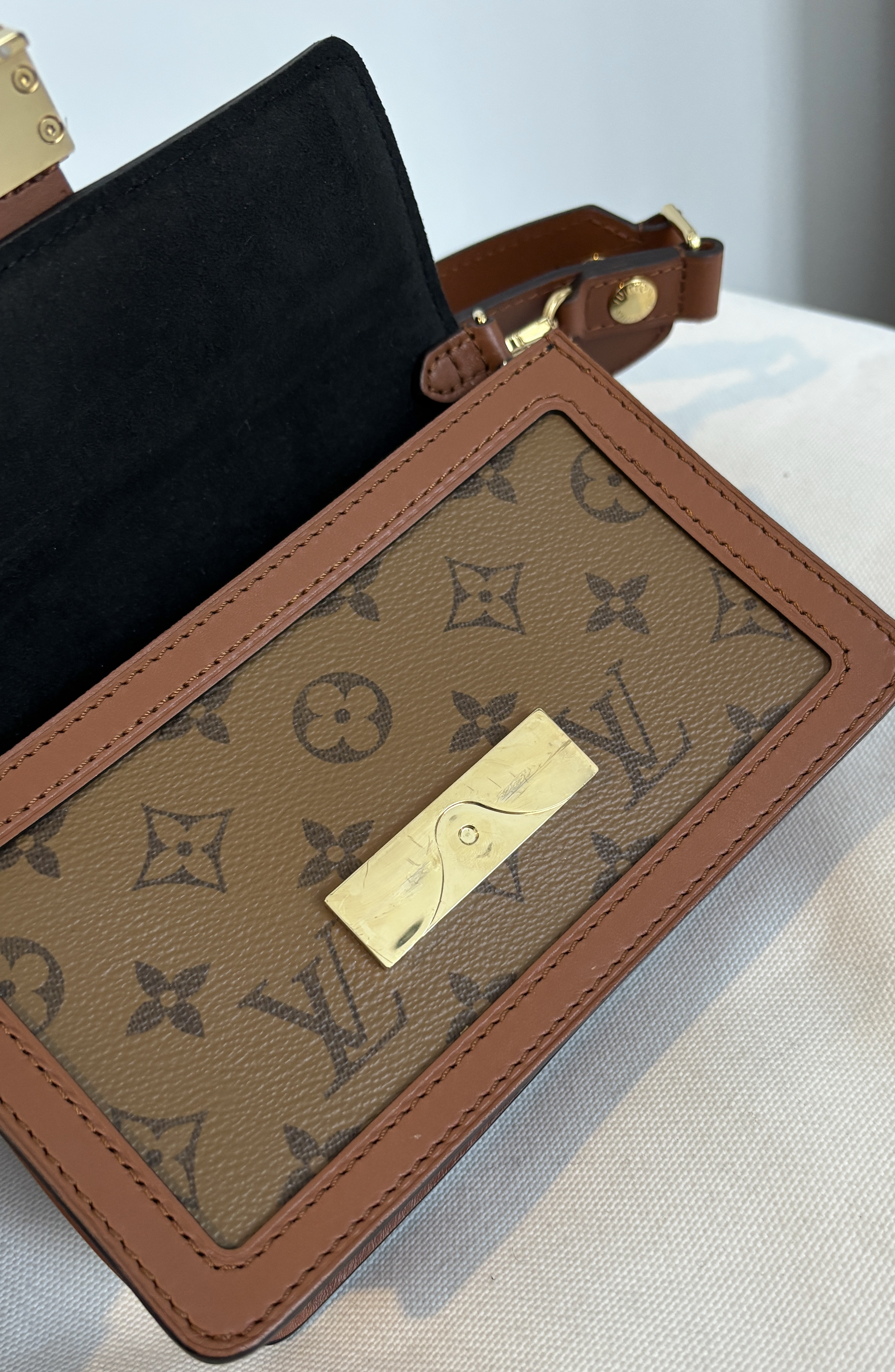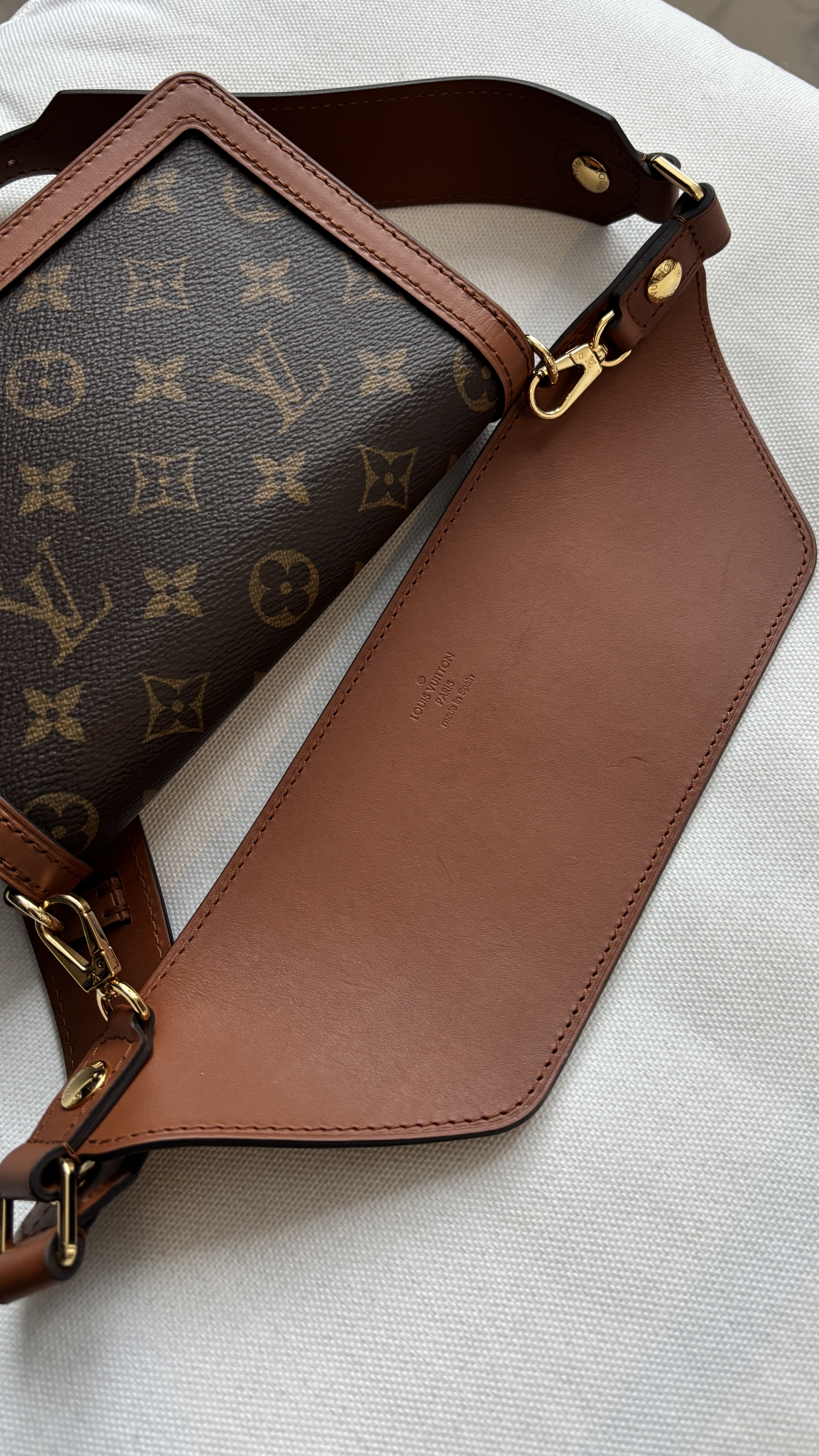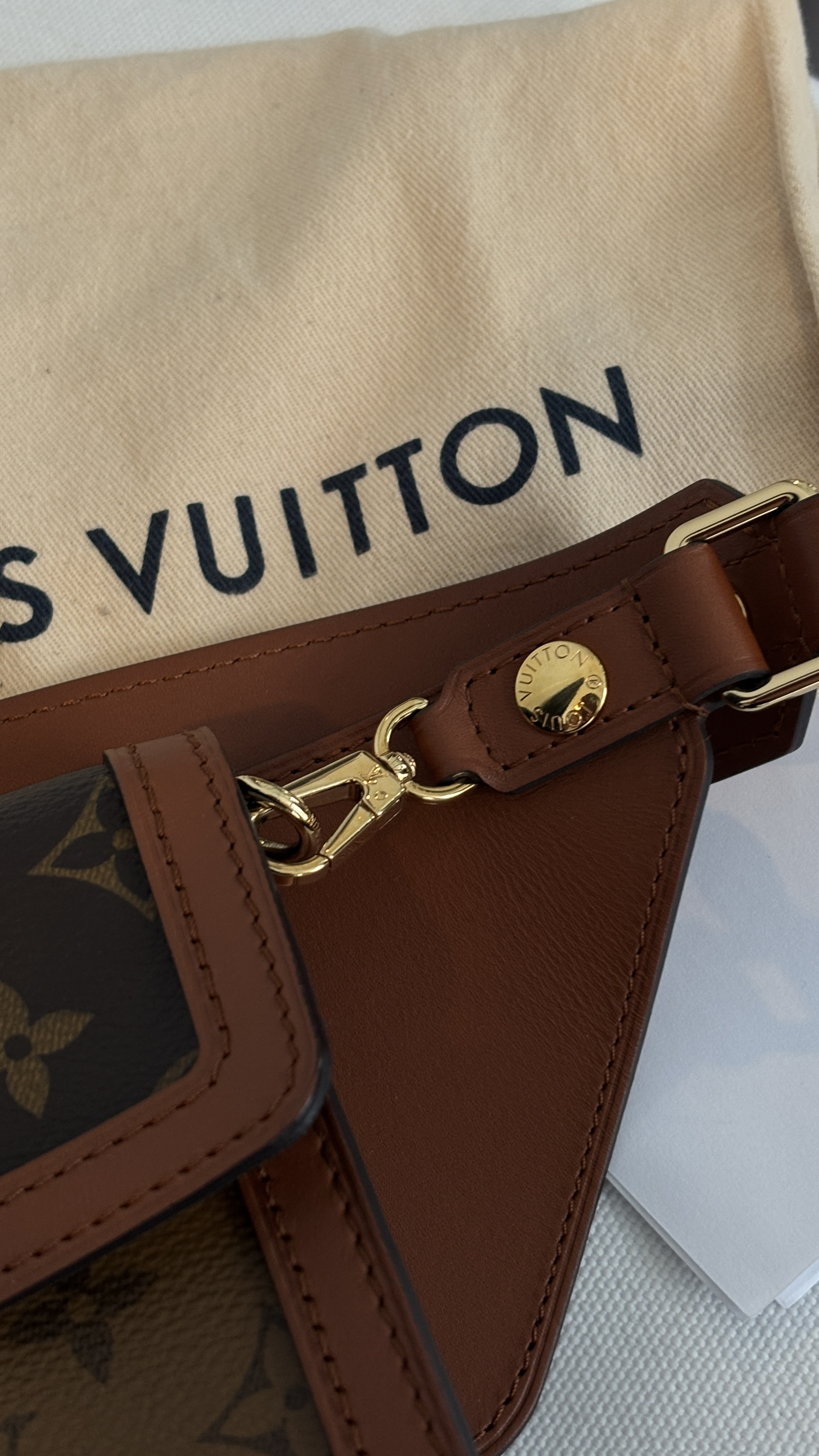 "Model Dauphine belt bag, skórzana camelowa/brązowa nerka z dwoma odcieniami monogramu, złote okucia, zapinana na zatrzask, worek przeciwkurzowy w komplecie oraz potwierdzenie zakupu ( duplikat z butiku Louis Vuitton), stan bardzo dobry. Wymiary: wysokość 12,5 cm , szerokość 19 cm, głębokość 6 cm"