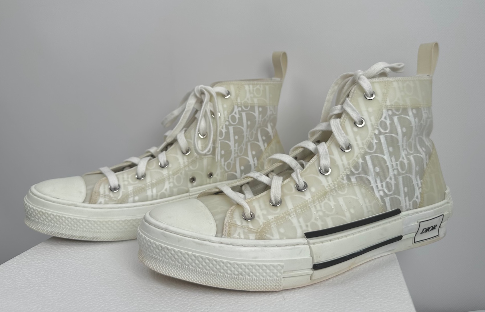 "Białe logowane trampki, zaokrąglone noski, sznurowane, gumowe transparentne wstawki, czarne logo marki po zewnętrznej stronie, w zestawie z workami przeciwkurzowymi oraz pudełkiem, używane. Stan bardzo dobry, lekkie zabrudzenia na sznurówkach oraz w tylnej części. Rozmiar 43."