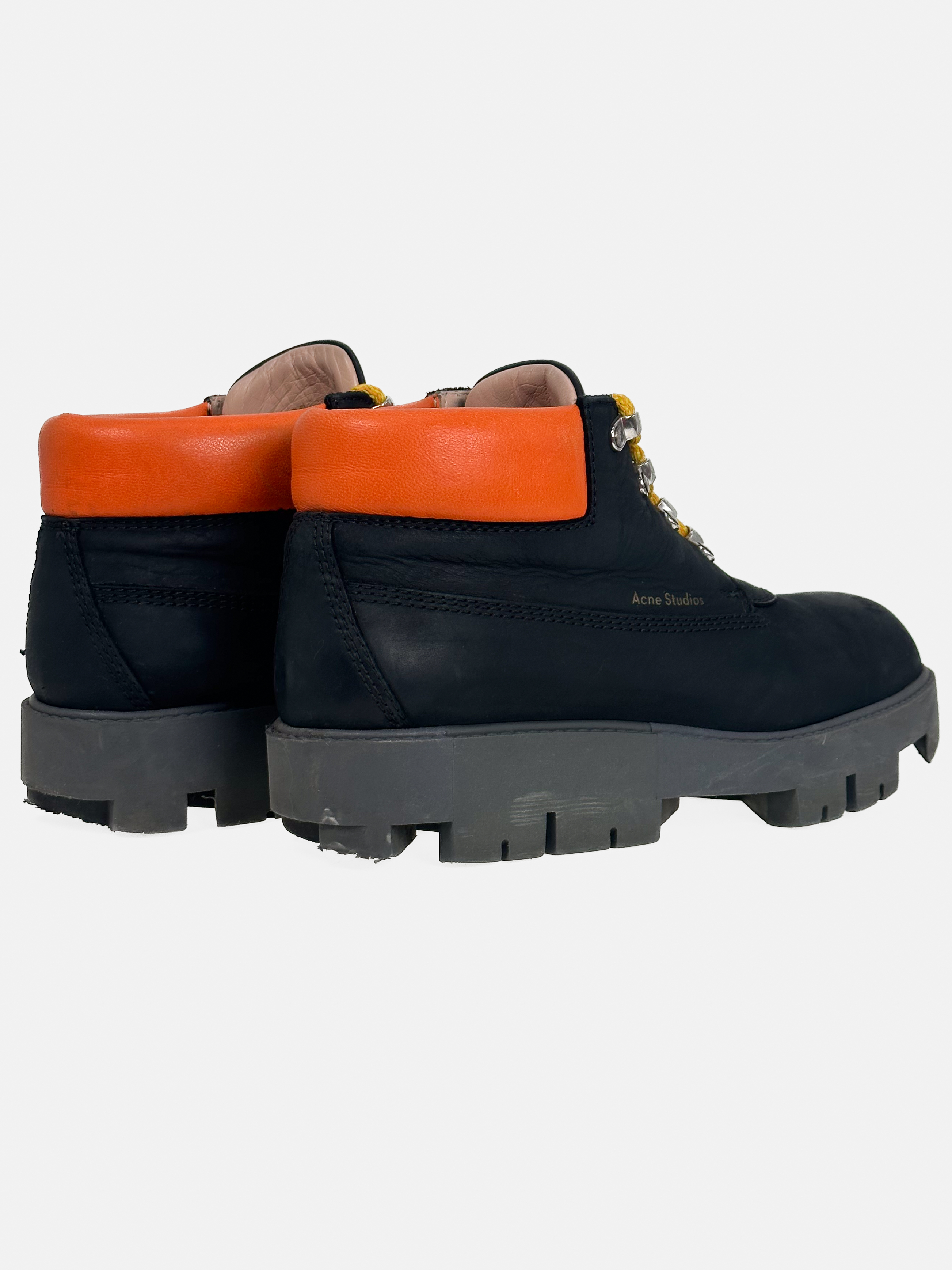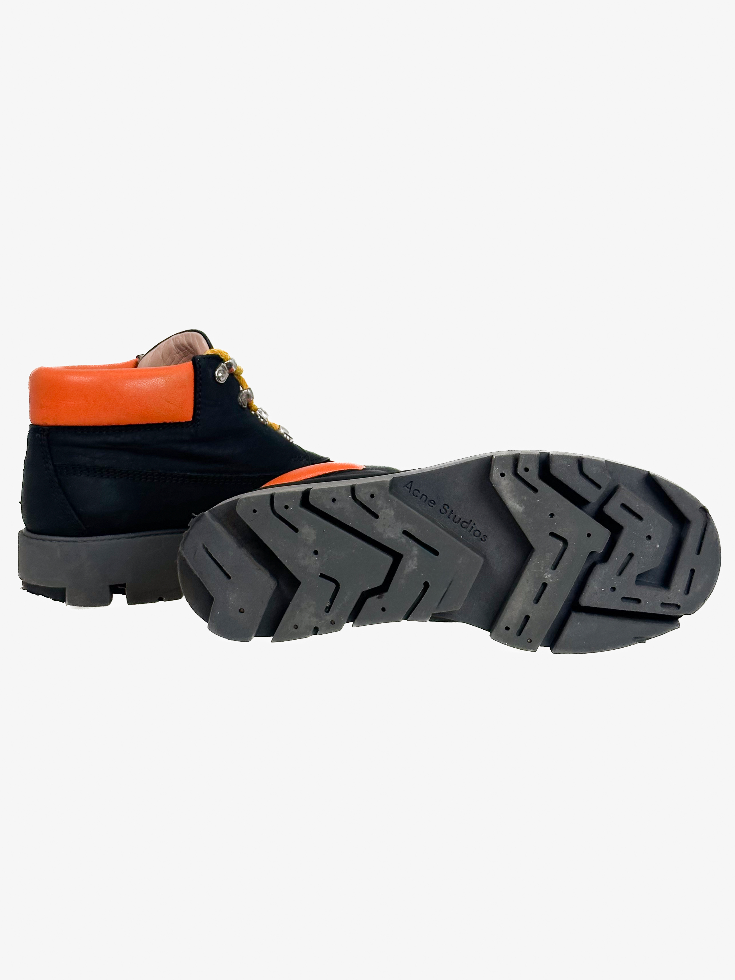 "Granatowe trapery, wiązane na żółte sznurówki, skórzana zapiętka w kolorze pomarańczowym, delikatne logo marki w bocznej części, zaokrąglone noski. Rozmiar 39. Stan bardzo dobry, delikatne przetarcia na podeszwie oraz marszczenia na skórze."