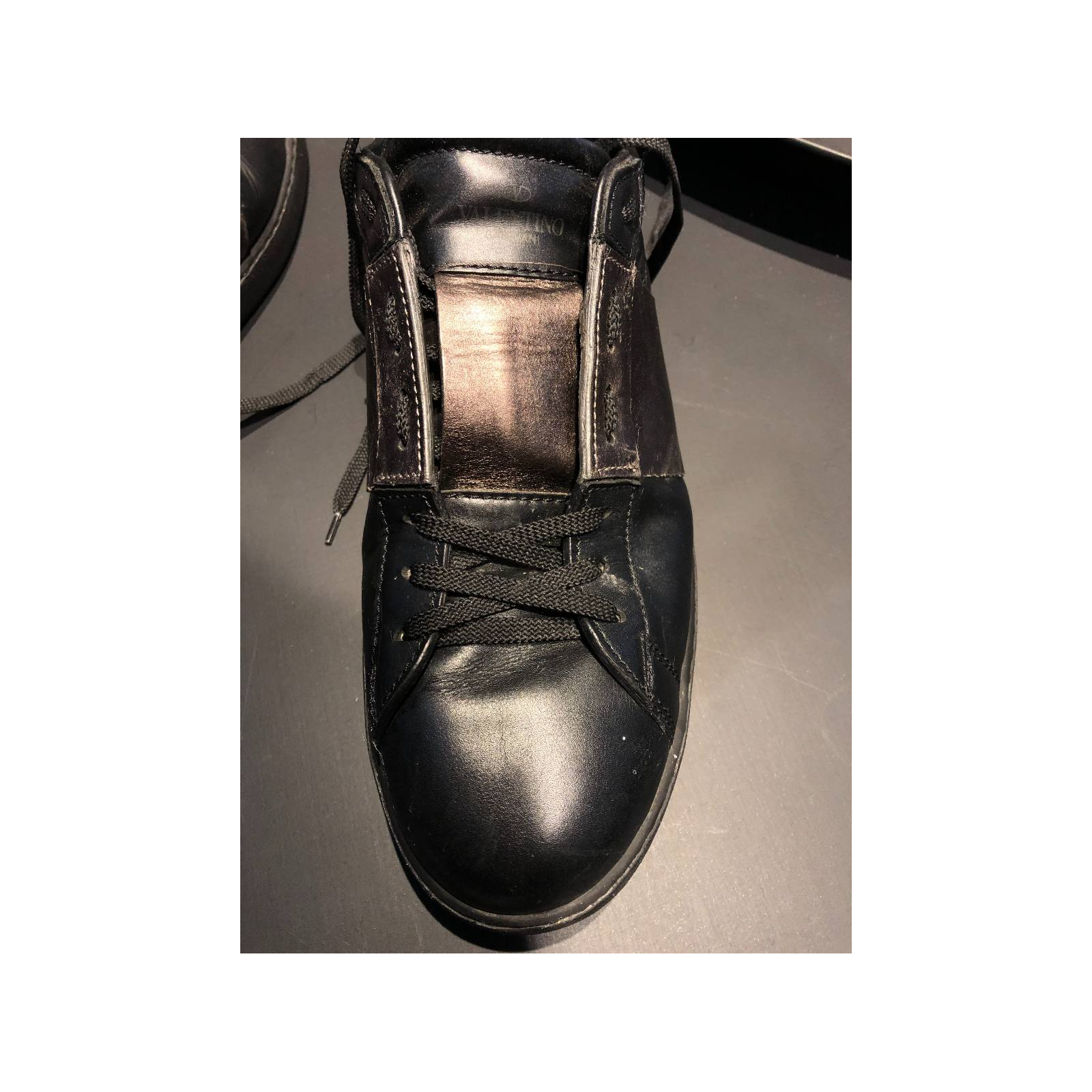 "Czarne skórzane sneakersy, metaliczna wstawka, ćwieki. Rozmiar z metki 45. Będzie idealny na 45,5 - 46.