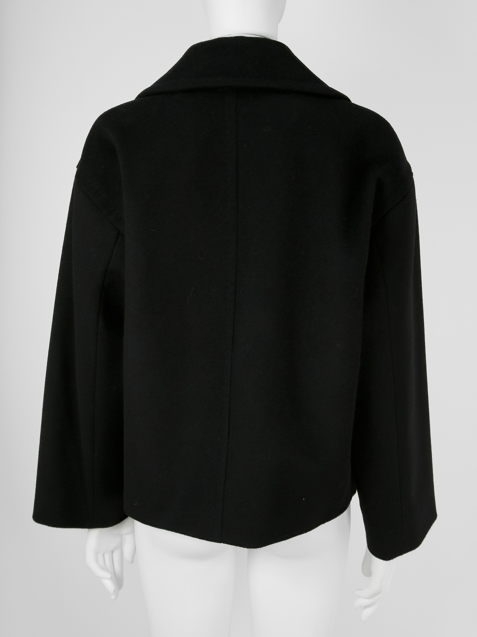 "Czarna wełniana bosmanka, zapinana na kryte zatrzaski, krój oversize, kołnierz, dwie kryte kieszenie po bokach, dekolt w serek, wykończona stębnowaniem, logowana podszewka. Stan nowy z metką. Rozmiar z metki IT 44. Skład: 100% wełna dziewicza; podszewka: 70% acetat, 30% poliester. Wymiary: szerokość mierzona do pachy do pachy 61cm, długość całkowita 62cm."