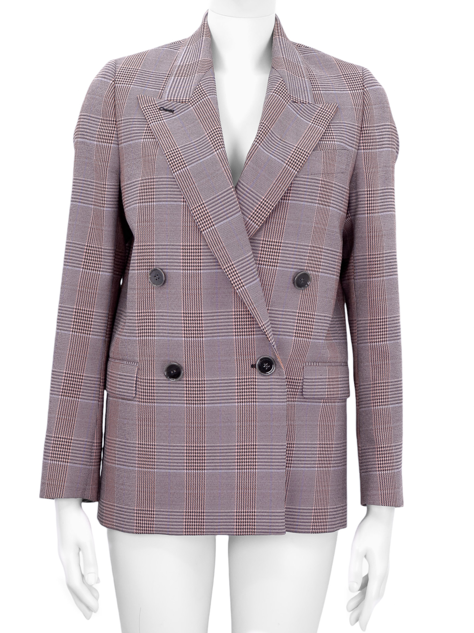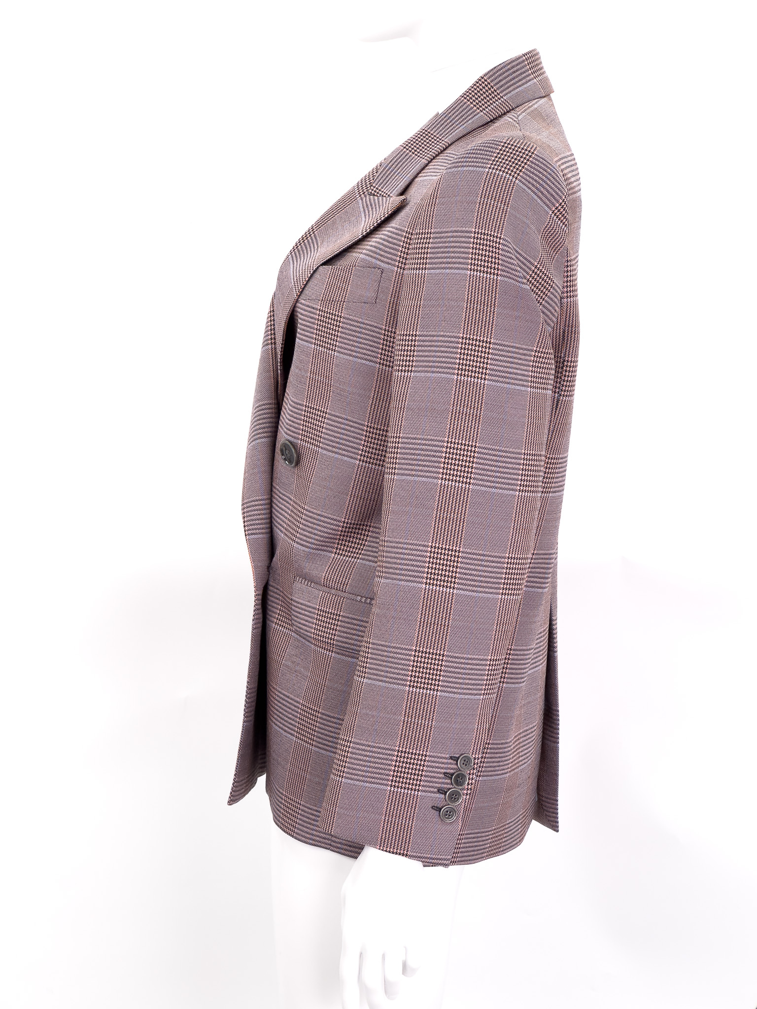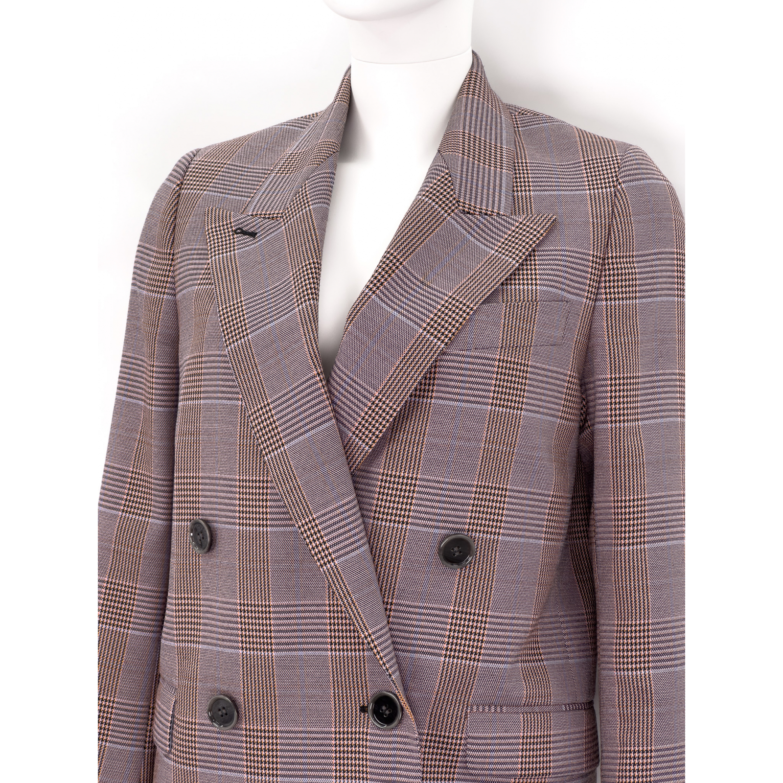 "Wełniana marynarka w kratę w odcieniach fioletu, pomarańczu, niebieskiego oraz czerni, dwurzędowa, dwie zaszyte kieszenie z klapami, błękitna podszewka. Rozmiar z metki 34. Skład: 51% wełna, 49% poliester; podszewka: 100% wiskoza. Wymiary: szerokość mierzona od pachy do pachy 50cm, długość całkowita 71cm."