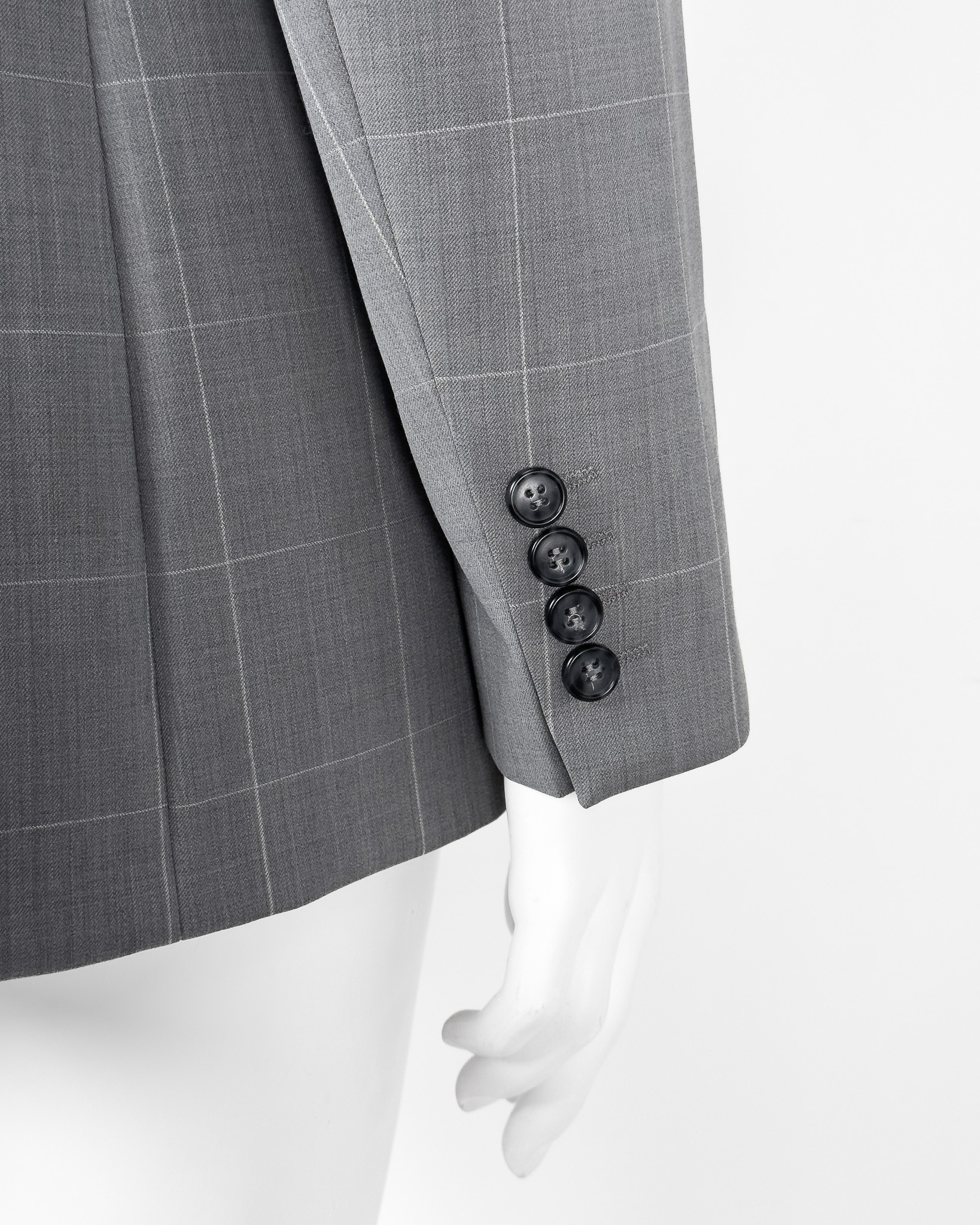 "Szara wełniana marynarka w delikatną białą kratę, zapinana na dwa guziki, dekolt w szpic, poduszki na ramionach, mankiety ozdobione guzikami, dwie zaszyte kieszenie z klapami po bokach, taliowana, rozporek. Stan nowa z metką. Rozmiar z metki IT 42. Skład: 100% wełna; podszewka: 70% acetat, 30% poliester."
