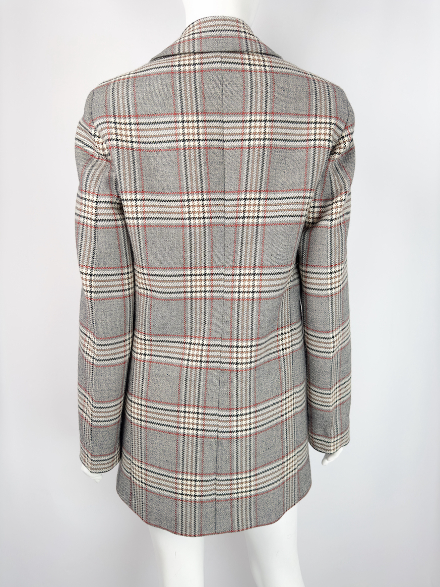 "Szara wełniana marynarka w kratę w odcieniach czerwieni, bieli, czerni oraz brązu, proste rękawy, zapinana na dwa guziki na przodzie, regulowany pasek w pasie, podszewka w kolorze słomkowym, dwie kieszenie z klapami na przodzie, poduszki na ramionach, głęboki dekolt w szpic, jedna zaszyta kieszeń na wysokości biustu. Rozmiar z metki EU 34. Skład: 100% wełna dziewicza; podszewka: 100% wiskoza. Wymiary: długość rękawa 65cm, długość całkowita 79cm, szerokość mierzona od pachy do pachy 49cm."