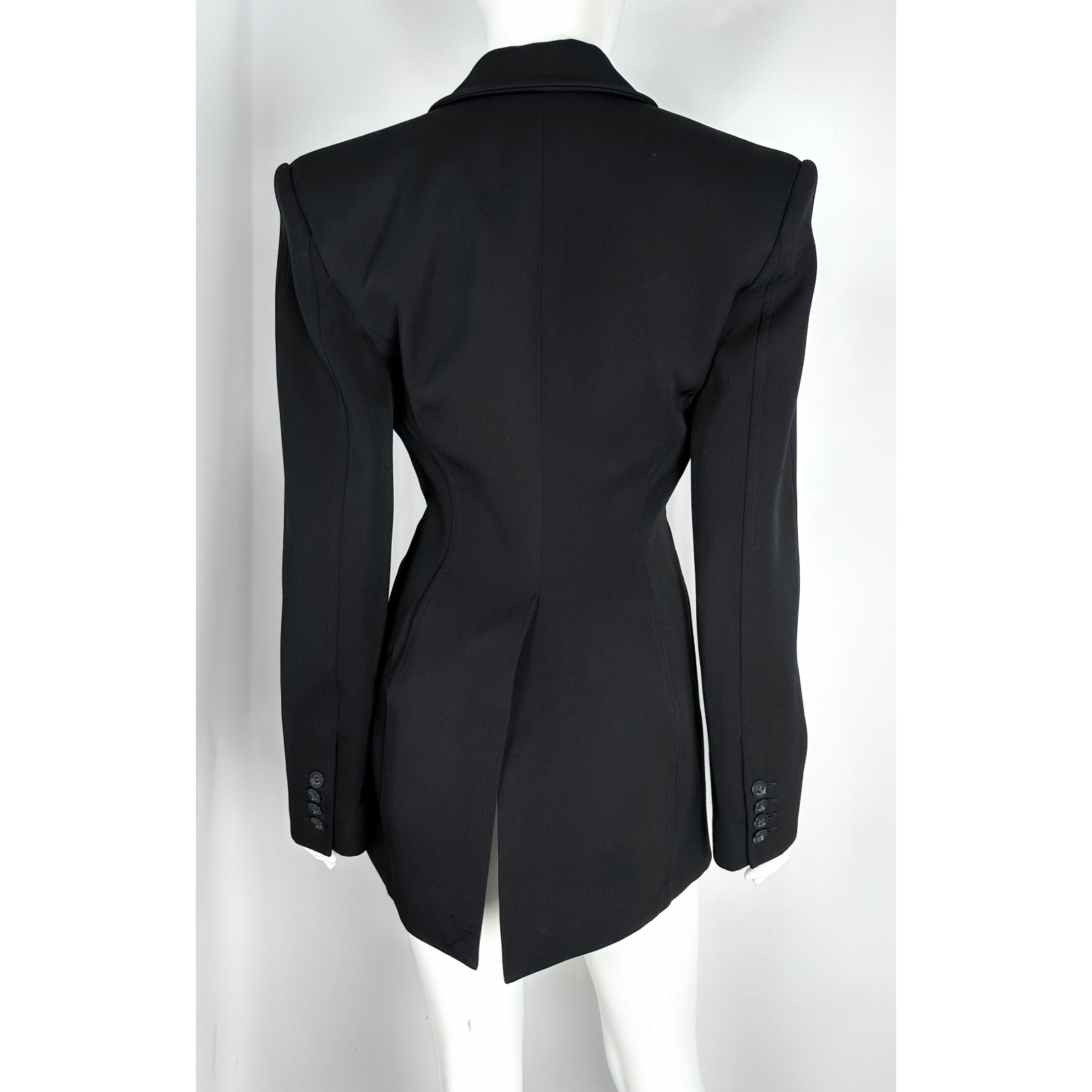 "Czarna wełniana marynarka ozdobiona dużymi wycięciami po bokach zamiast kieszeni, szpiczasty kołnierz, zapinana na jeden kryty logowany guzik, duże poduszki na ramionach, rozporek, rozpinane mankiety, taliowana, dekoracyjne przeszycia. Rozmiar z metki IT 34. Skład: 100% wełna; podszewka: 100% kupro. Wymiary: szerokość mierzona od pachy do pachy 45cm, szerokość mierzona na linii ramion 47cm, długość całkowita 73cm."