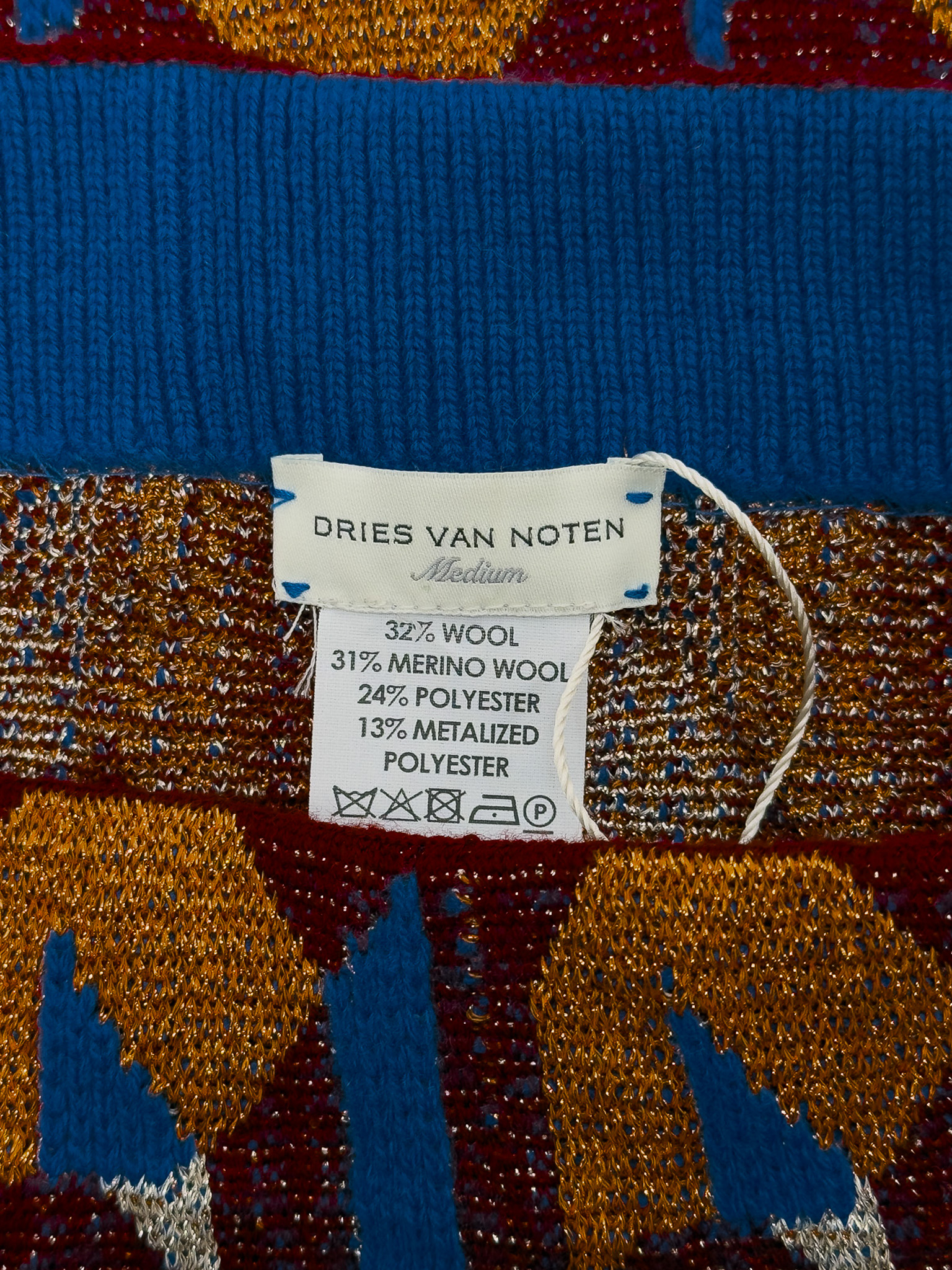"Niebieska wełniana spódnica w błyszczący pomarańczowo-bordowo-srebrny wzór, prosty, dopasowany krój, za kolano, guma w pasie. Stan bardzo dobry. Rozmiar z metki M. Skład: 32% wełna, 31% wełna merynosów, 24% poliester, 13% metalizowany poliester. Wymiary: szerokość w pasie 37cm, długość całkowita 80cm."