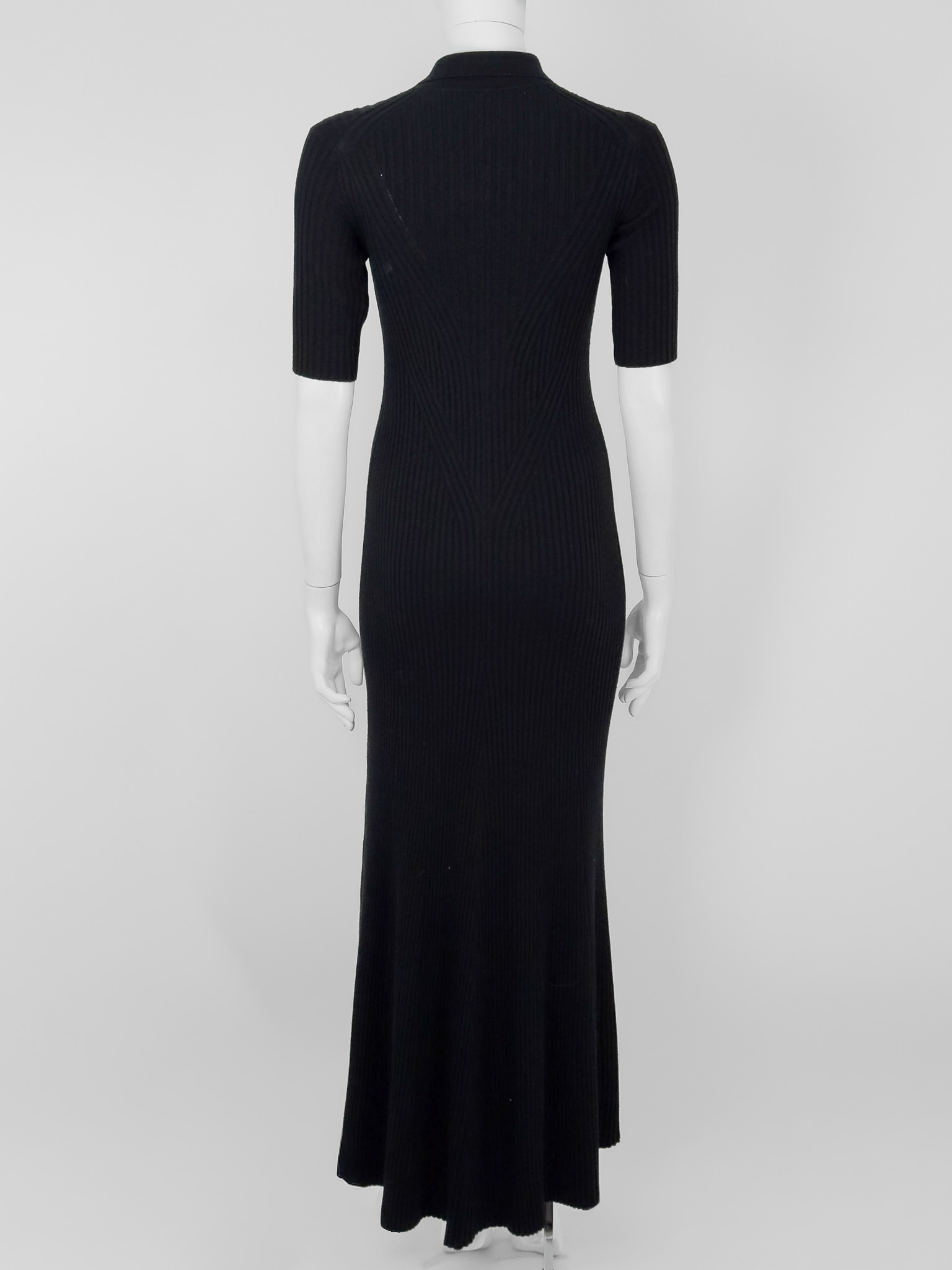 "Czarna wełniana długa prążkowana sukienka z krótkim rękawem, z przodu trzy odpinane guziki wysadzane cyrkoniami, ozdobne wycięcia, rozcięcie na przodzie. Stan nowa z metką. Skład: 90% wełna z merynosów, 10% poliester. Rozmiar z metki S. Wymiary: szerokość mierzona od pachy do pachy 36cm, długość całkowita 145cm."