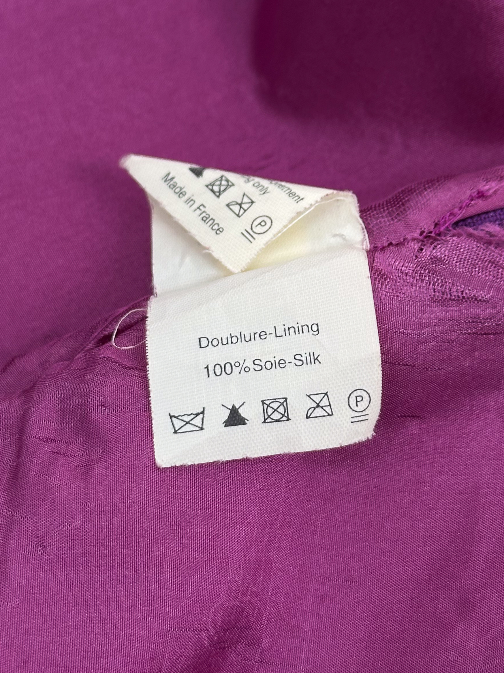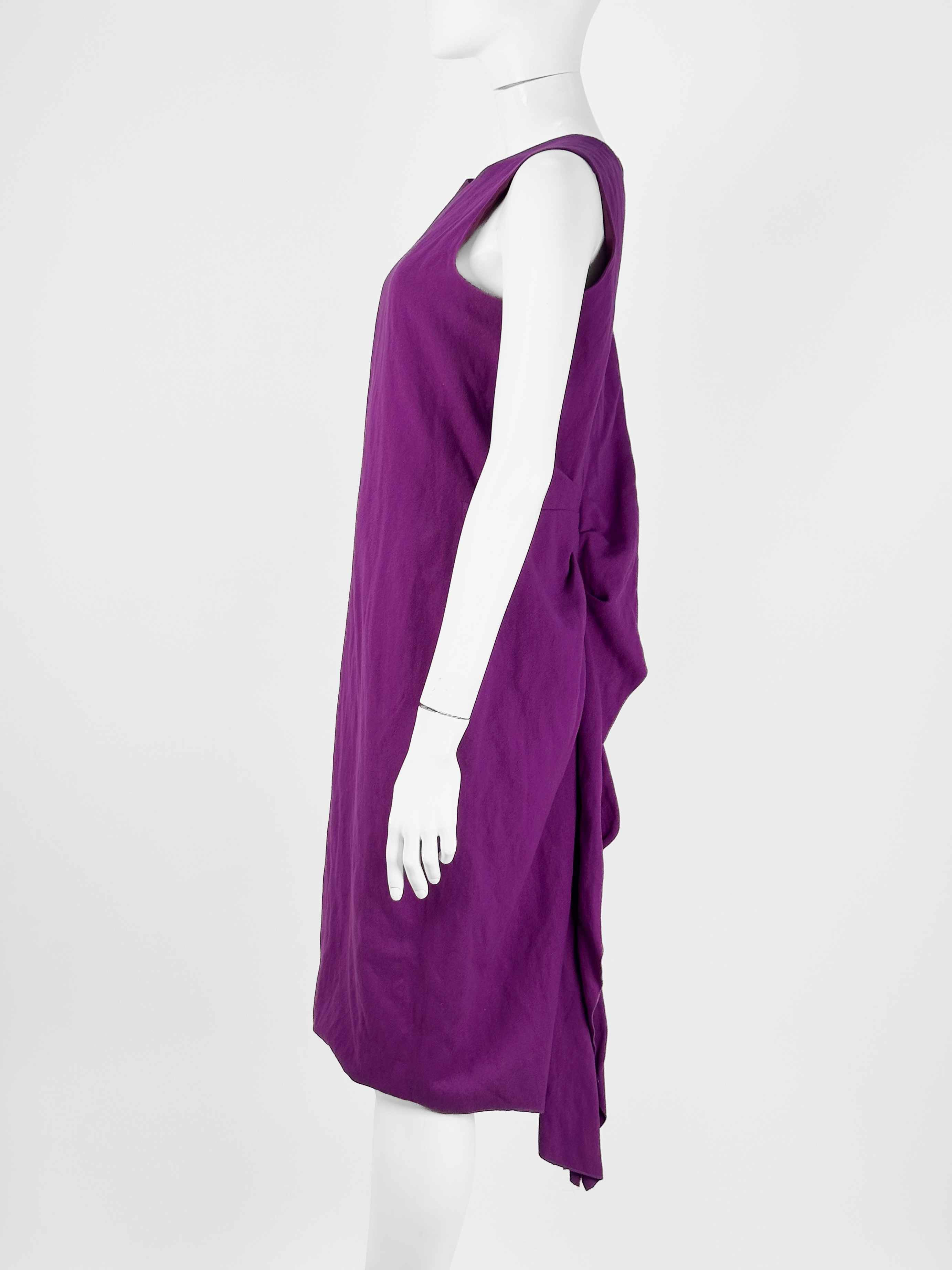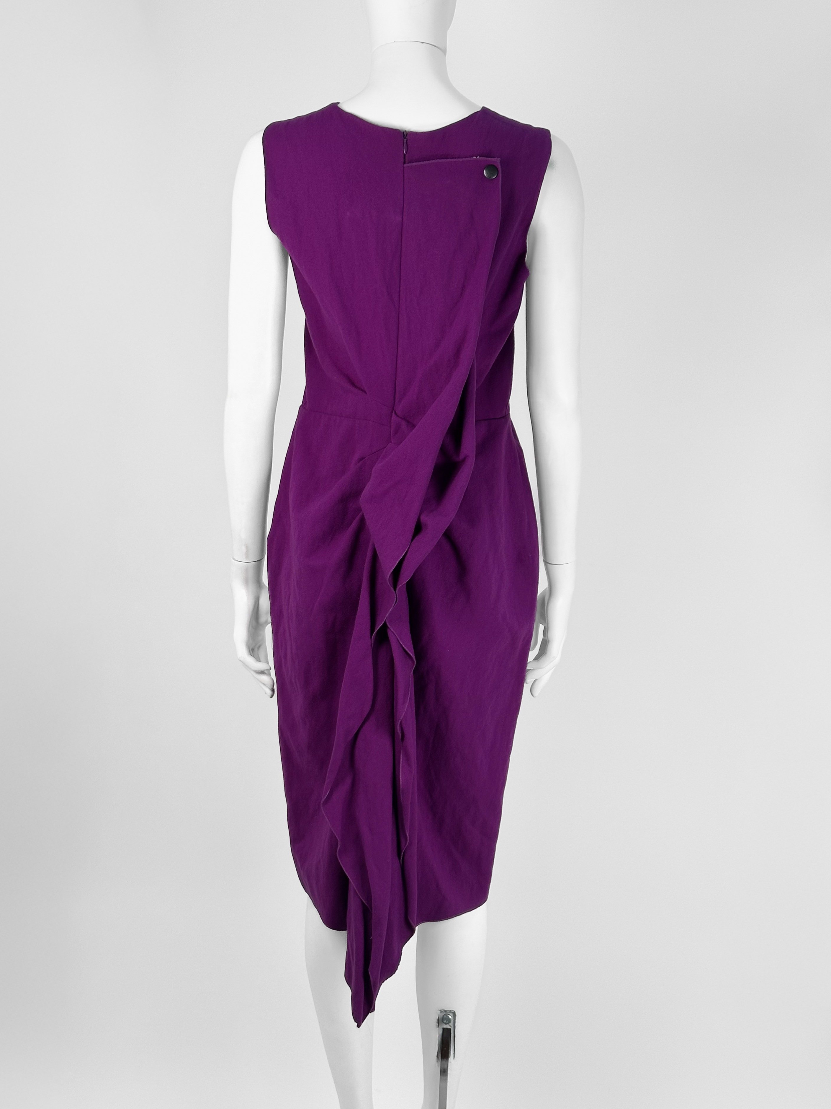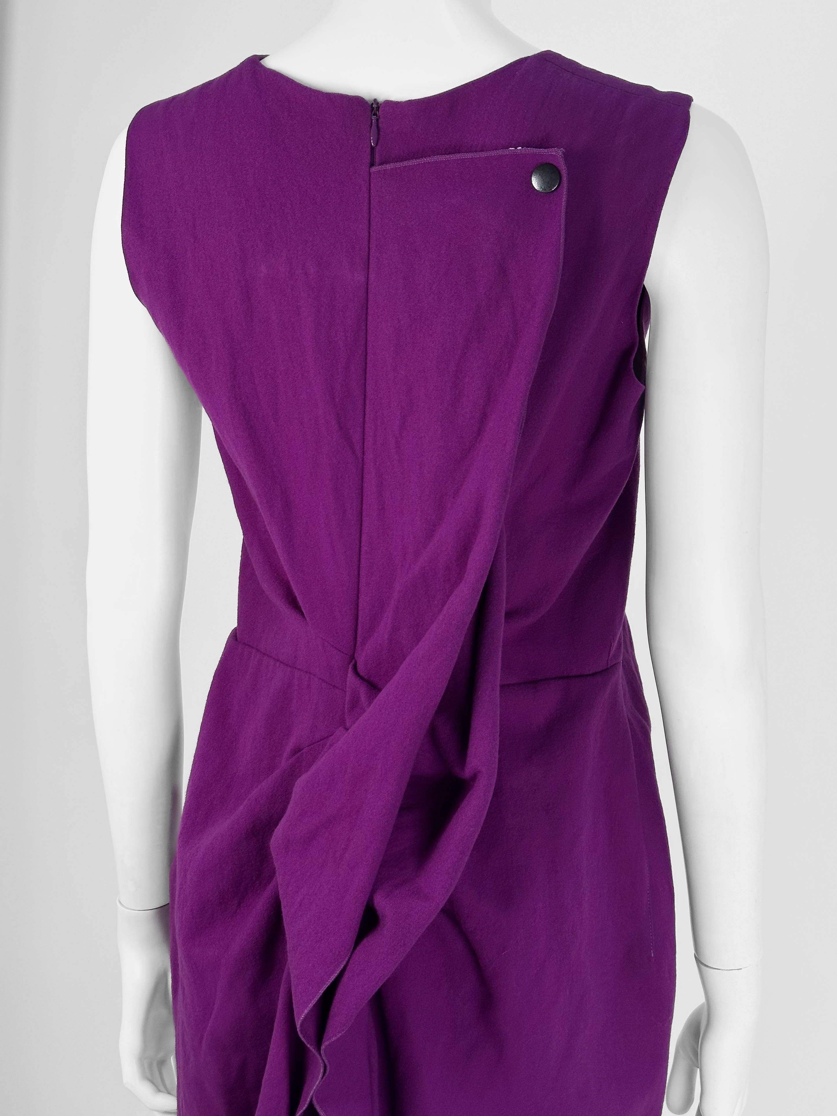 "Fioletowa wełniana sukienka, bez rękawów, asymetryczna, długość midi, ozdobiona falbaną w tylnej części, zapinana na kryty suwak oraz zatrzask. Stan bardzo dobry. Rozmiar z metki FR 40. Skład: 96% wełna, 4% metal; podszewka: 100% jedwab. Wymiary: szerokość mierzona od pachy do pachy 48cm, długość całkowita 106cm."