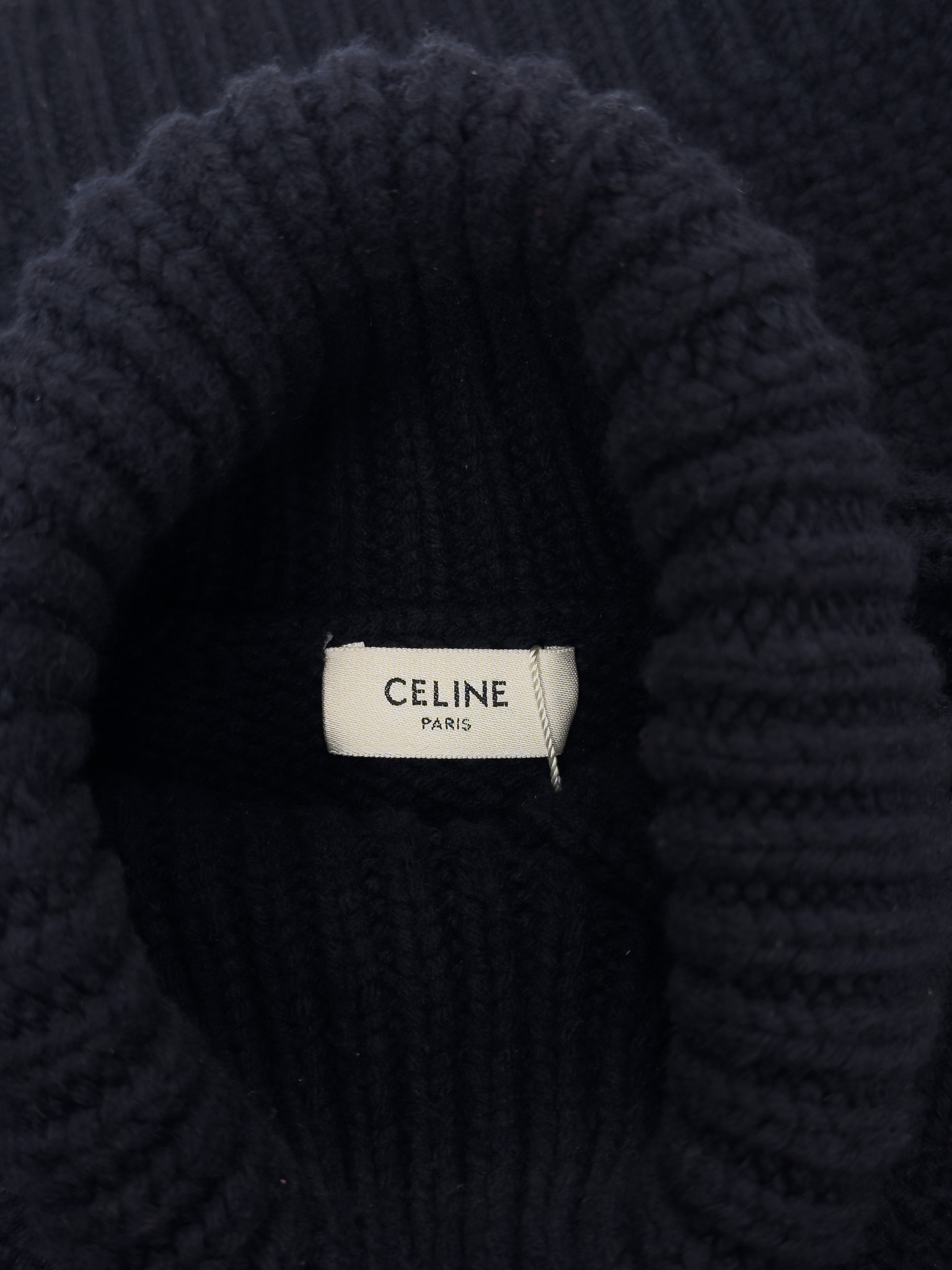 "Granatowy wełniano-kaszmirowy sweter z golfem, ozdobiony warkoczowym splotem na przodzie, krój oversize, wykończony prążkowanym ściągaczem. Stan bardzo dobry. Rozmiar z metki M. Skład: 70% wełna, 30% kaszmir. Wymiary: szerokość mierzona od pachy do pachy 73cm, długość całkowita 52cm."