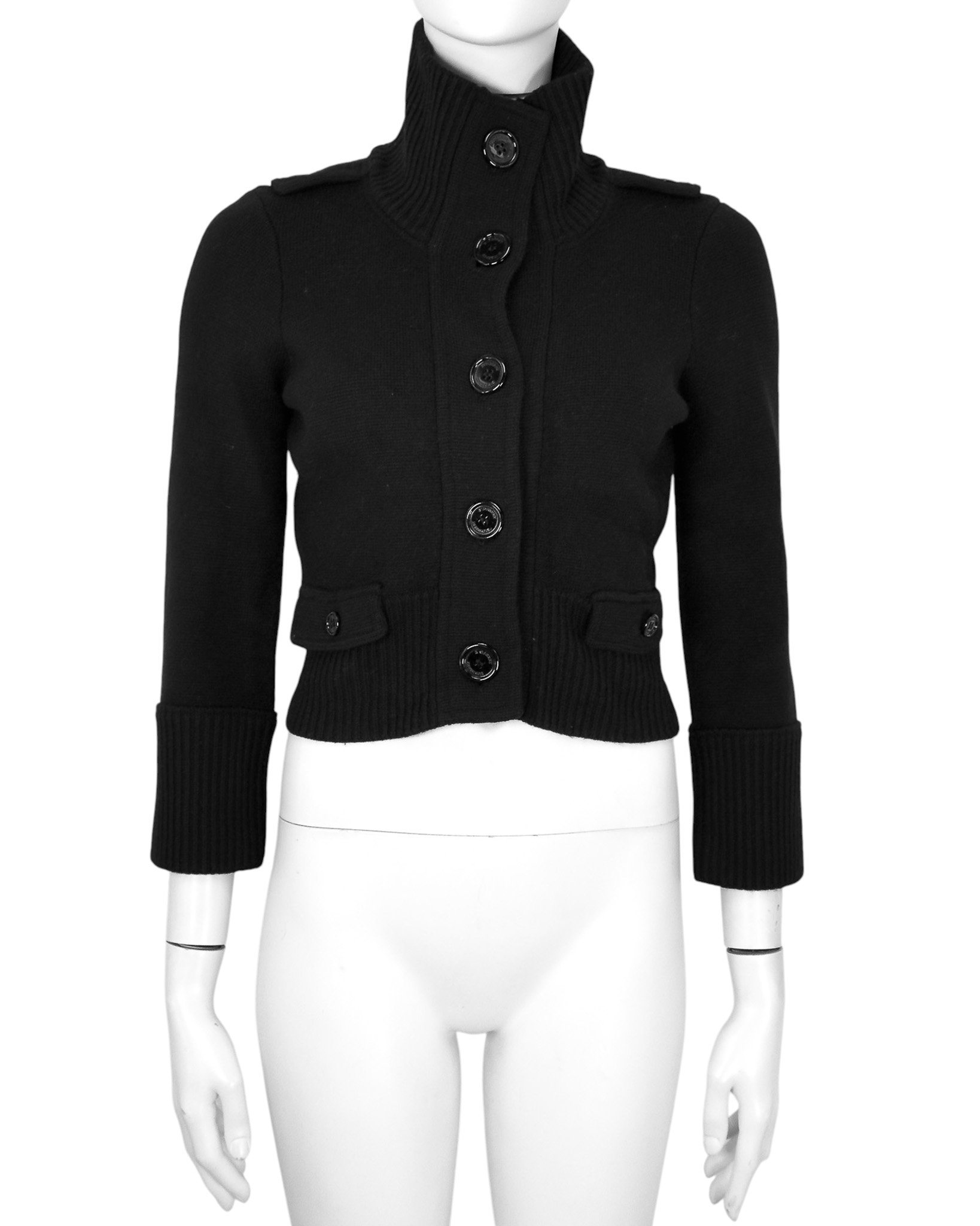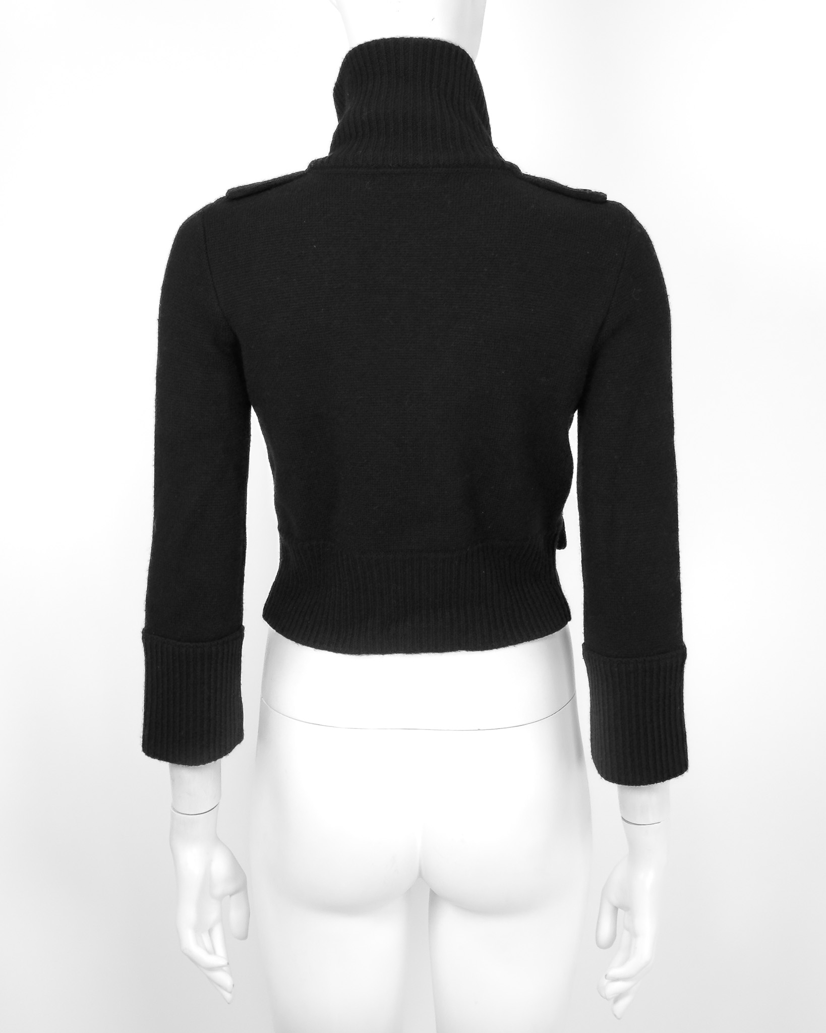 "Czarny wełniany kardigan, zapinany na guziki, golf, w środku wykończony lamówką, dwie kieszenie z klapami po bokach, wykończony prążkowanym ściągaczem. Stan bardzo dobry. Rozmiar z metki S, wypada na mniejszy. Skład: 100% wełna. WYmiary: szerokość mierzona od pachy do pachy 48cm, długość całkowita 43cm."