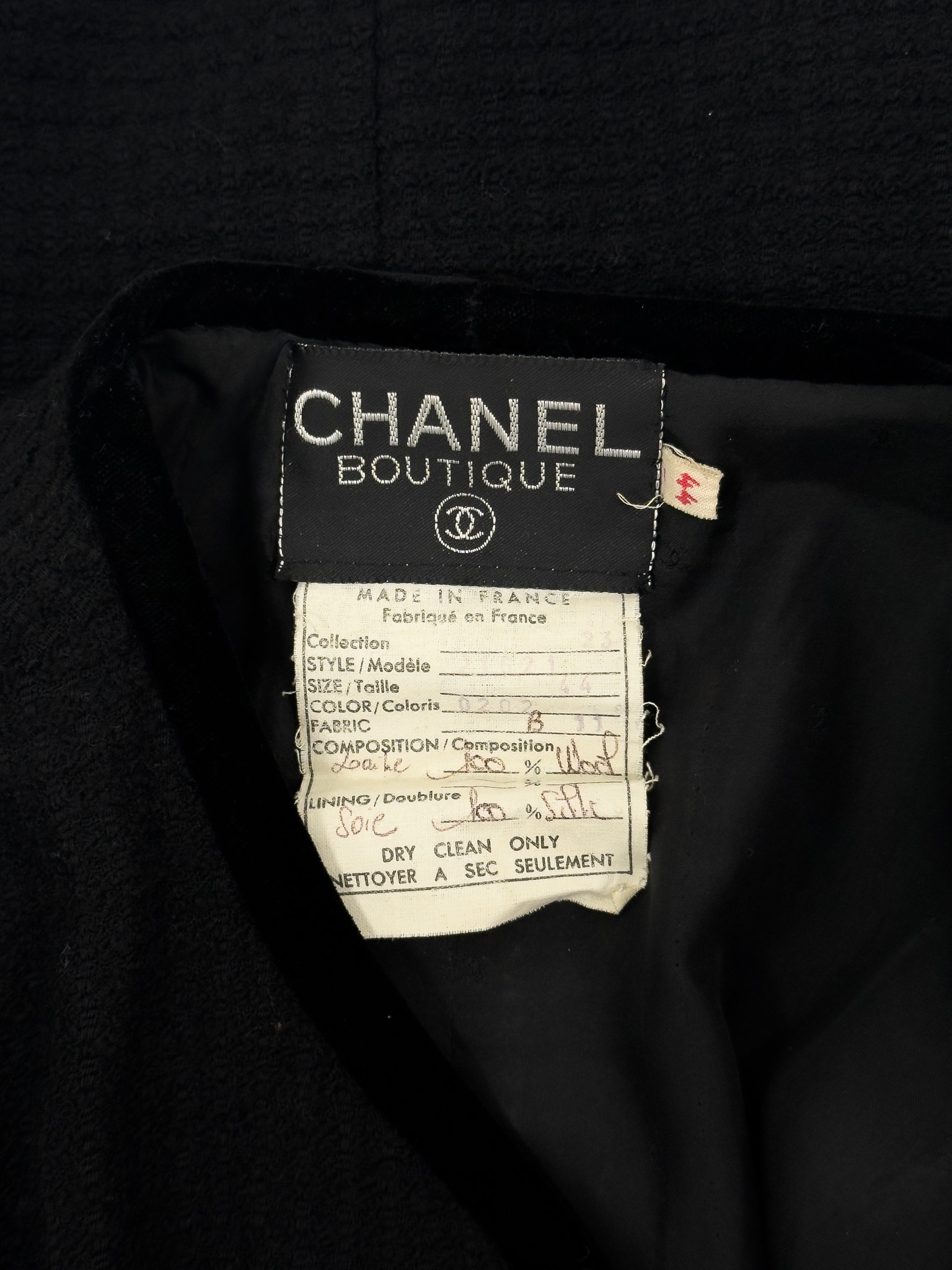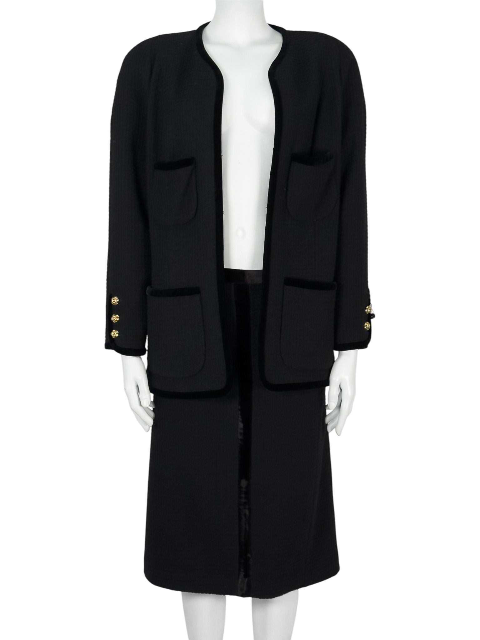 "Czarny, tweedowy, wełniany komplet: żakiet i ołówkowa spódnica. VINTAGE, wykończony welurowymi lamówkami, żakiet zapinany na kryte haftki, posiada cztery kieszonki oraz poduszki w barkach. Stan bardzo dobry, brakuje jednego oczka przy haftce. Rozmiar z metki FR 44. Skład: 100% wełna, podszewka 100% jedwab. Wymiary: szerokość mierzona od pachy do pachy 55cm, długość całkowita 74cm; wymiary spódnicy: szerokość w pasie 47cm, długość całkowita 65cm."