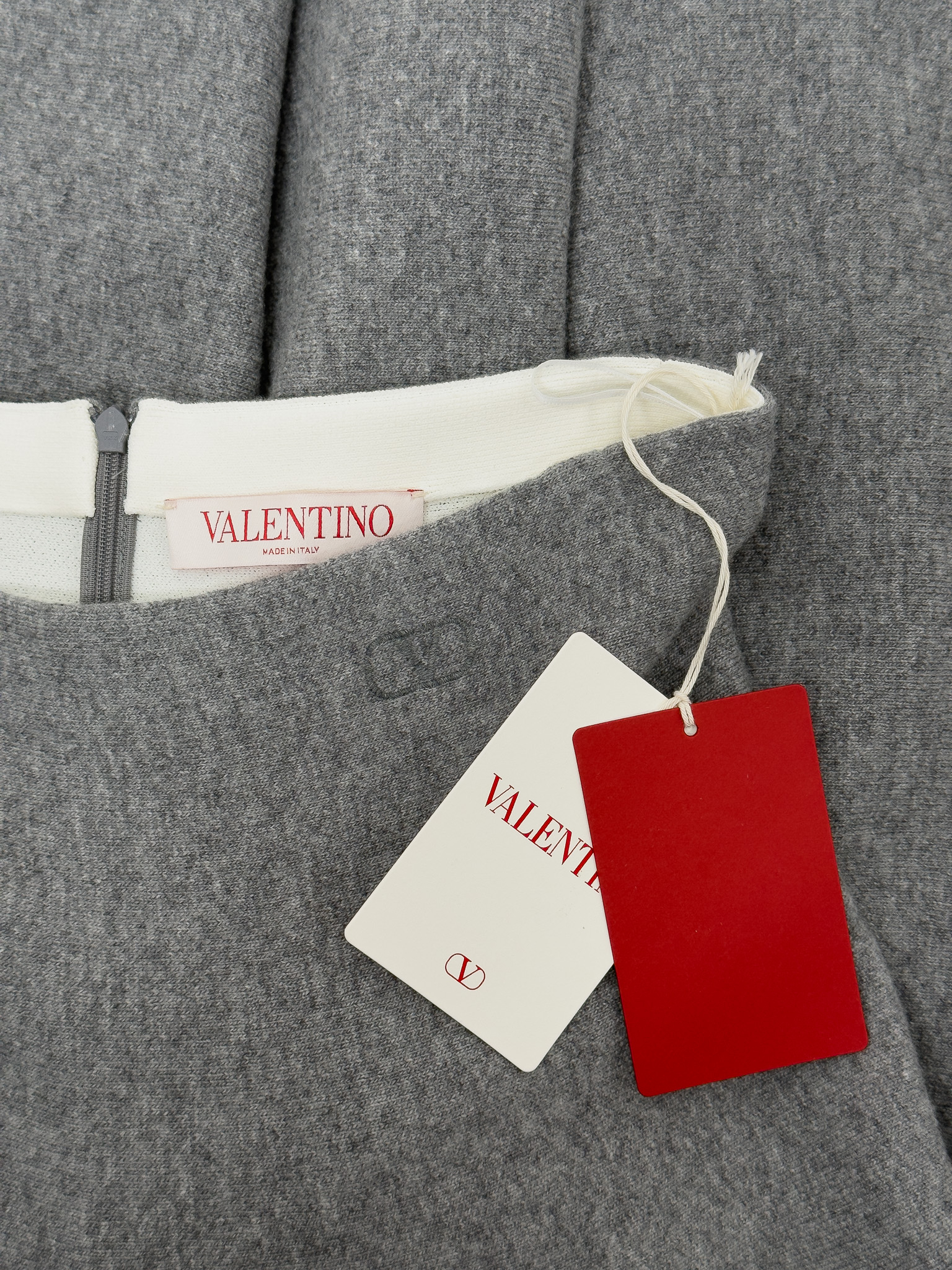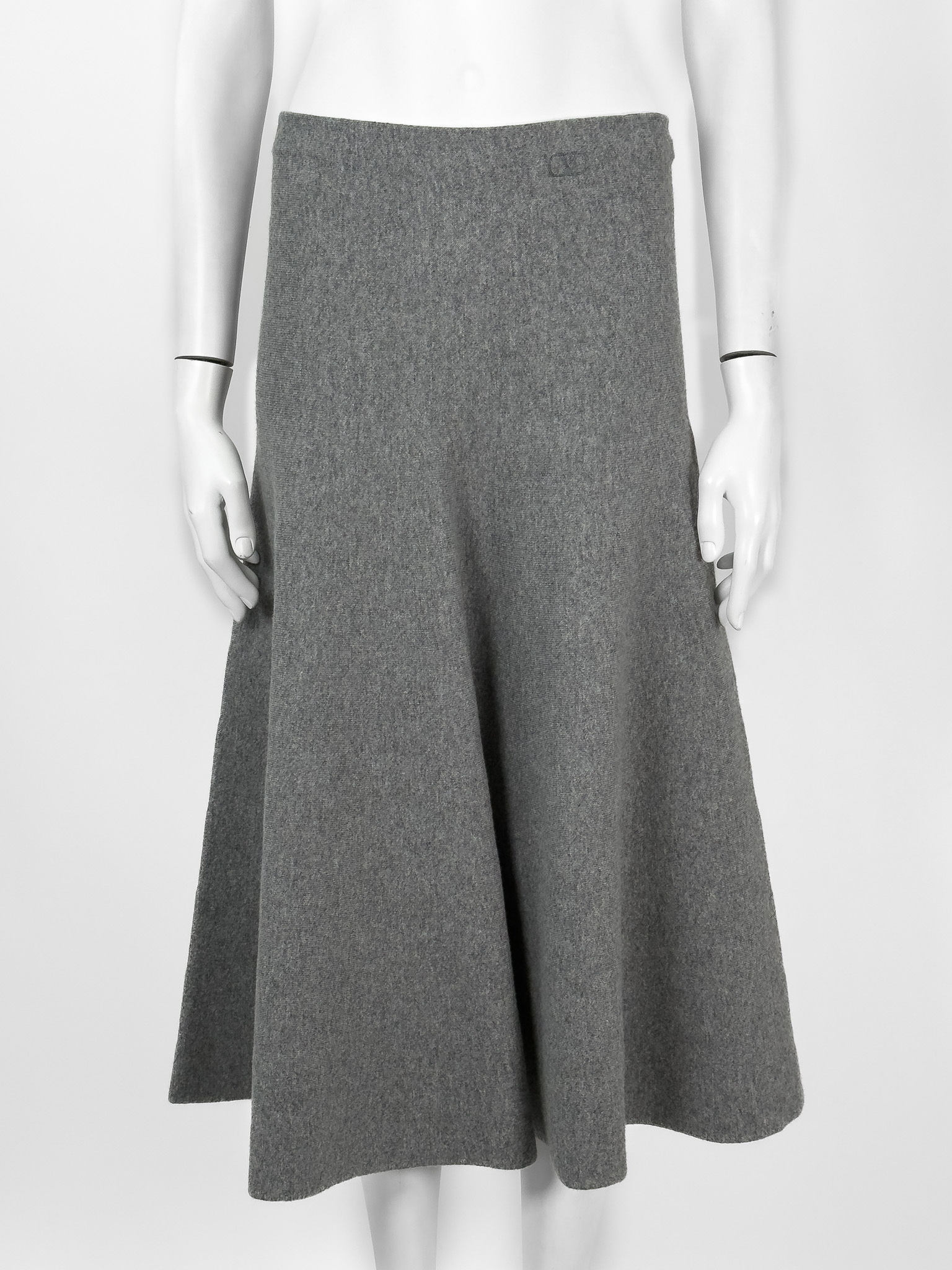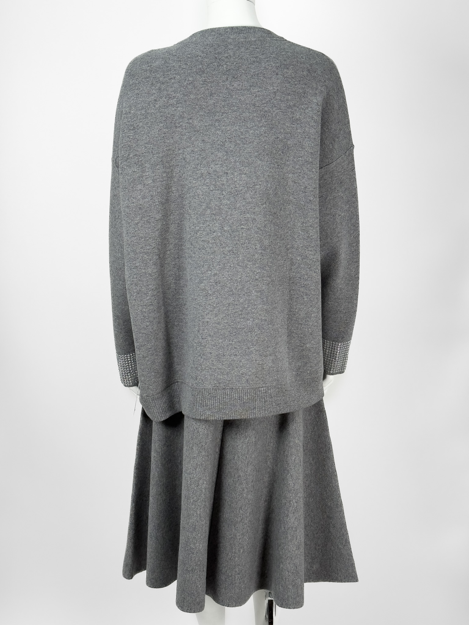"Szary, wełniany komplet: bluza i spódnica. Bluza, krój oversize, rękaw wykończony sztucznymi diamencikami. Spódnica, krój litery A, delikatnie logowana na górze. Stan nowy z metkami. Rozmiar z metki L. Skład: 50% wełna, 38% wiskoza, 6% poliester, 5% poliamid, 1% elastan. Wymiary bluzy: szerokość mierzona od pachy do pachy 75cm, długość całkowita 75cm; wymiary spódnicy: szerokość w pasie 34,5cm, długość całkowita 81cm."