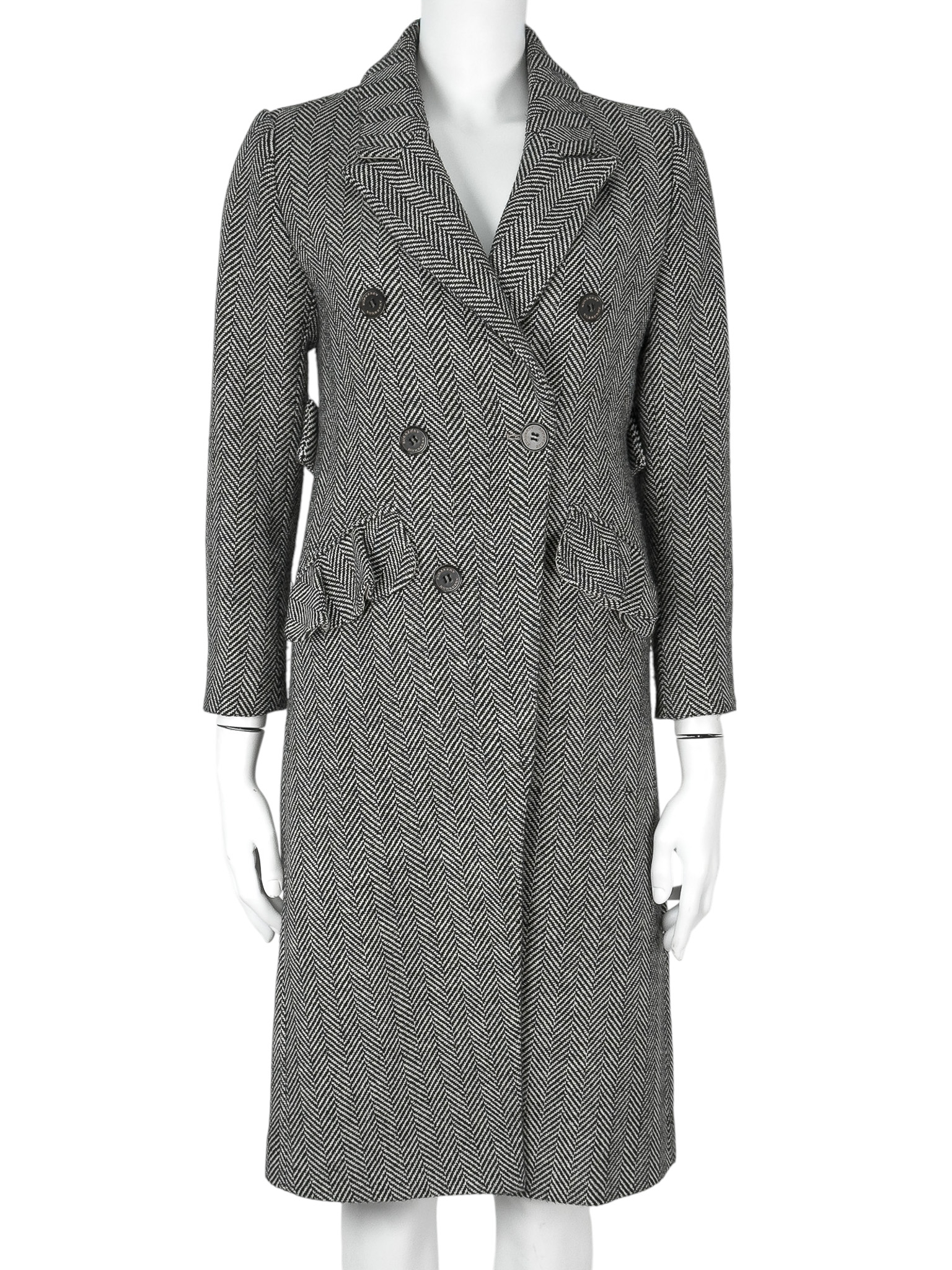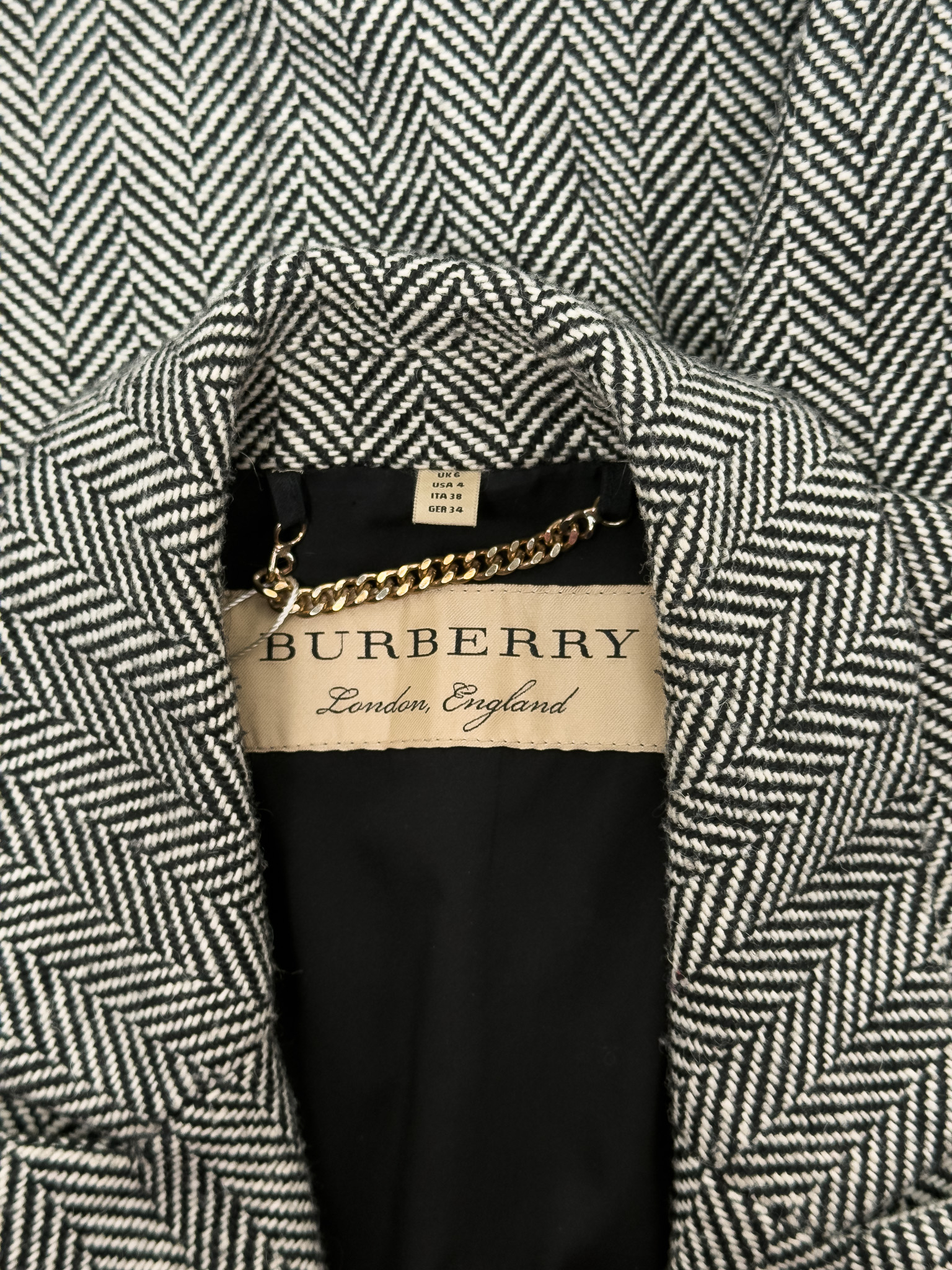 "Czarno-biały wełniany płaszcz w jodełkę, długość midi, dwurzędowy, zapinany na czarne guziki ozdobione złotym logo, dekolt w szpic, taliowany, dwie kryte kieszenie po bokach wykończone klapami w kształcie falban, rozporek, częściowy pasek w tylnej części, częściowa podszewka. Stan bardzo dobry. Rozmiar z metki IT 38. Skład: 100% bawełna. Wymiary: szerokość mierzona od pachy do pachy 49cm, długość całkowita 103cm."