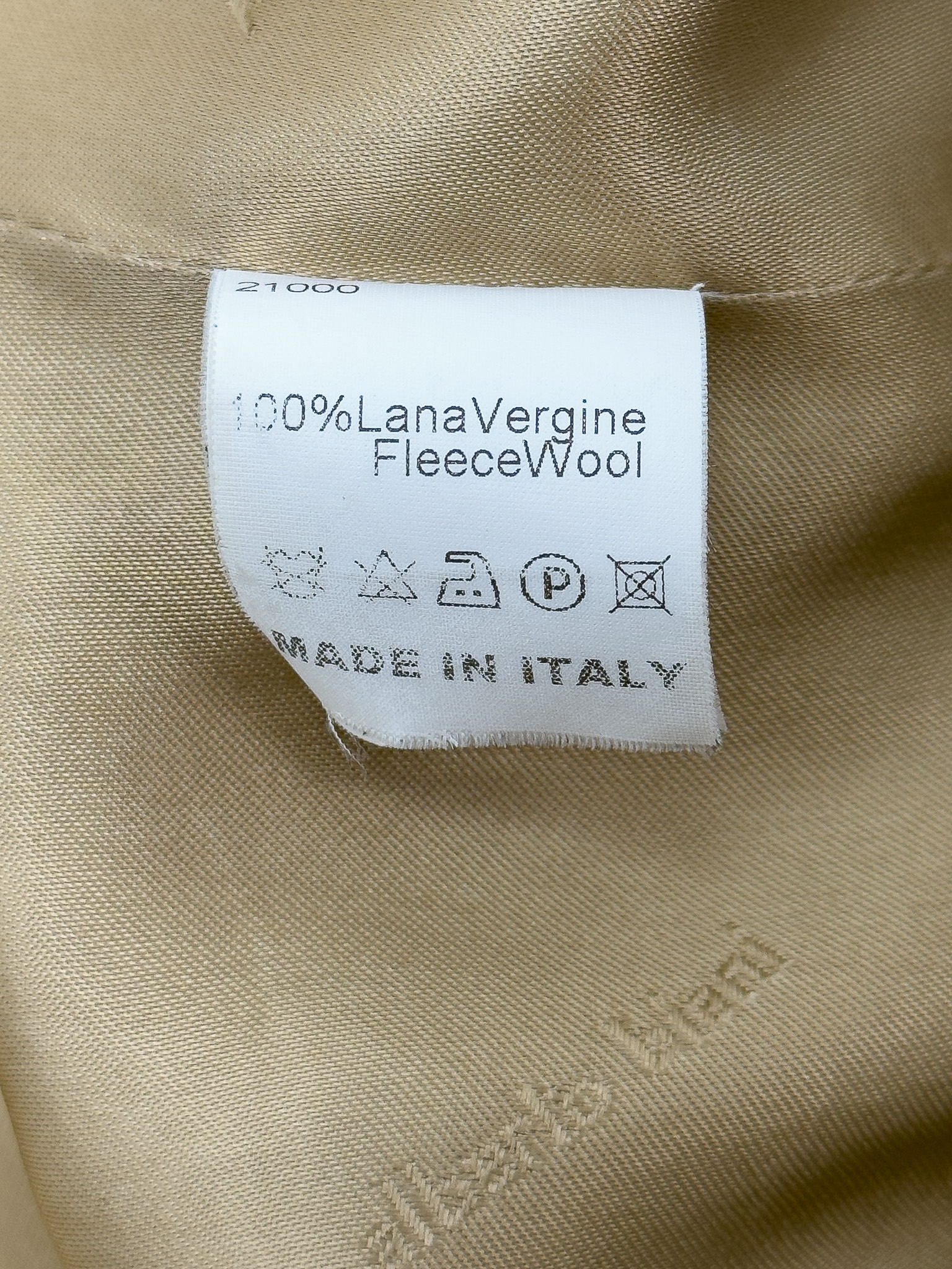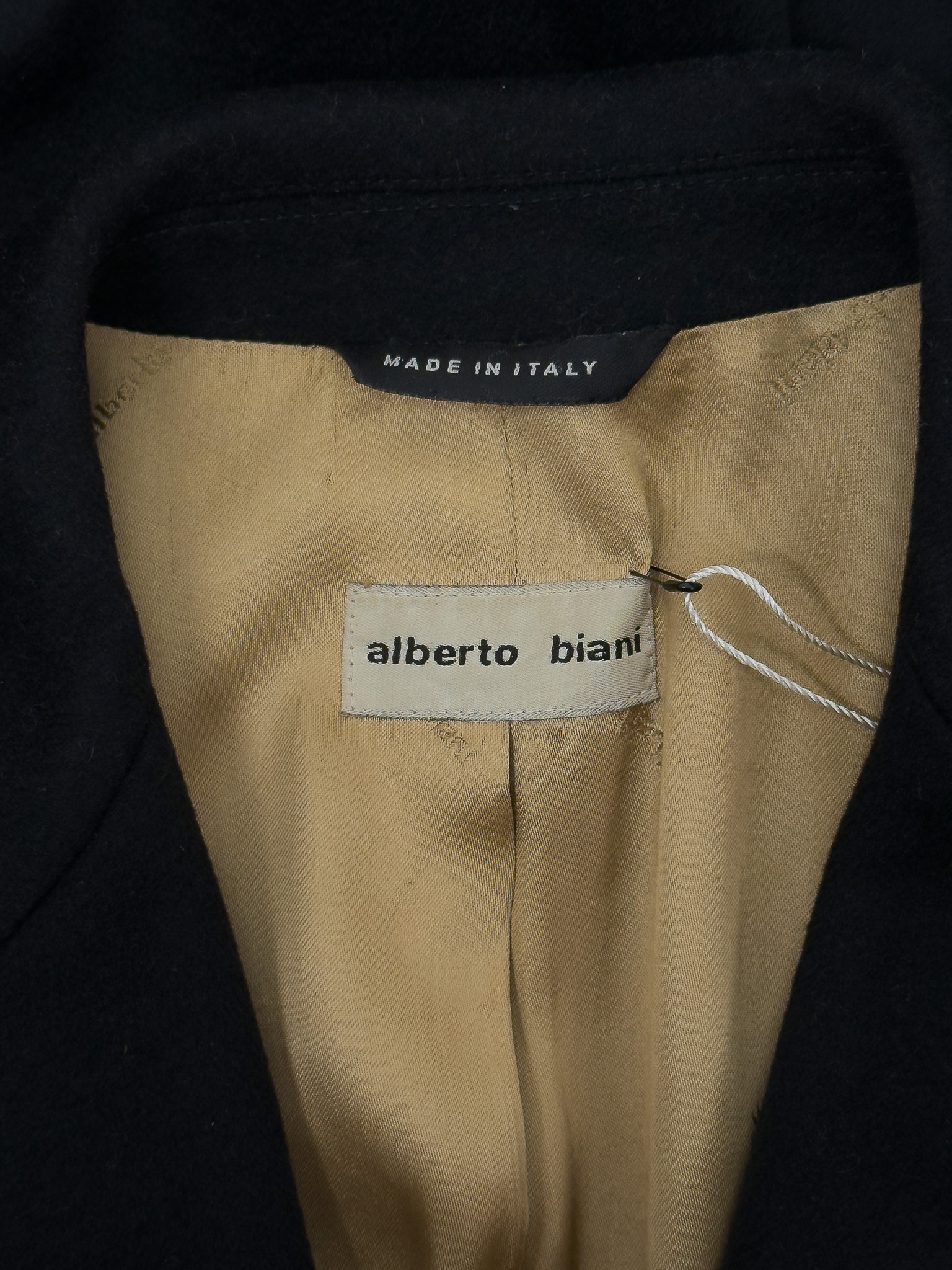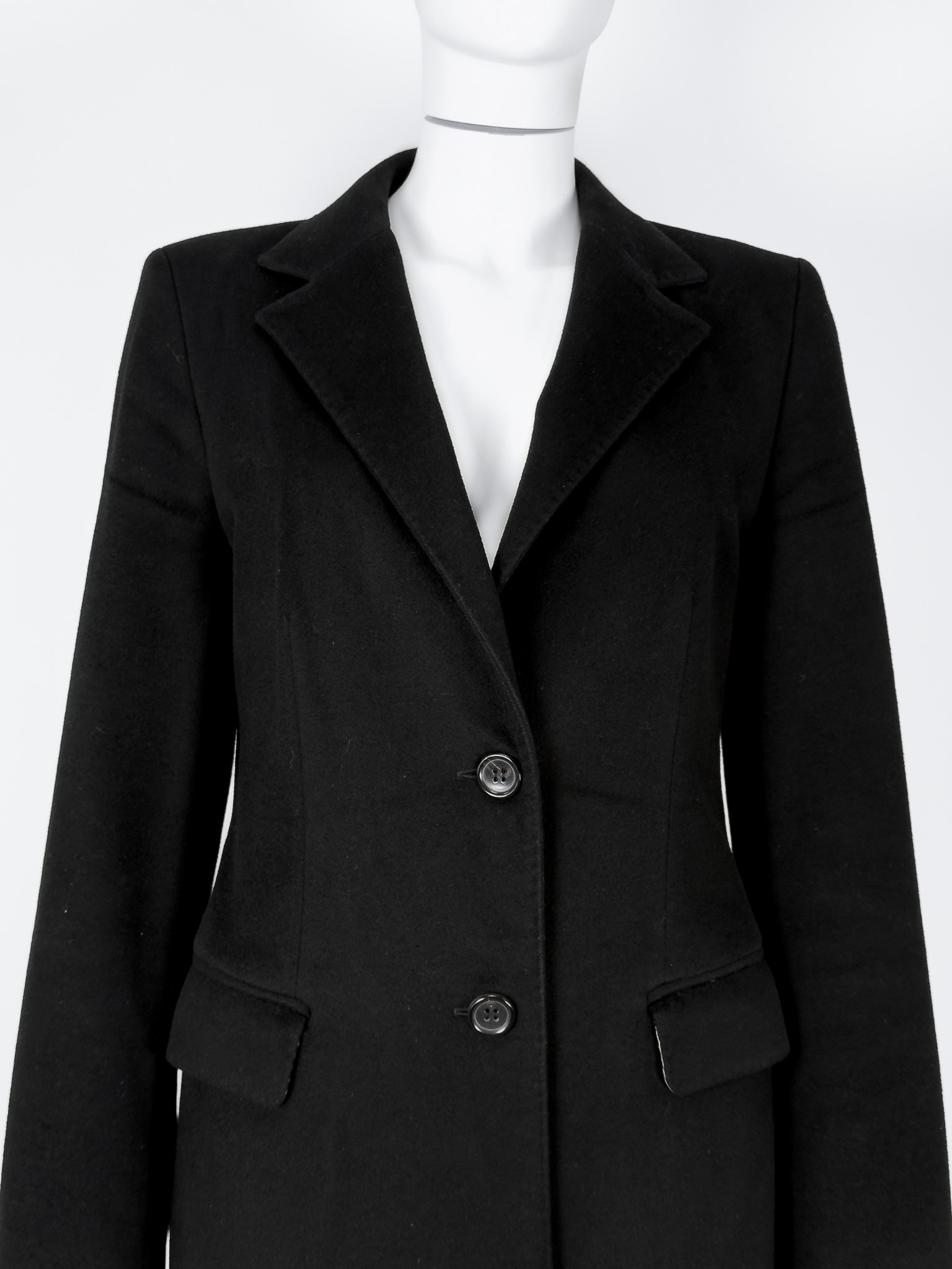 "Długi czarny płaszcz o prostym kroju, dwa rozporki z tyłu, zapinany na dwa guziki, dwie kieszenie po bokach, delikatne poduszki na rękawach. Płaszcz wykończony jest podszewką w beżowym kolorze. Wykonany z tkanin Loro Piana. Brak metki z rozmiarem. Rozmiarowo wypada jak S/M. Skład - 100 % wełna dziewicza; podszewka: 100% wiskoza; 100% cupro. Wymiary: szerokość mierzona od pachy do pachy 48cm, długość całkowita 111cm."