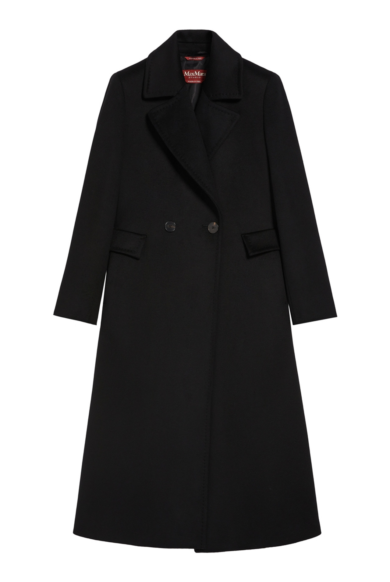 "Czarny wełniany dwurzędowy płaszcz, długość do połowy łydki, zapinany na dwa duże guziki, prosty krój, dwie zaszyte kieszenie z klapami po bokach, głęboki dekolt w serek, rozporek, kołnierz wykończony stębnowaniem, delikatne poduszki na ramionach, logowana podszewka. Stan nowy z metką. Rozmiar z metki IT 44. Skład: 100% wełna dziewicza; podszewka: 100% wiskoza. Wymiary: szerokość mierzona do pachy do pachy 50cm, długość całkowita 119cm."