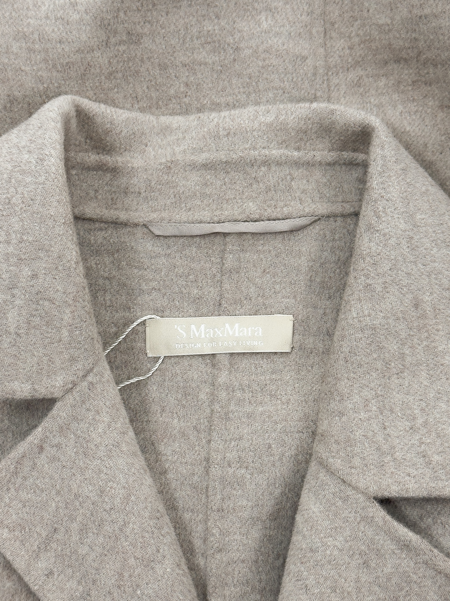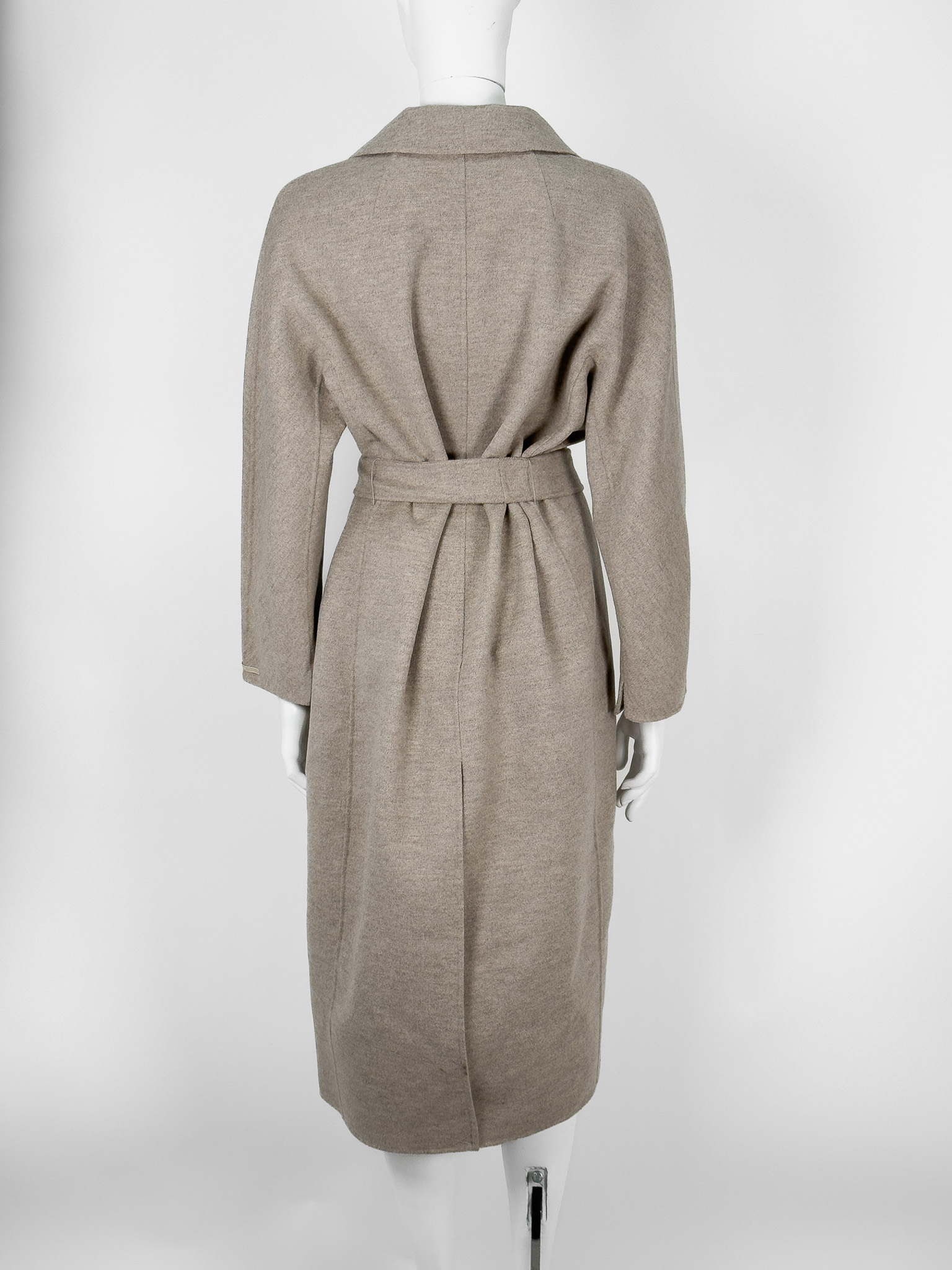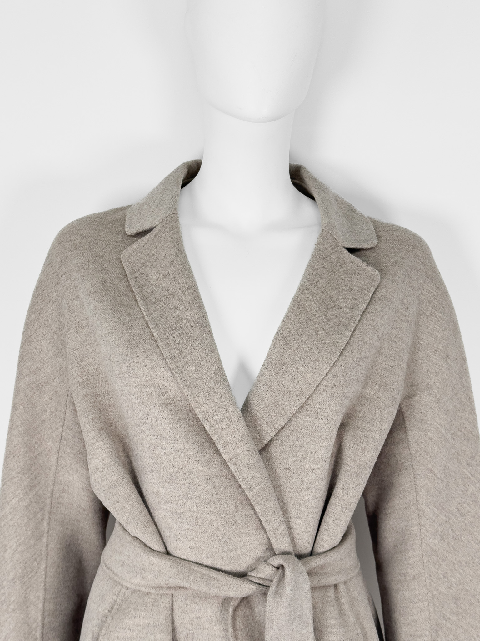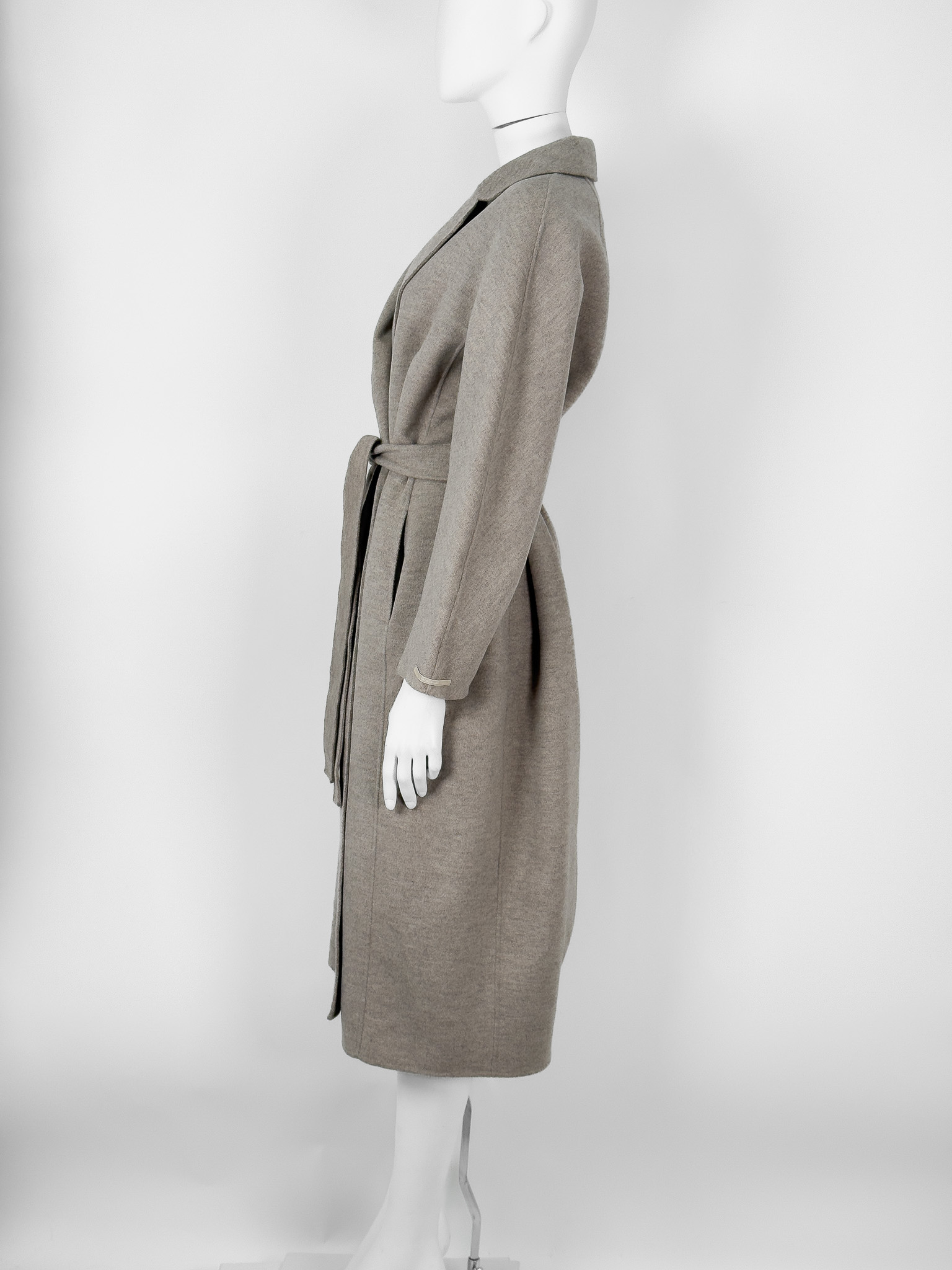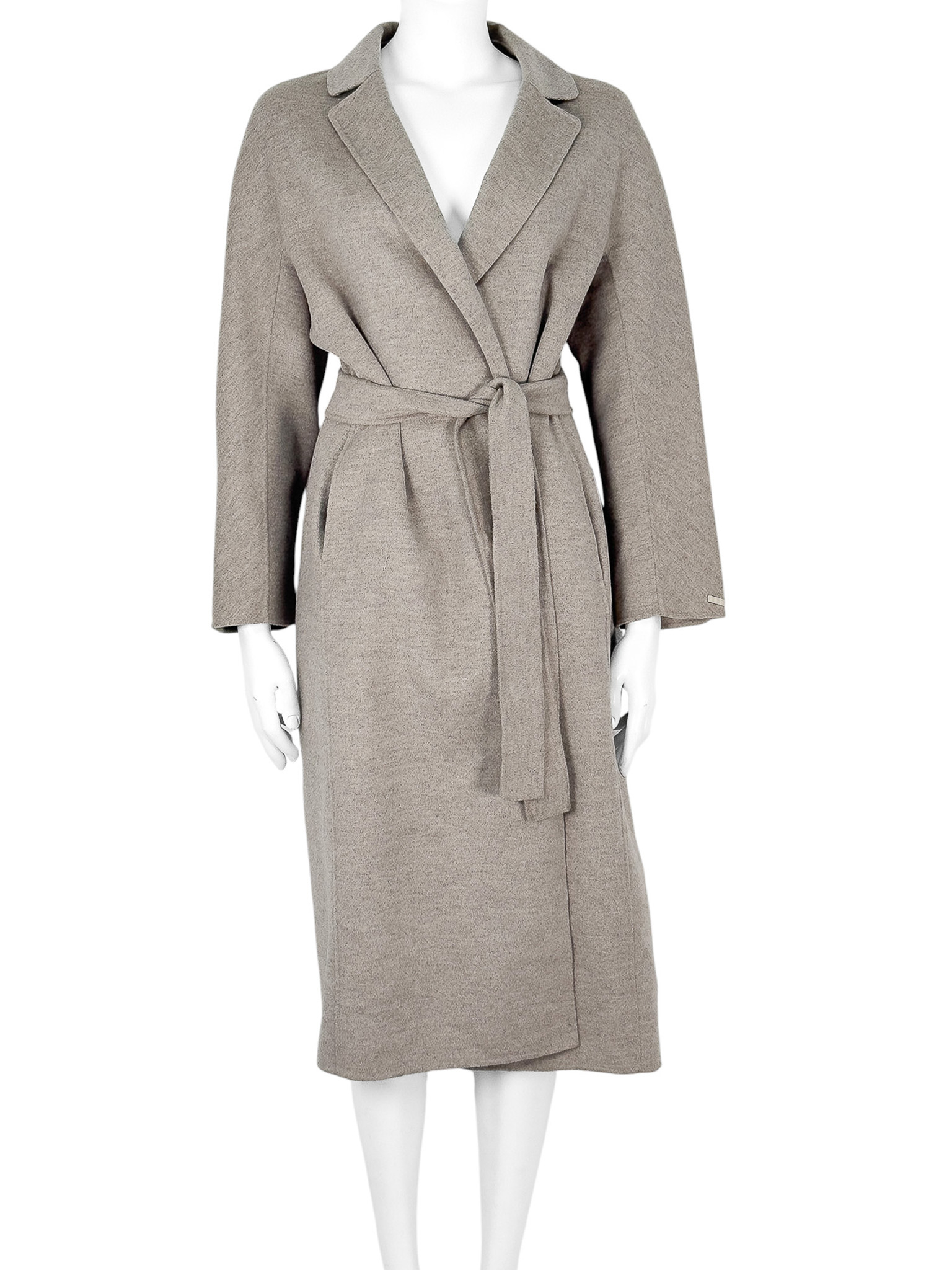 "Cienki wełniany płaszcz w kolorze szarobeżowym, bez poszewki, wiązany paskiem w talii, dwie kryte kieszenie w bocznej części. Stan bardzo dobry. Rozmiar z metki IT 46. Skład: 82% wełna, 18% wełna z królika angorskiego. Wymiary: szerokość mierzona od pachy do pachy 57cm, długość całkowita 115cm."