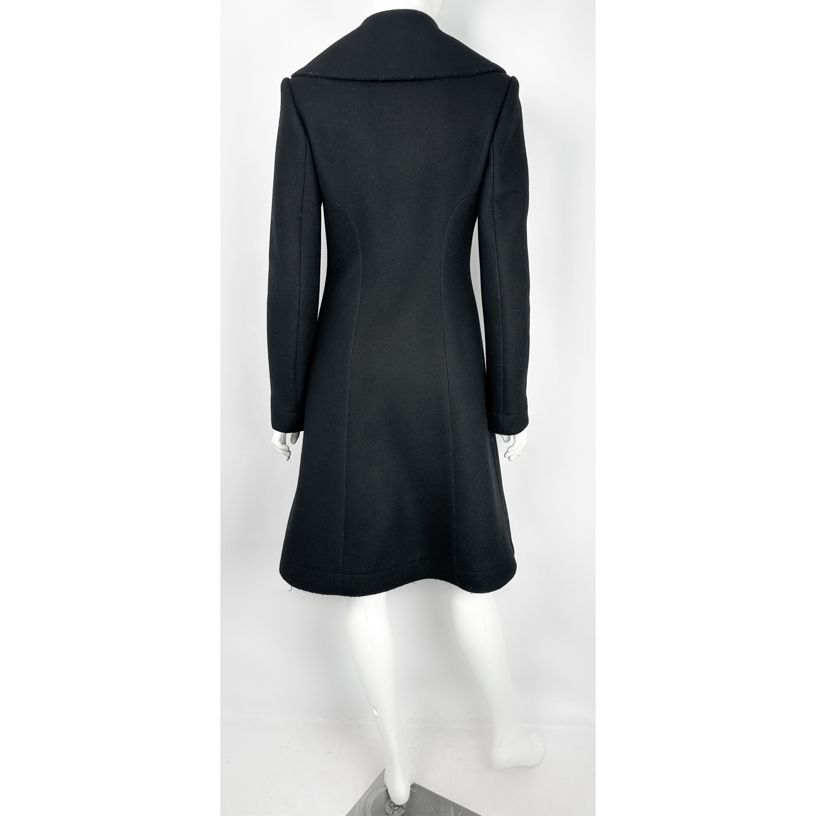 "Czarny wełniany płaszcz, dwurzędowy, zaokrąglony kołnierz, taliowany, delikatnie rozkloszowany dół, proste rękawy, dekoracyjne przeszycia. Rozmiar z metki FR 40. Skład: 90% wełna, 10% nylon; podszewka: 100% poliester. Wymiary: szerokość mierzona od pachy do pachy 43cm, długość całkowita 99 cm."