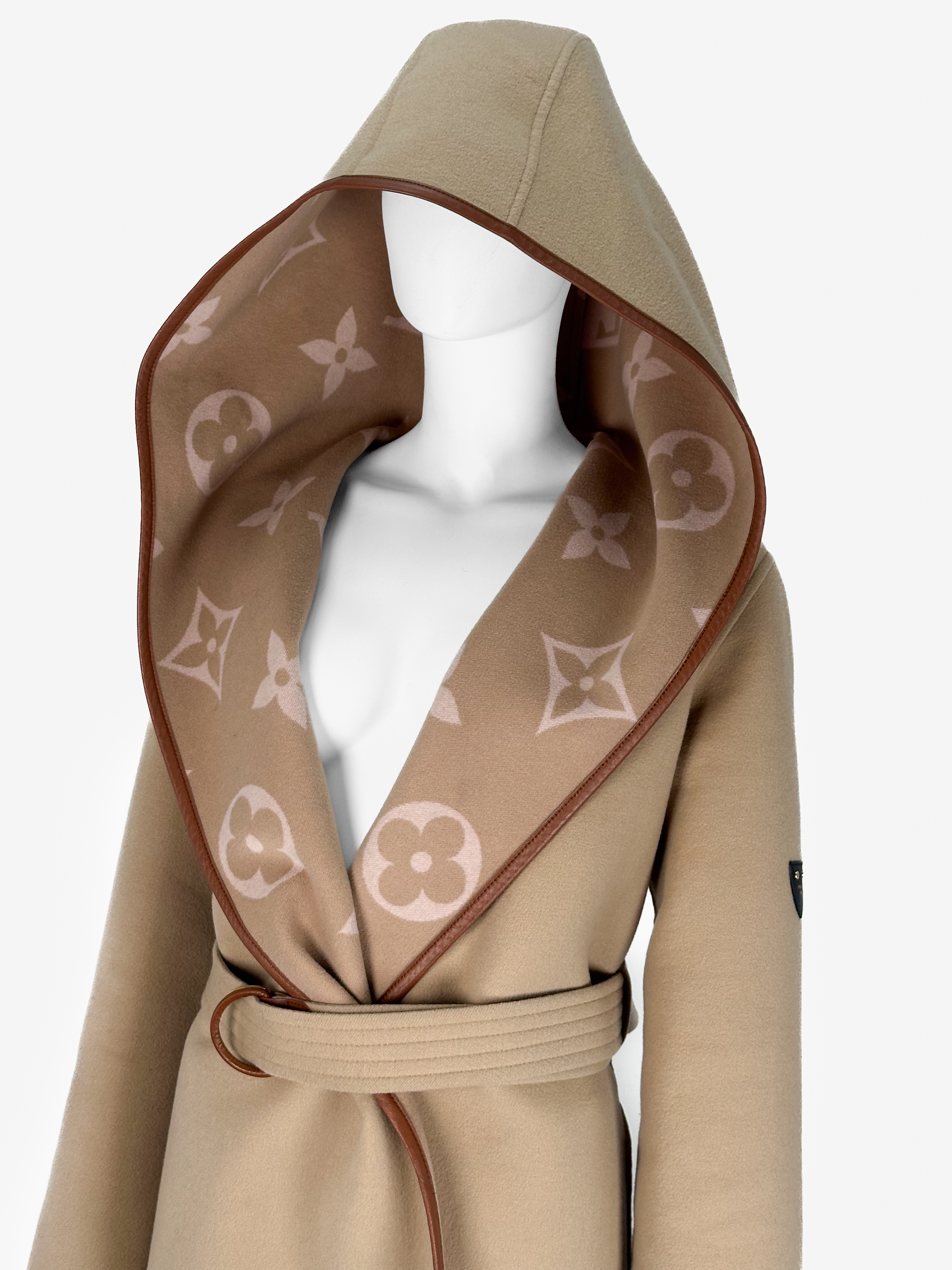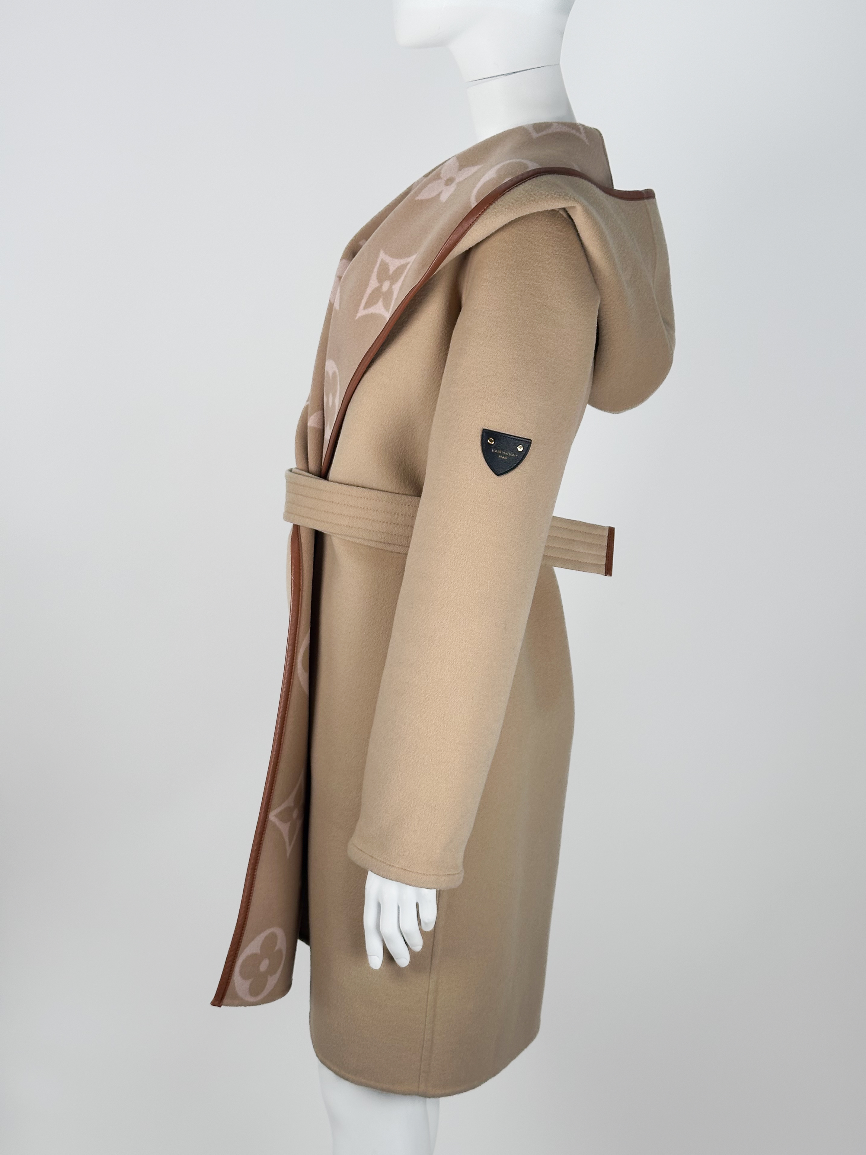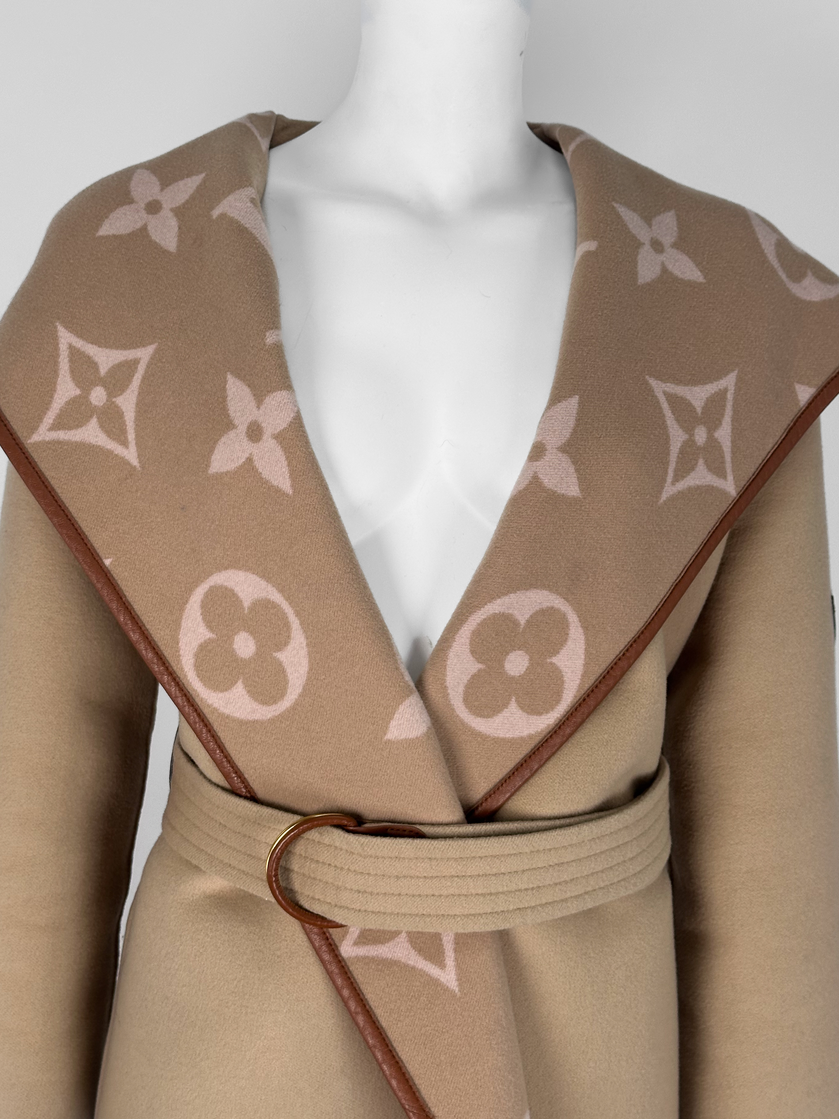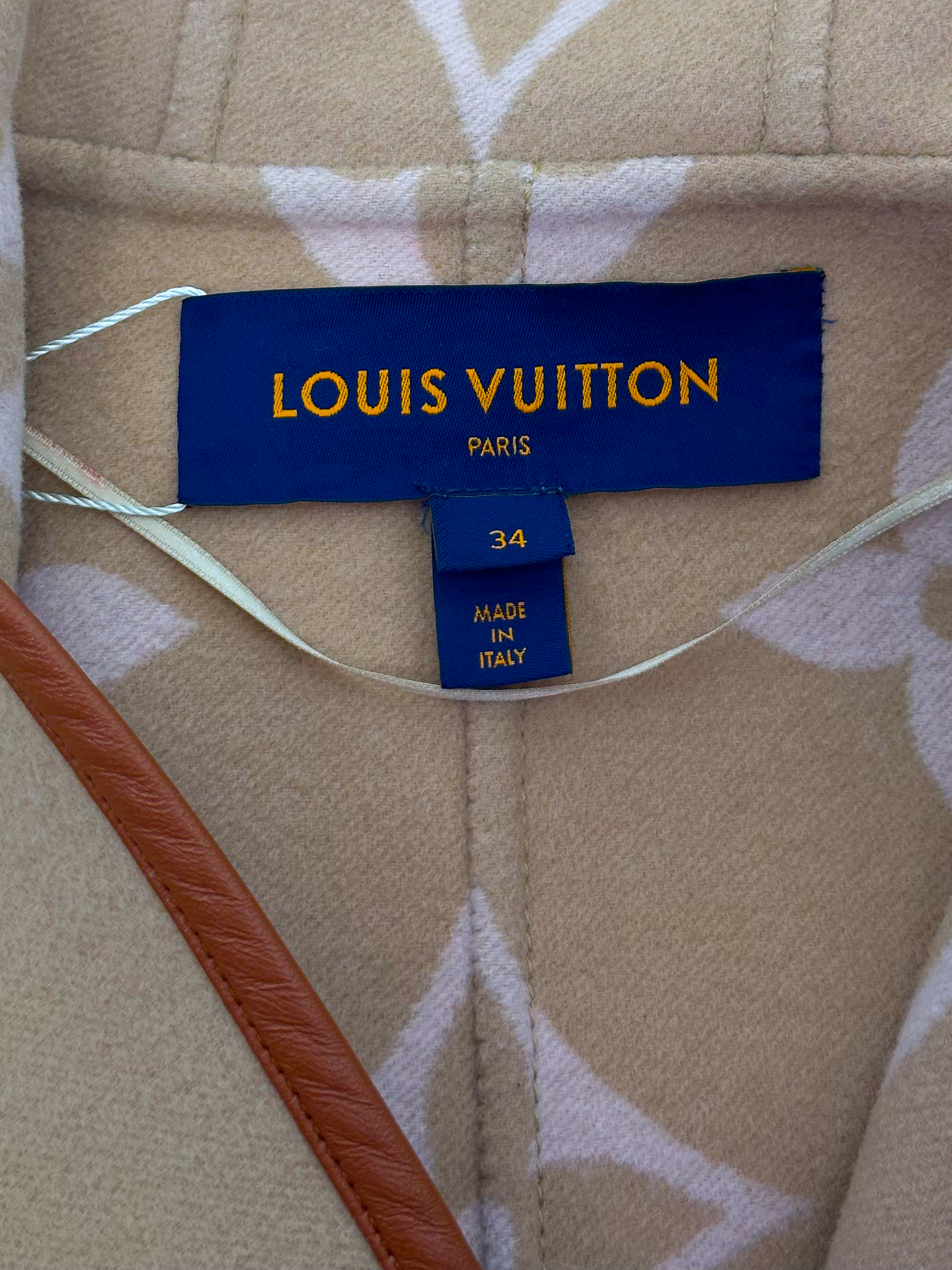 "Camelowy wełniany płaszcz, logowanie od wewnętrznej strony, skórzane camelowe wykończenia. Skład: 99% wełna, 1% jedwab. Rozmiar z metki 34. Dwie dziury od wewnętrznej strony.