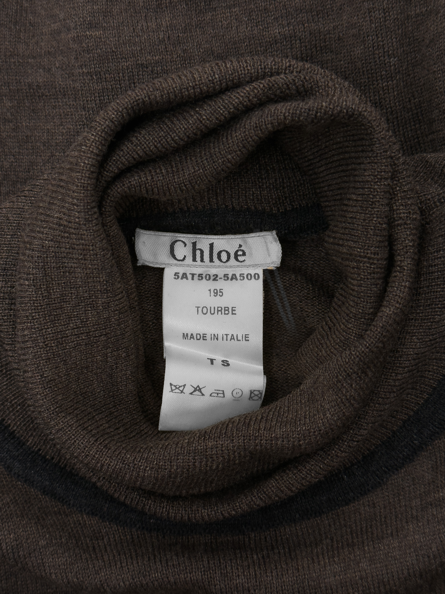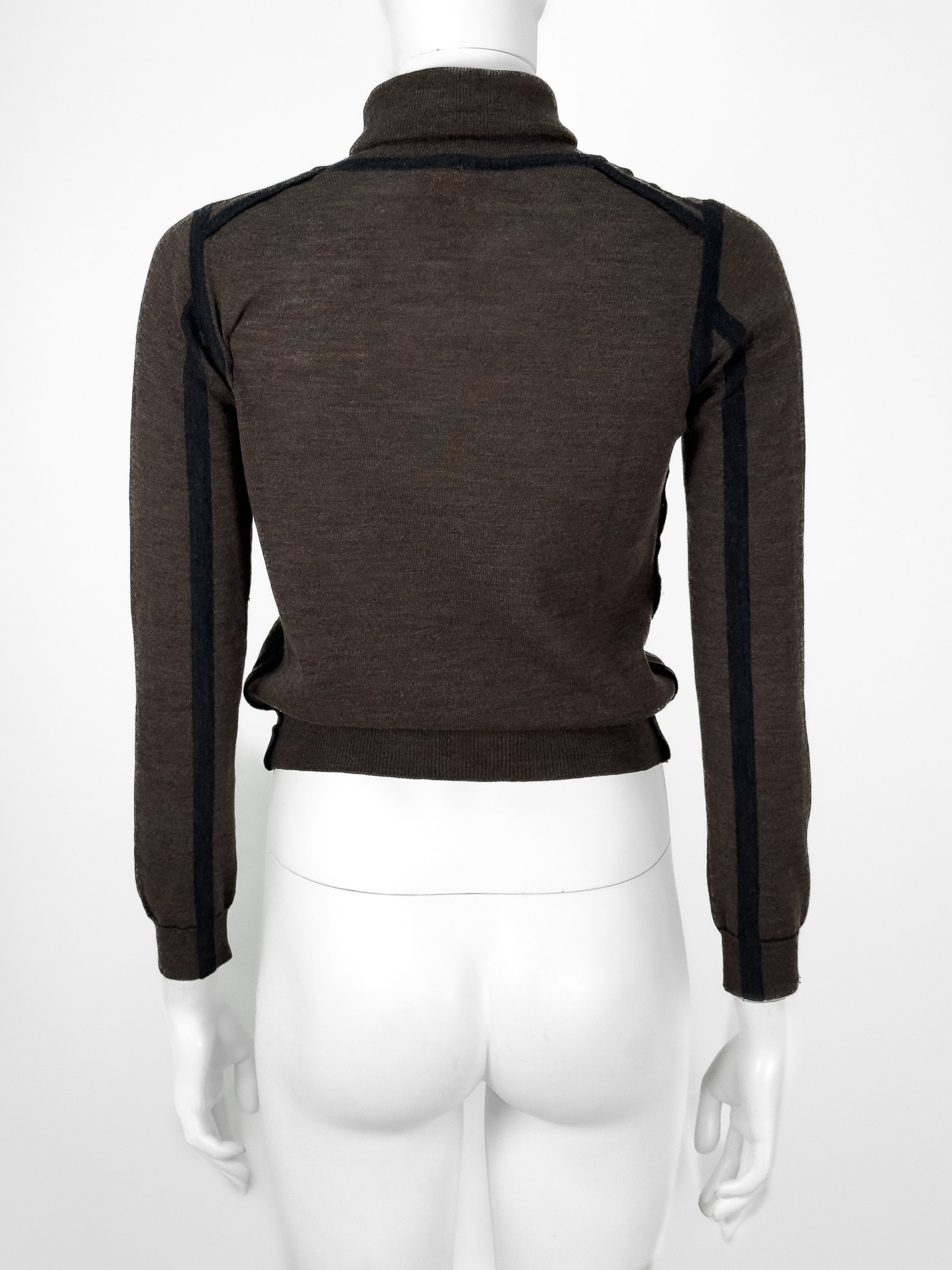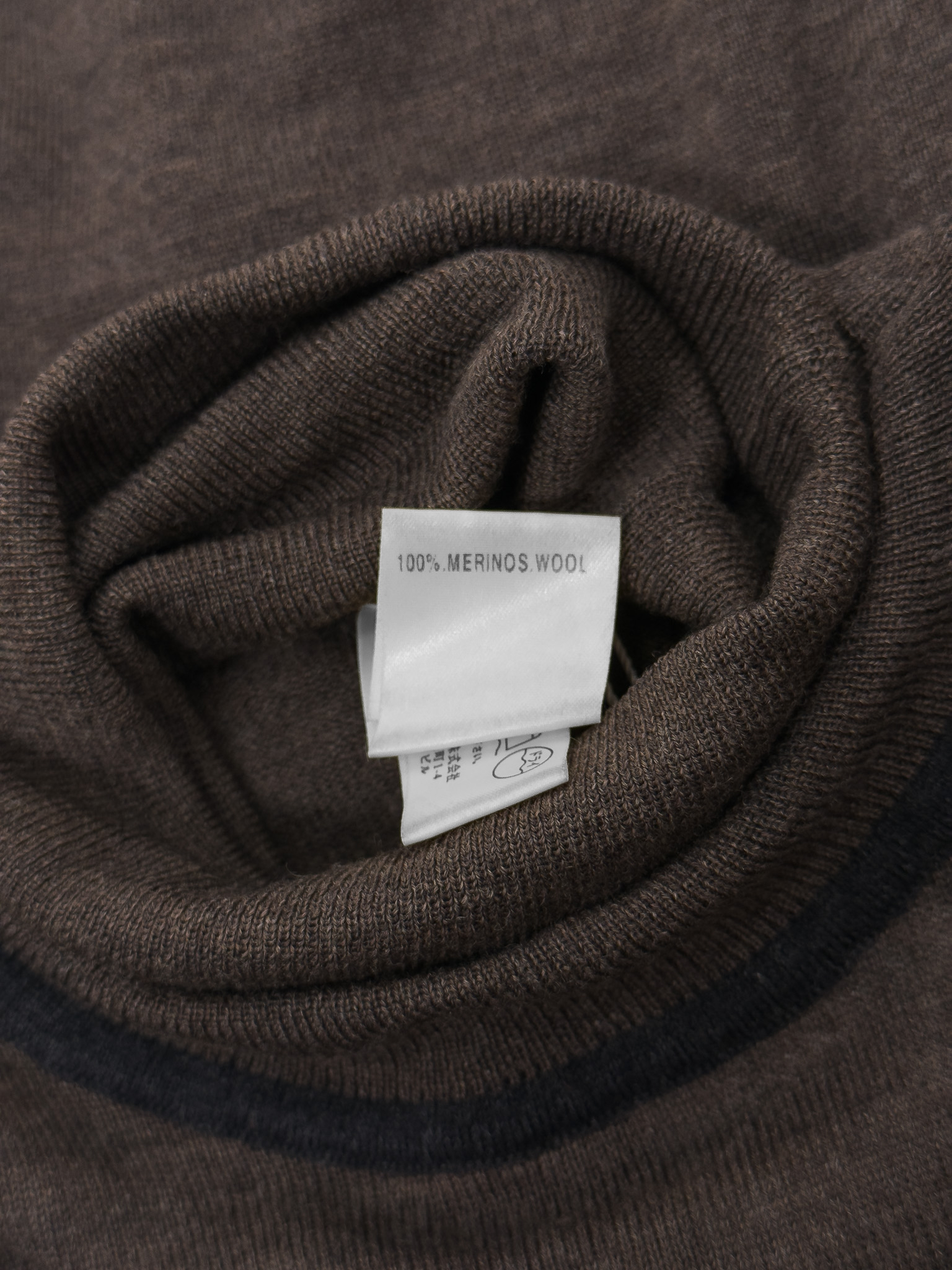 "Brązowy wełniany sweter z golfem ozdobiony czarną lamówką, dopasowany krój, wykończony ściągaczem, dwie kieszonki w dolnej części. Stan bardzo dobry. Rozmiar z metki S. Skład: 100% wełna merynosa. Wymiary: szerokość mierzona od pachy do pachy 46cm, długość całkowita 49cm."