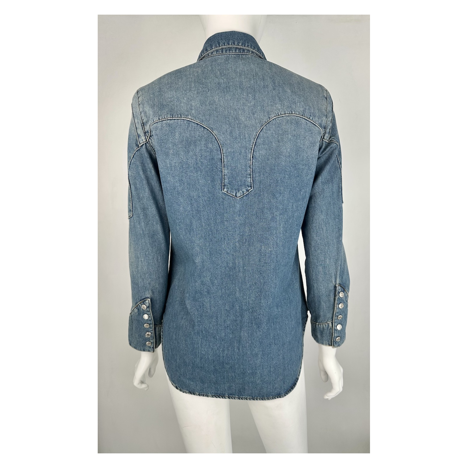 "jeansowa koszula, zapinana z przodu na srebrne logowane zatrzaski, z przeszyciami, długi rękaw, bufki na ramionach, nowa z metkami. Rozmiar XS. Skład: 100% bawełna. Wymiary: długość rękawa od ramienia 55 cm, długość od ramienia 62 cm, szerokość pod pachami 46 cm."