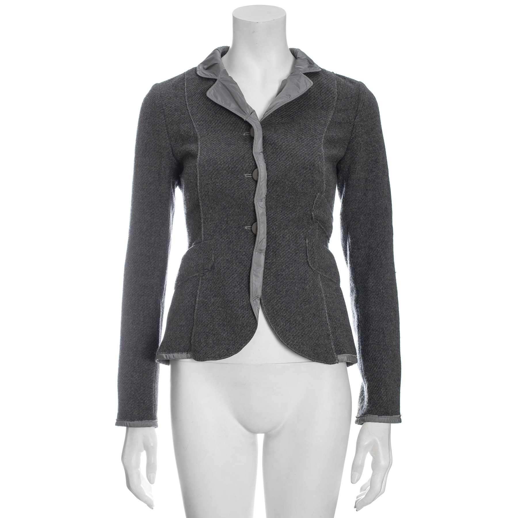 "szary żakiet melanżowy, z poliestrową szarą klapą, zapinany na trzy guziczki, rozmiar XS skład 90% wełna 9% kaszmir 1% elastan"