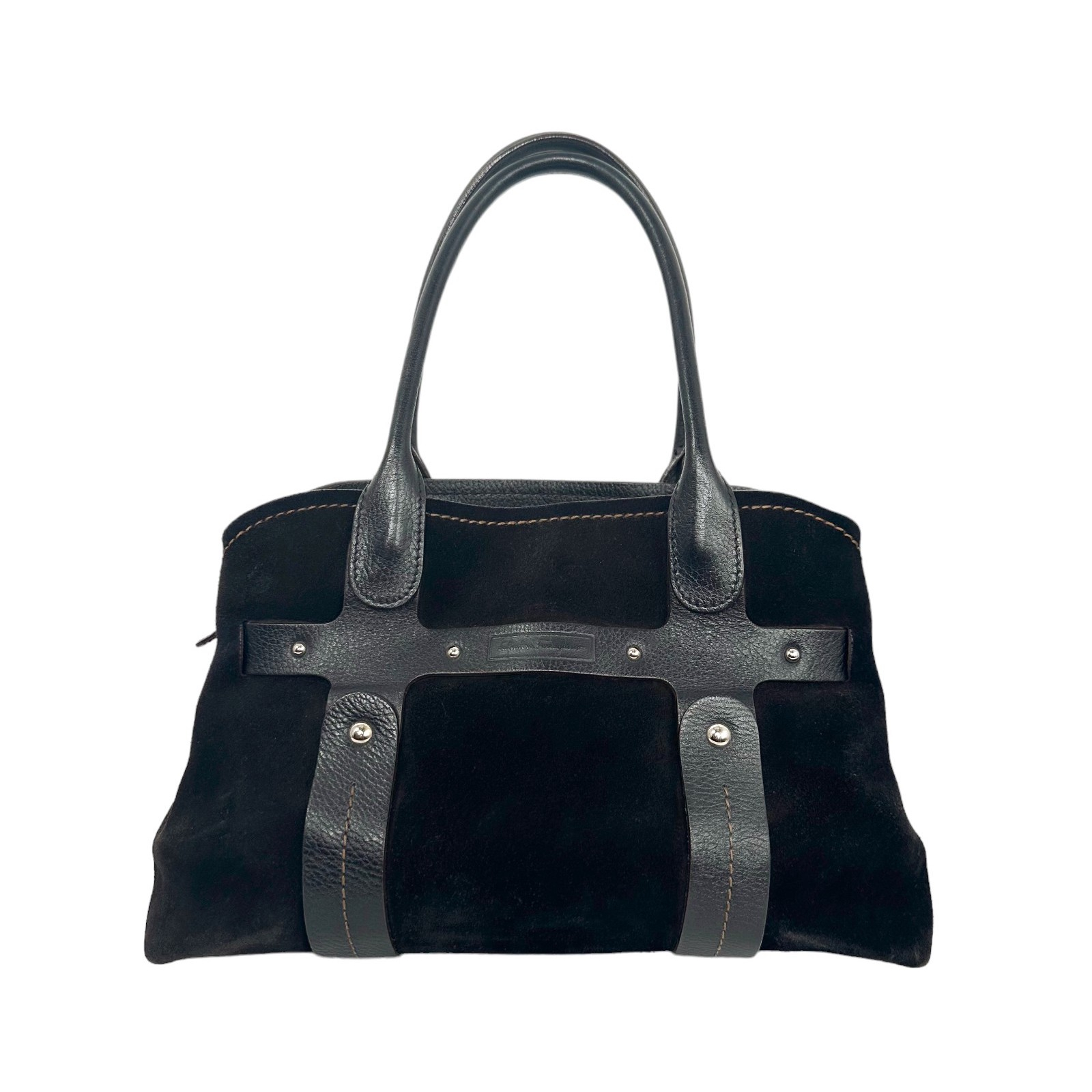 "Brązowo-czarna zamszowa torebka, ozdobiona skórzanymi wstawkami, dwa uchwyty do ręki, brązowe przeszycia, wytłaczane logo marki na przodzie, srebrne okucia, trzy komory wewnątrz, jedna zapinana na srebrny logowany suwak, brązowe logowane wnętrze. Stan dobry, przetarte rogi torebki. Wymiary: szerokość 37cm, wysokość 21cm, głębokość 20cm."