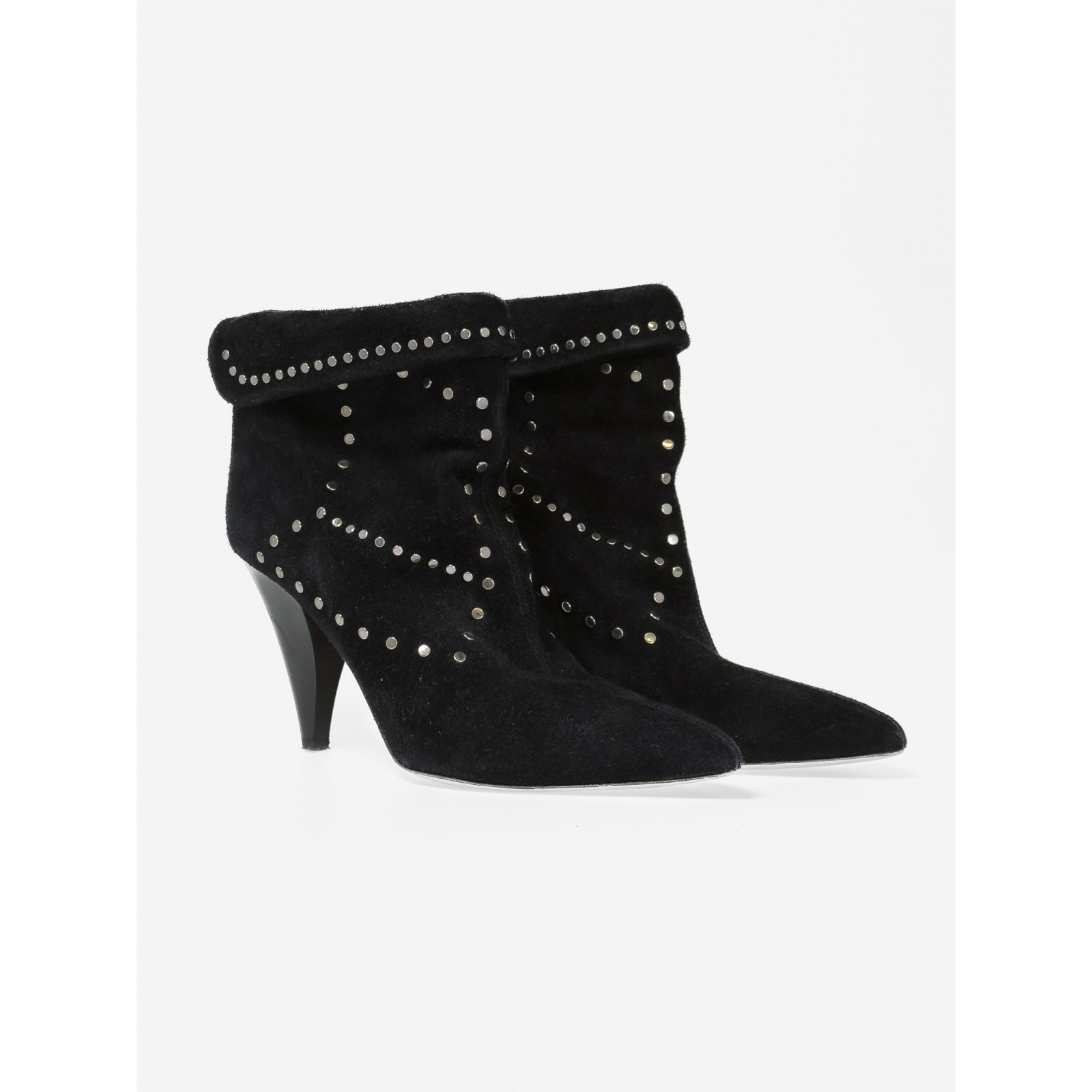 "Czarne zamszowe botki na obcasie ozdobione srebrnymi okrągłymi dżetami, obcas stożek, noski w szpic, delikatnie odwijana cholewka, wsuwane, cieliste skórzane wnętrze, używane. Stan dobry, posiadają przetarcia na flekach oraz noskach, zadrapania na obcasach. Rozmiar 37."