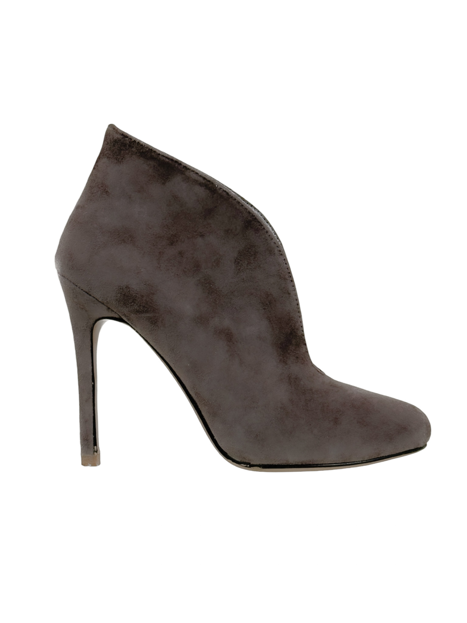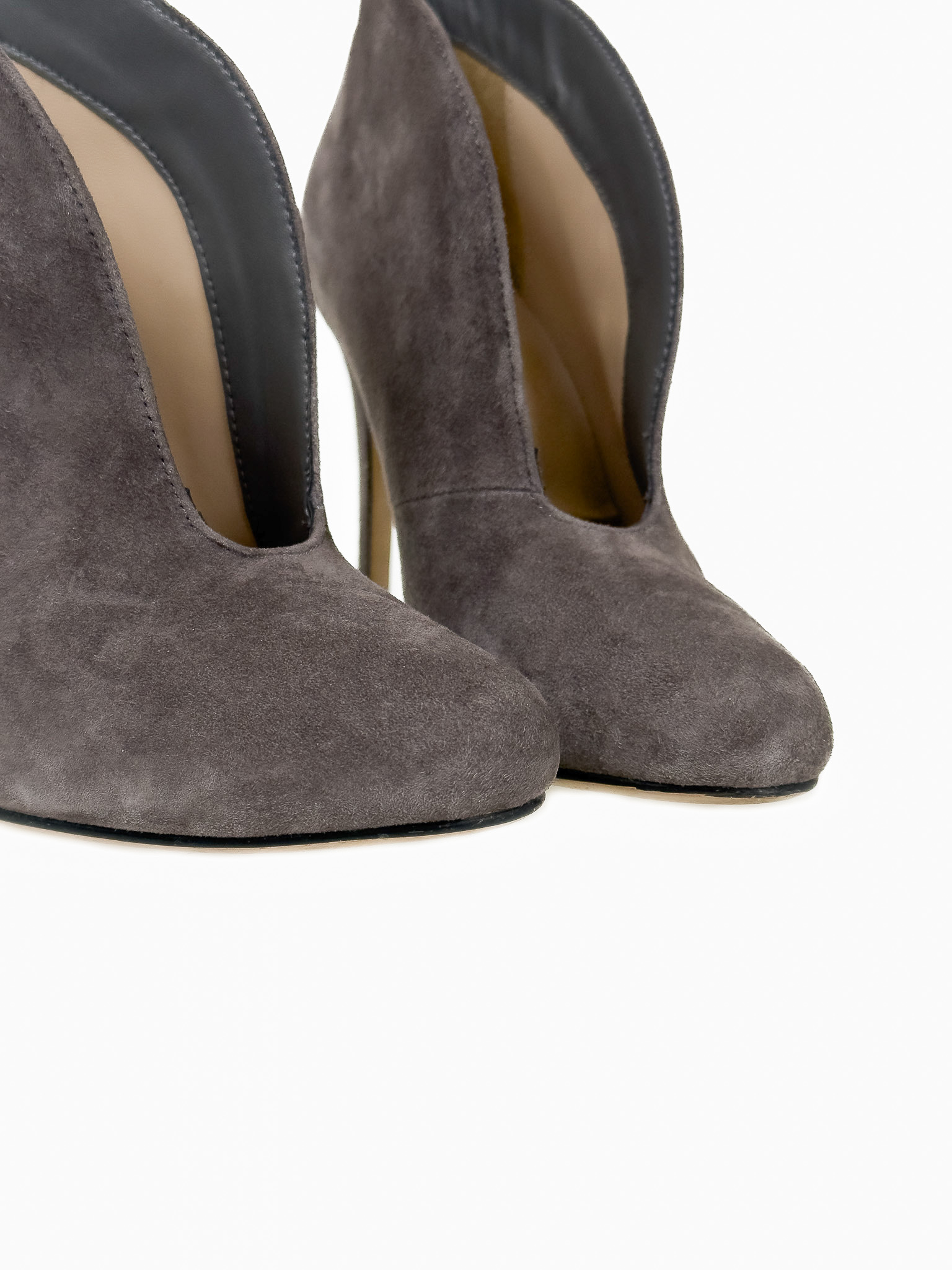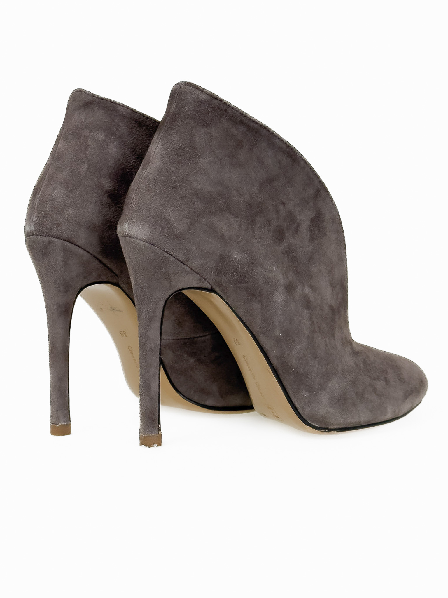 "Szare zamszowe botki na obcasie, z charakterystycznym dla marki wycięciem w centralnej części, zaokrąglone noski, cielista skórzana wkładka. Stan: bardzo dobry, posiadają przetarcia na flekach oraz podeszwie. Rozmiar 36."