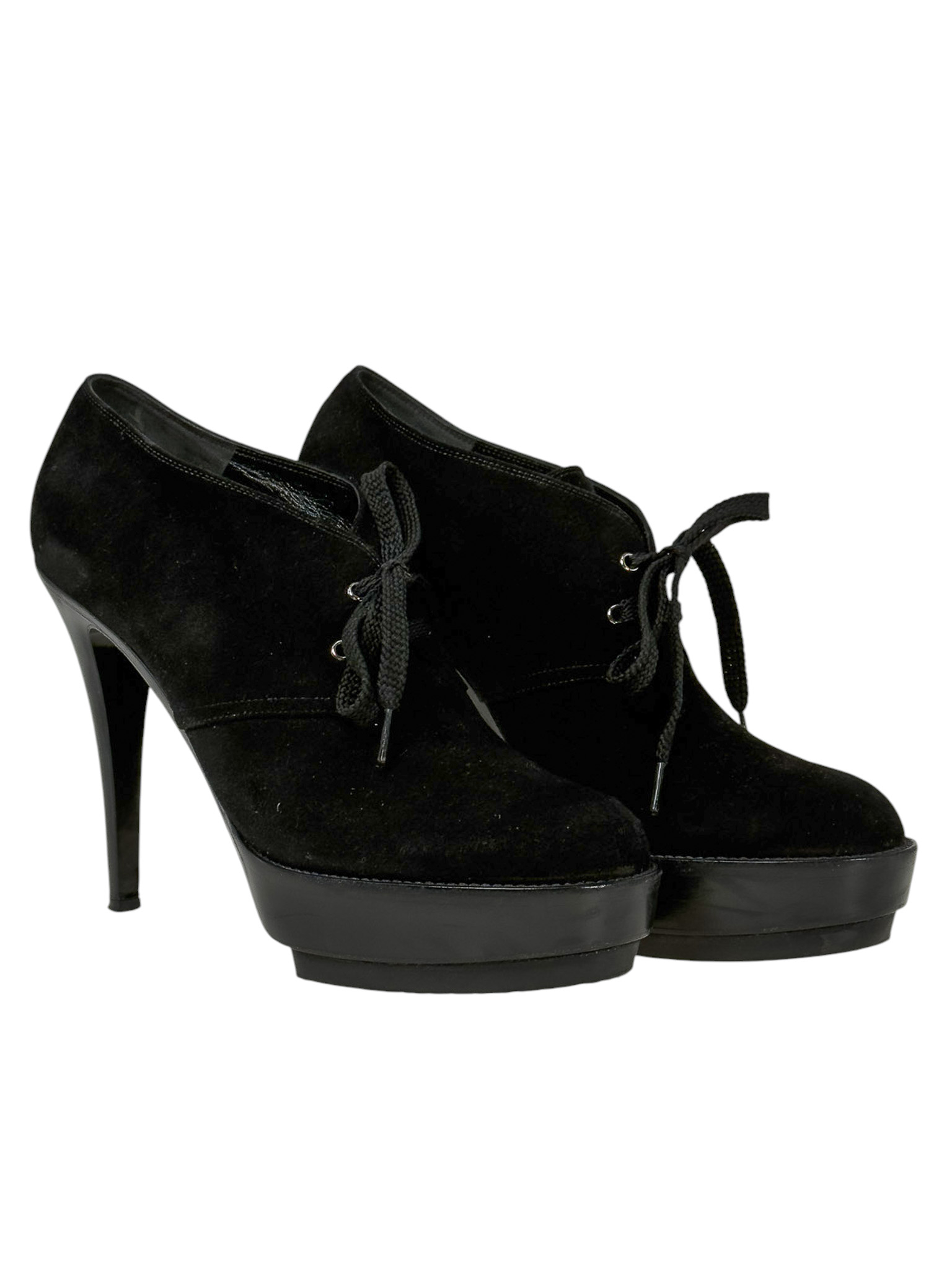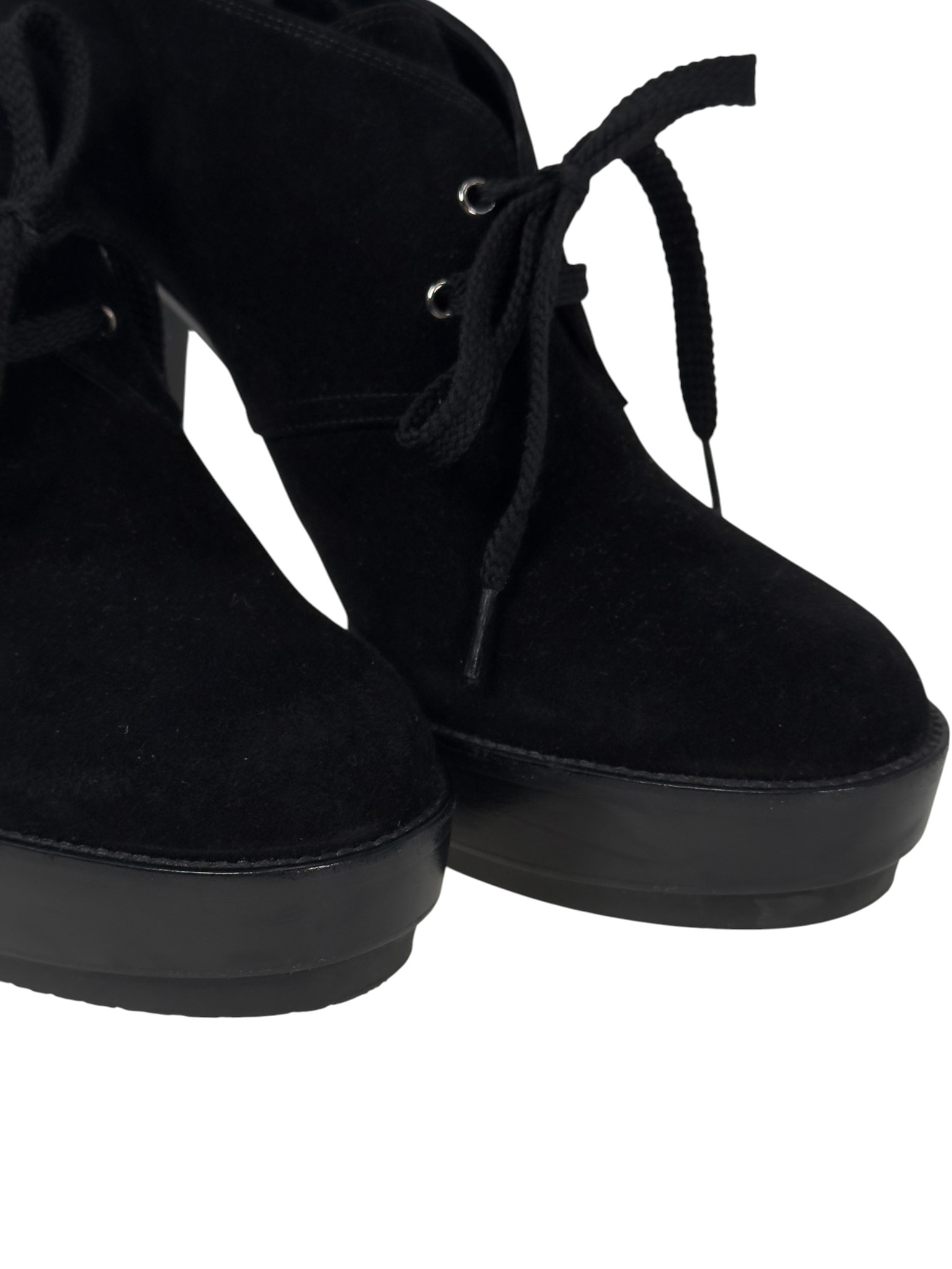 "Czarne zamszowe botki na obcasie oraz platformie, zaokrąglone noski, sznurowane, czarna skórzana wkładka, w zestawie z workami przeciwkurzowymi. Stan: bardzo dobry, posiadają widoczne przetarcia na flekach. Rozmiar 40,5."